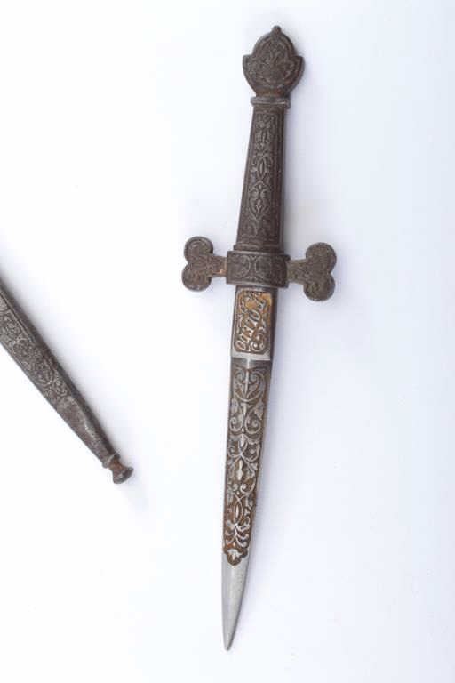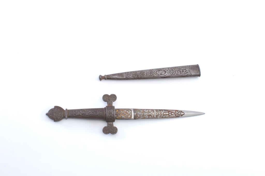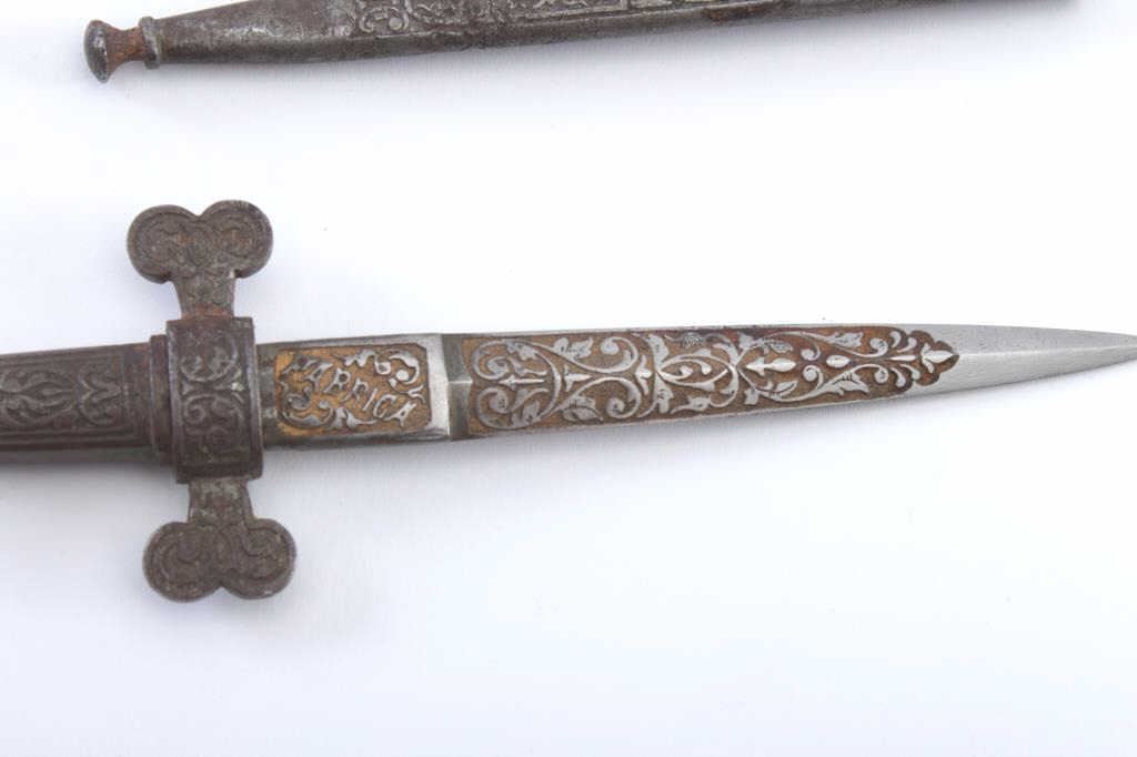 Armoral style dagger with fancy etching made in 19th century marked "Fabrica del Toledo". Measures 7 1/2" overall with a 4 1/2" blade. Traces of gold wash. Very good quality. Est.: $250-$500