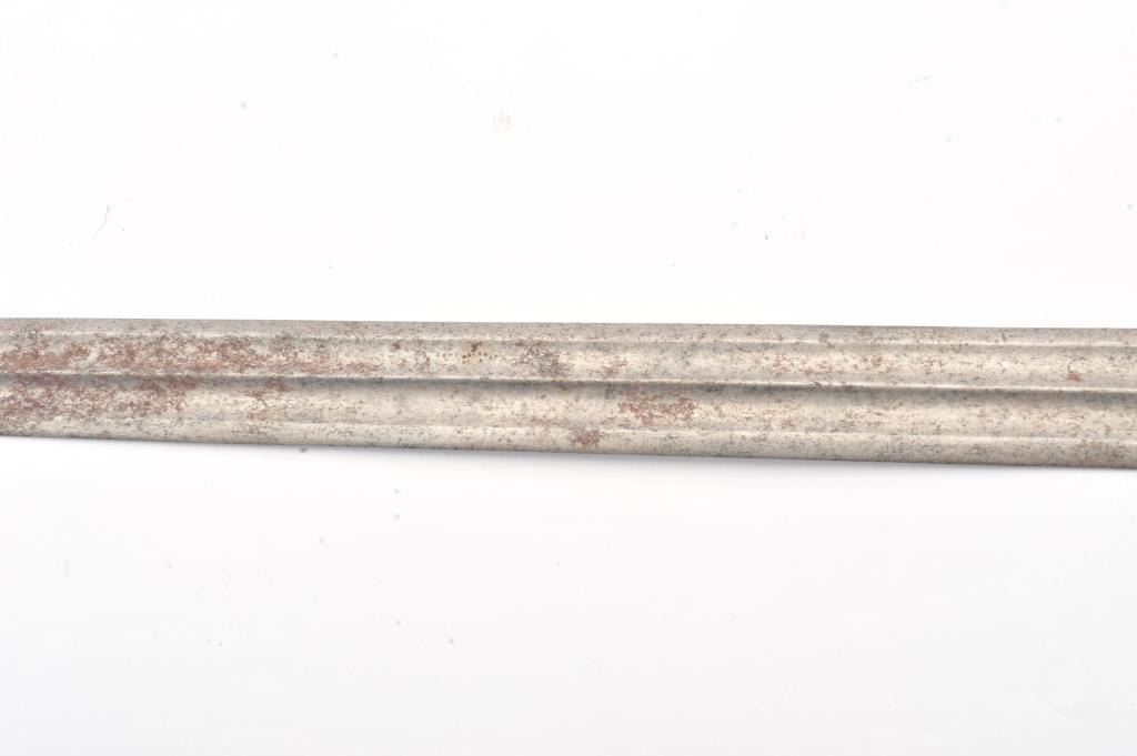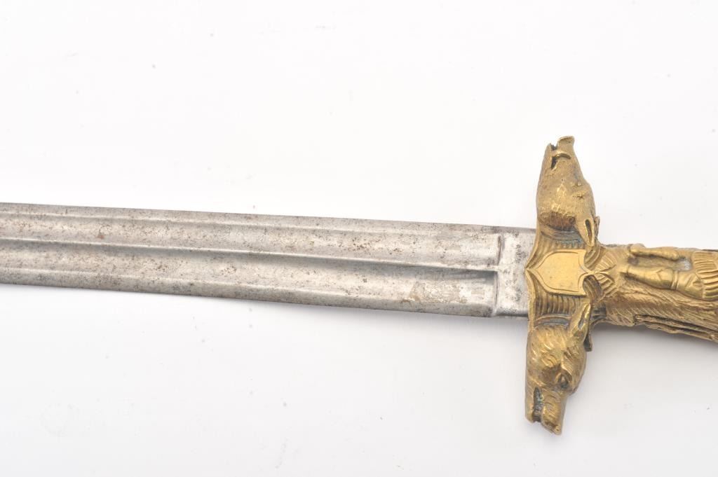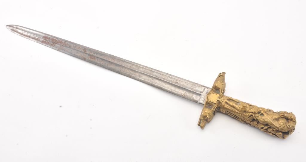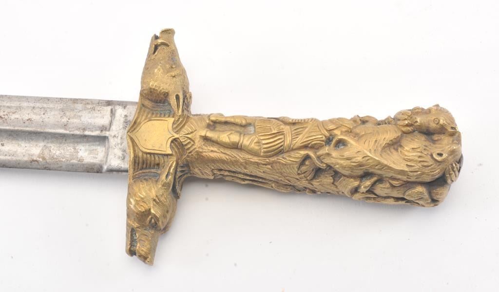 Ornate cast and chased bronze or brass hilted hunting sword with fluted bright steel blade. Measures 24 3/4" overall with a 19 1/2" blade. Very good plus condition. Very nice quality to hilt. Early to Mid-19thcentury. Est.: $250-$500