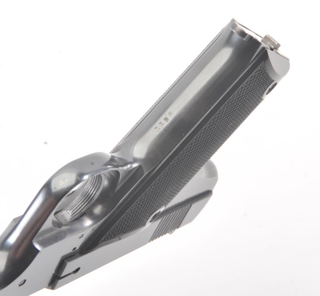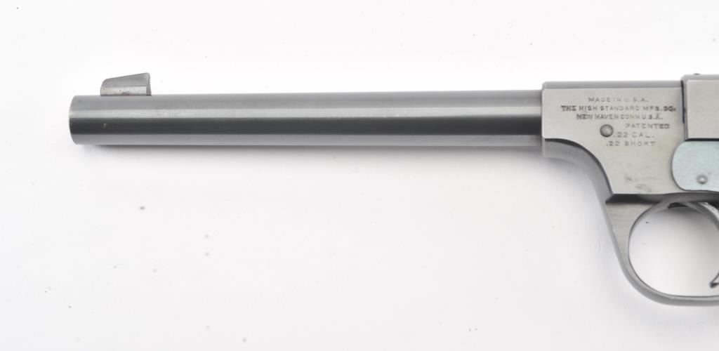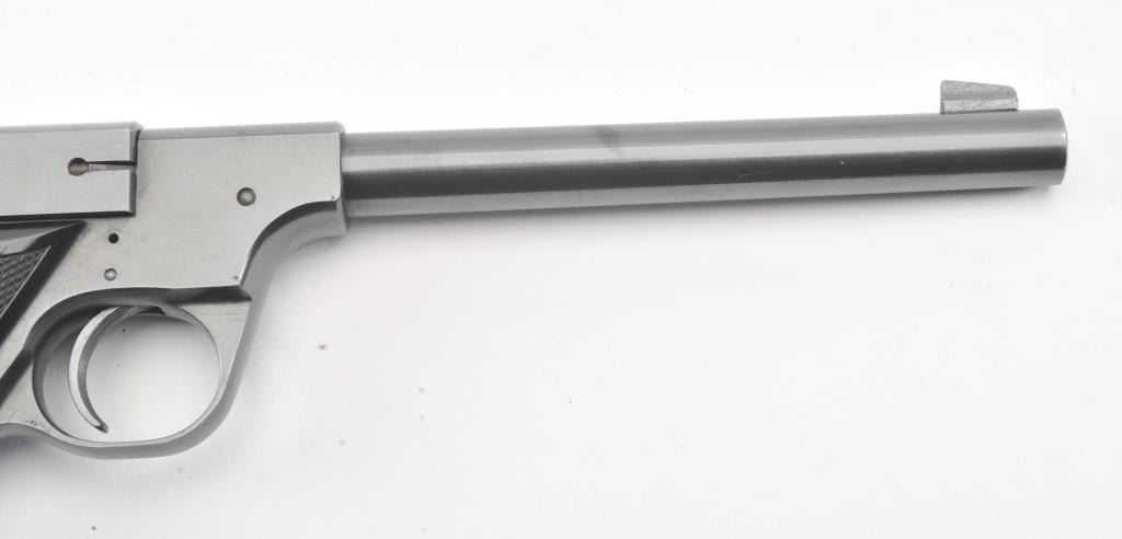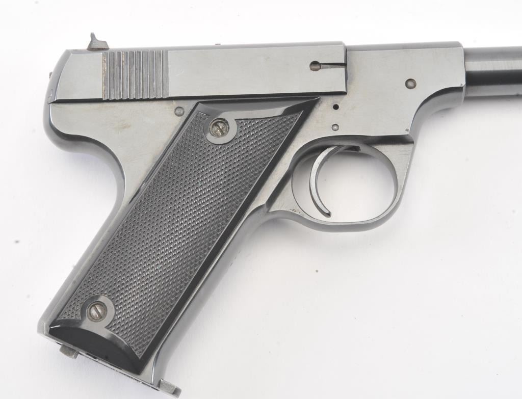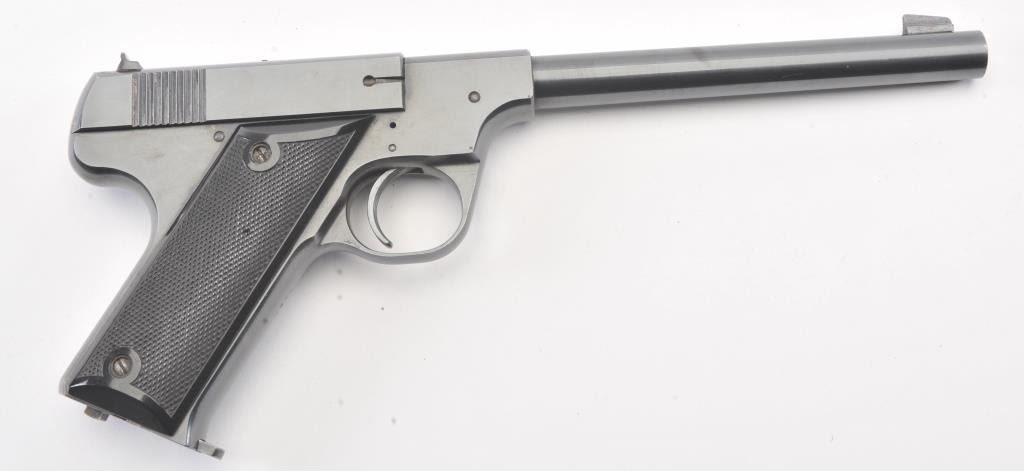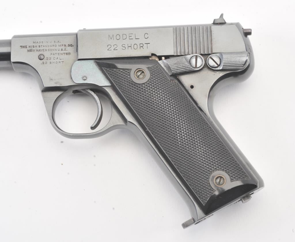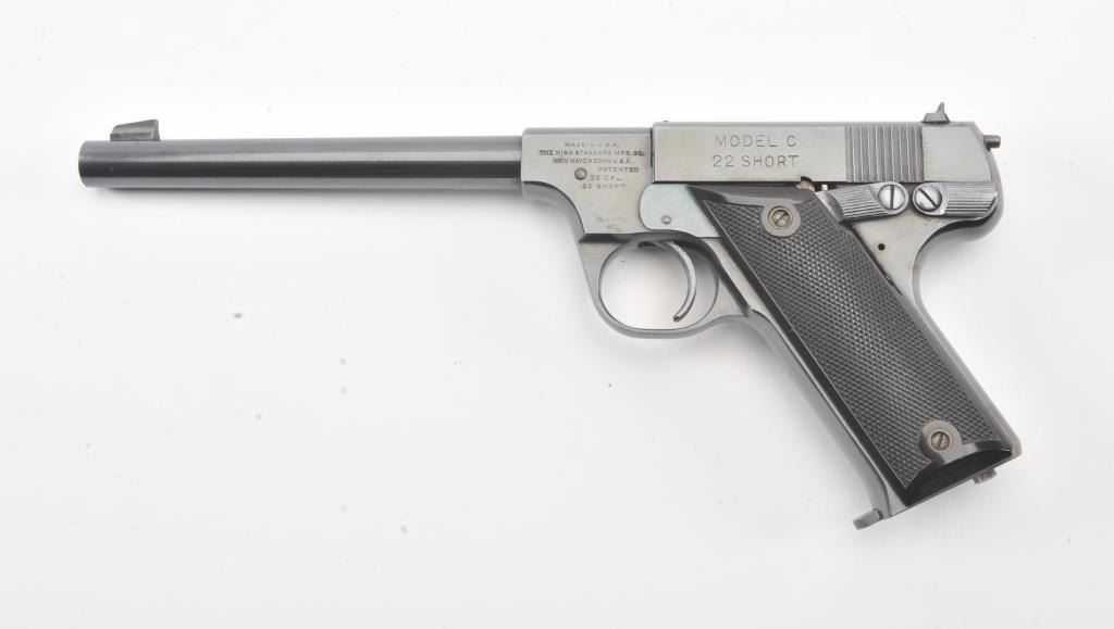High Standard Model C semi-auto pistol, #1156, .22 short cal., 6 3/4” barrel, blued finish, checkered black plastic grips. This gun is in overall fine to excellent condition showing the majority of its original factory finish with only slight high point wear, fine bore, action is crisp, fine grips; very low serial number; an unusual Model that should be further researched. One correct mag. (C&R/PPT) Est.: $300-600