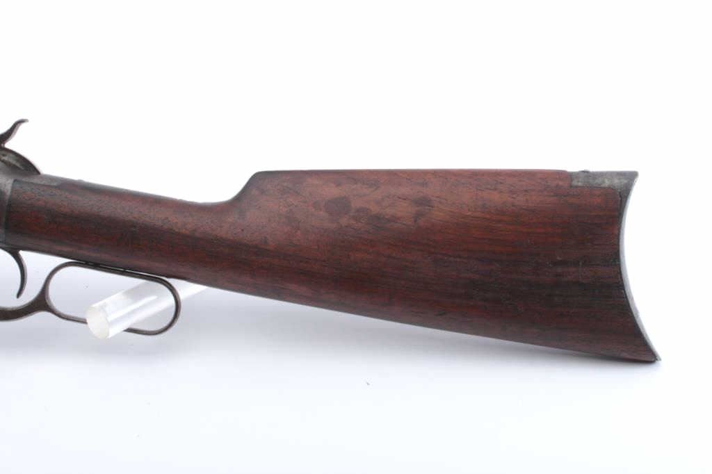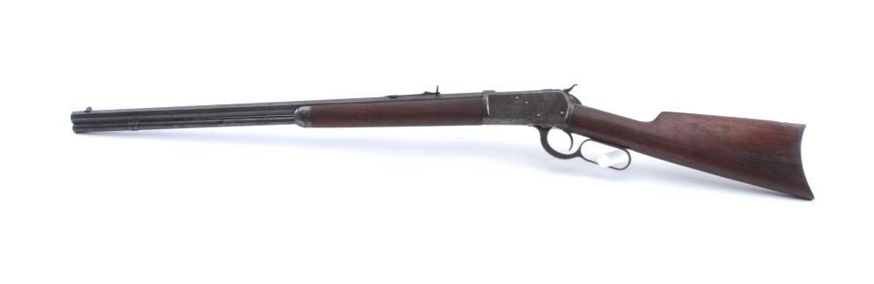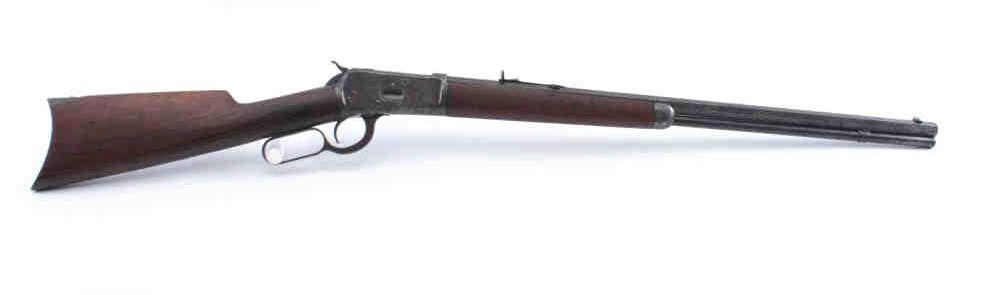 Winchester Model 1892 lever action rifle in .32-20 WCF caliber with a 24” octagon barrel, full-length magazine, rifle butt, Serial #375975. The rifle remains in good original condition with considerable blue mixing witha brown patina. There is scattered light to moderate erosion with light surface pitting. The barrel shows fairly sharp edges with good markings and barrel address. The wood is good with minor scratches, dings and marswith good wood to metal fit. The action is good, the bore is shiny and clean. The rifle is a 7 on a 1-10 scale, manufactured in 1906. Est.: $700-$1,400. (C+R).