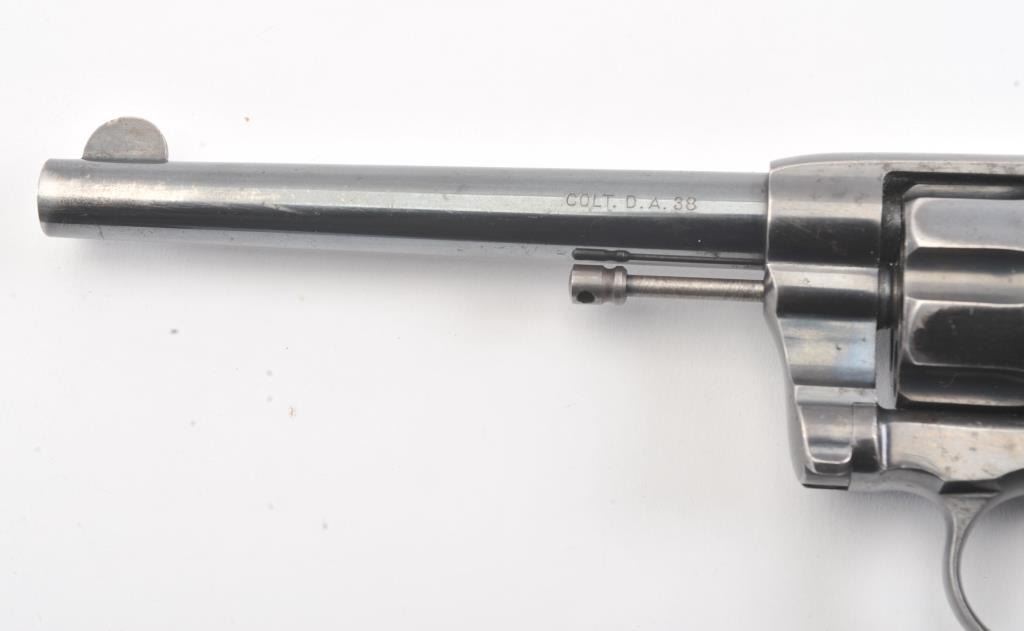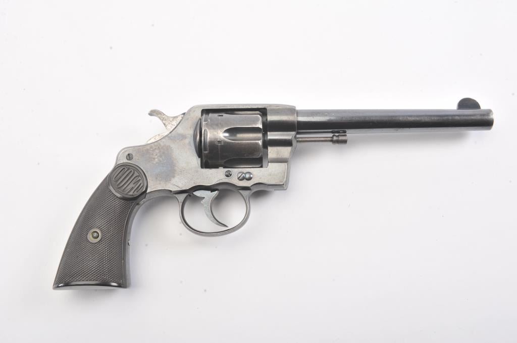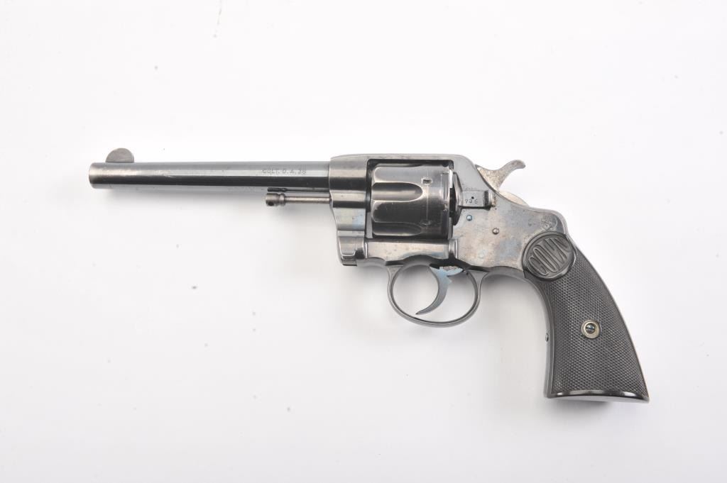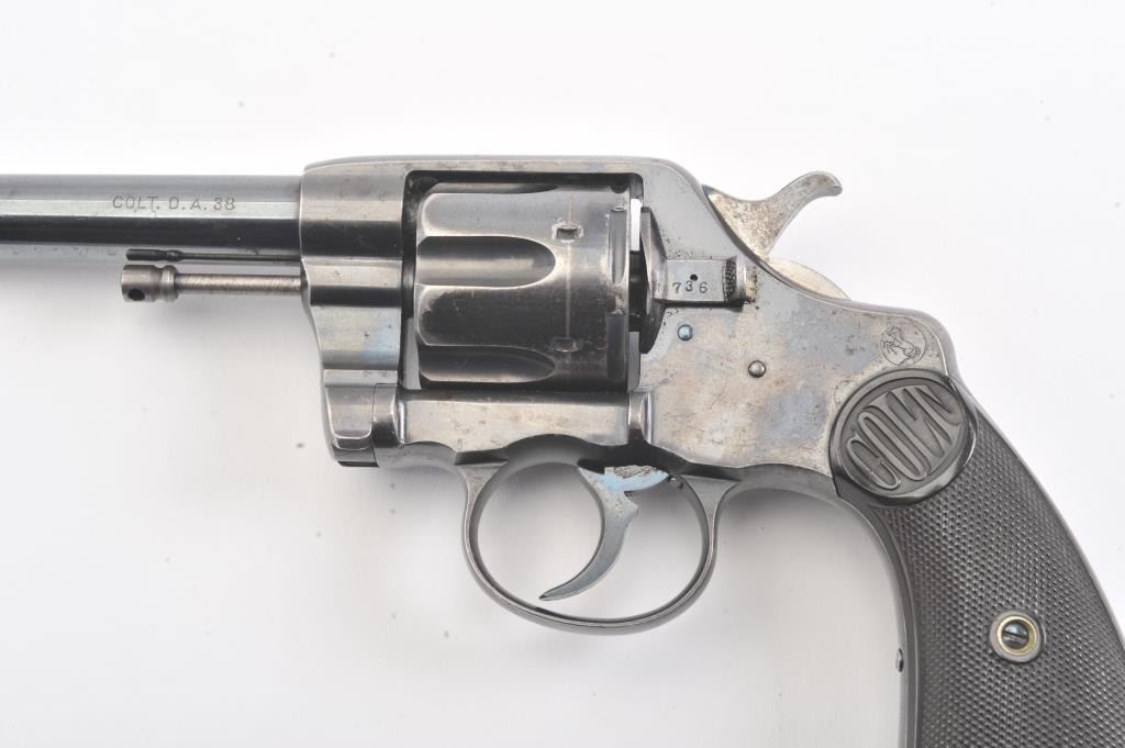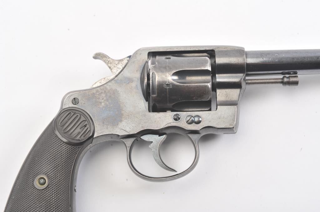 Colt 1895 DA 38, #71835, .38 cal., 6" barrel, blued finish, with checkered logo hard rubber grips. The revolver is in very god plus condition overall, retaining 85-90% original high polish blue, the bore is verygood, the action is stiff, possibly from Rig or a similar grease or preservative. The action should improve greatly with a good cleaning. The grips are about fine. (C&R/PPT) Est. 350-700