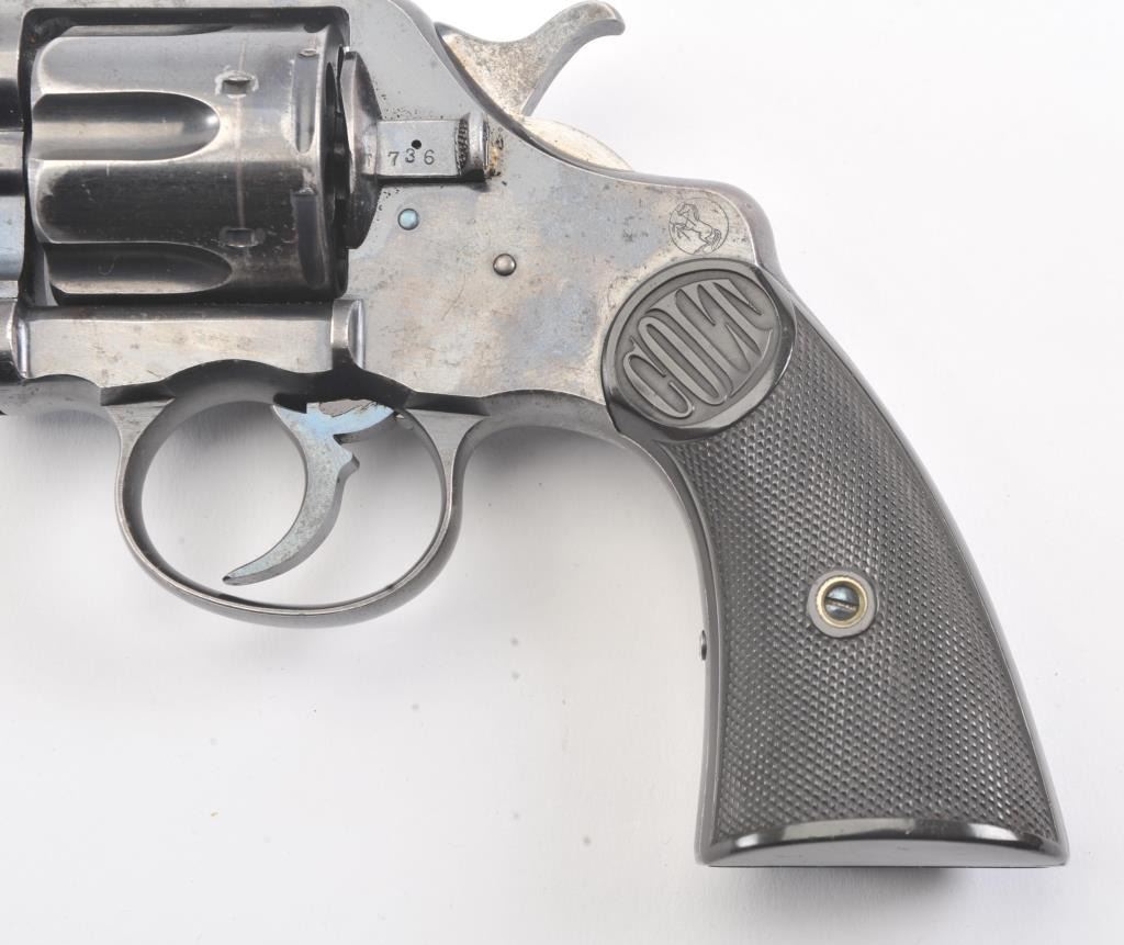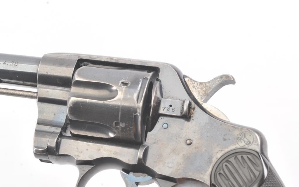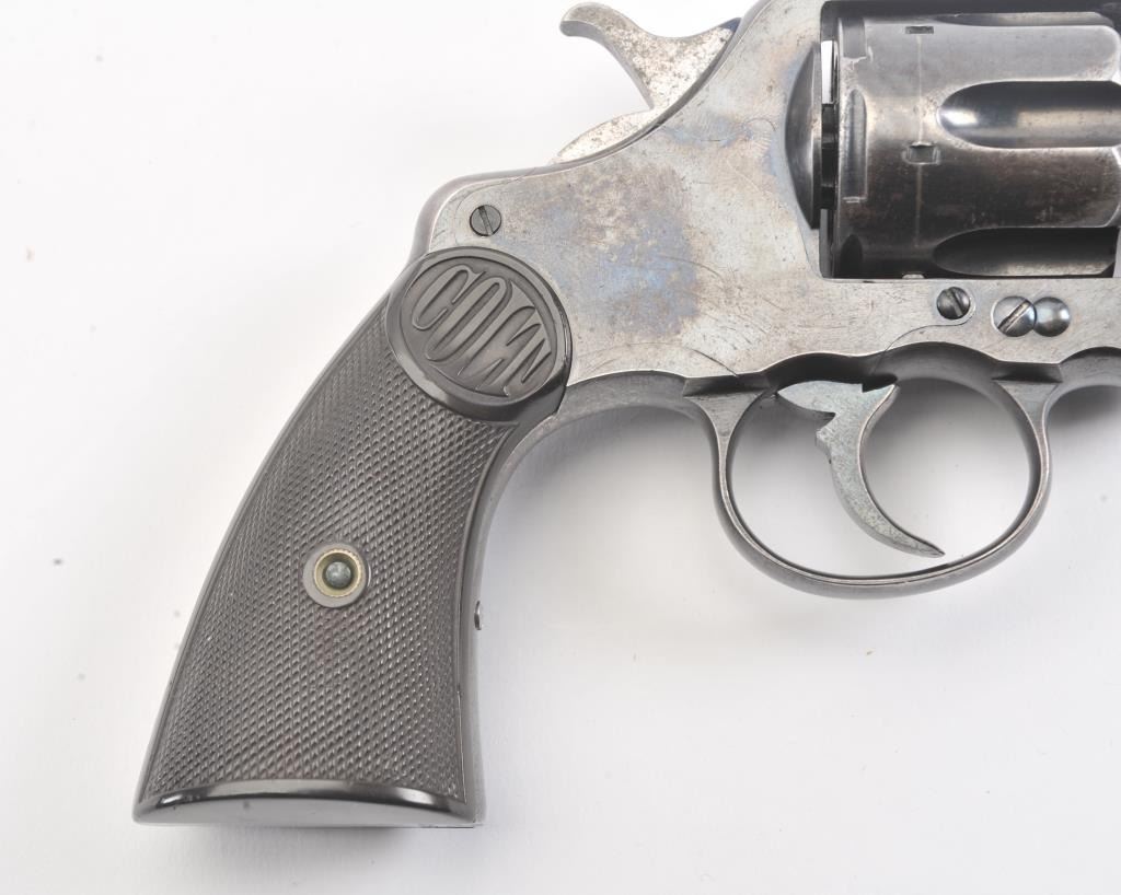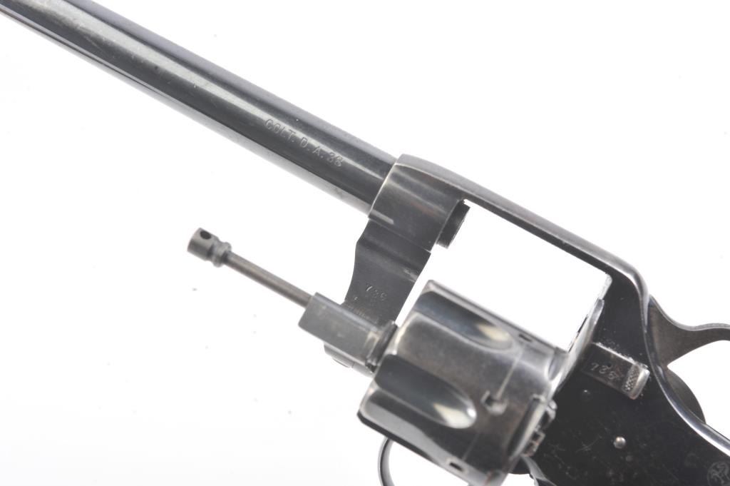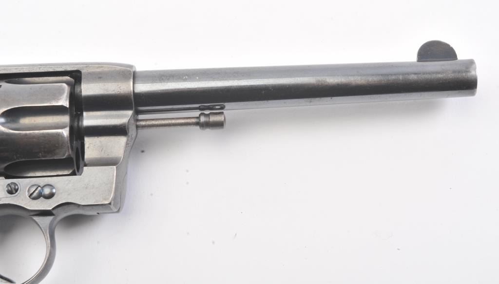 Colt 1895 DA 38, #71835, .38 cal., 6" barrel, blued finish, with checkered logo hard rubber grips. The revolver is in very god plus condition overall, retaining 85-90% original high polish blue, the bore is verygood, the action is stiff, possibly from Rig or a similar grease or preservative. The action should improve greatly with a good cleaning. The grips are about fine. (C&R/PPT) Est. 350-700