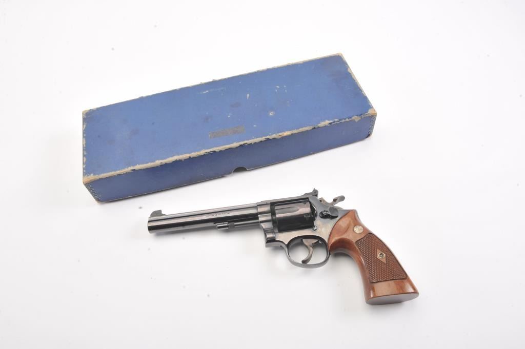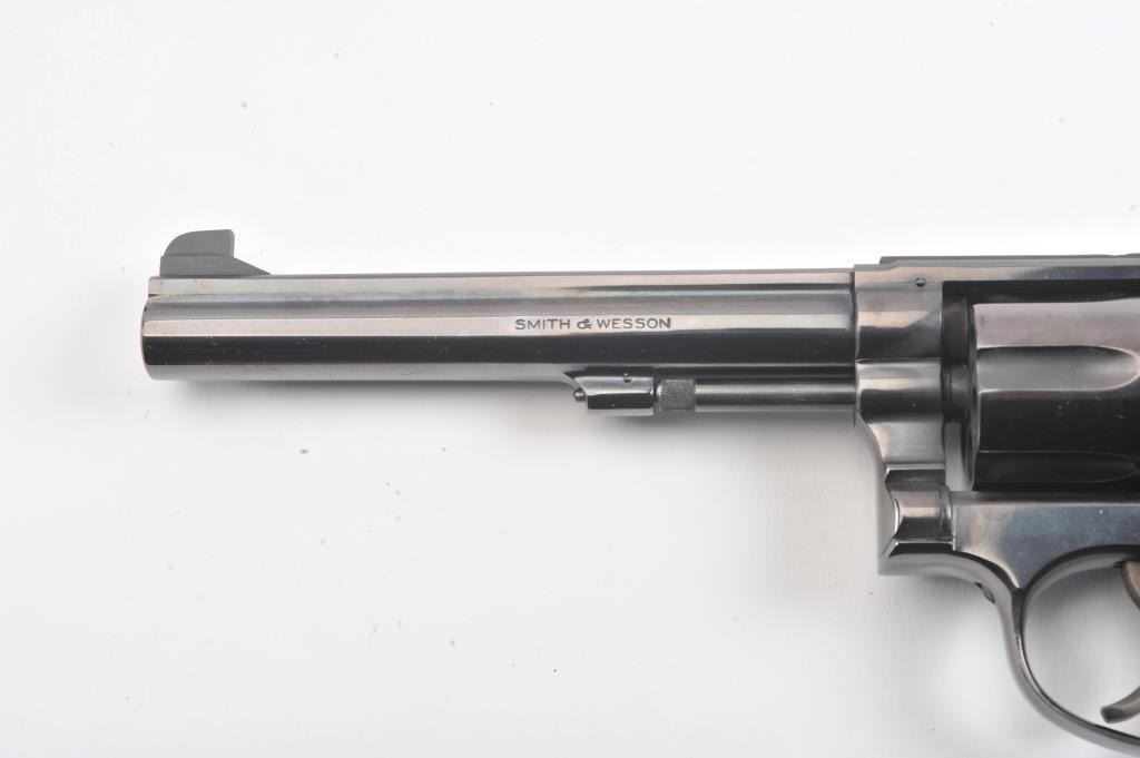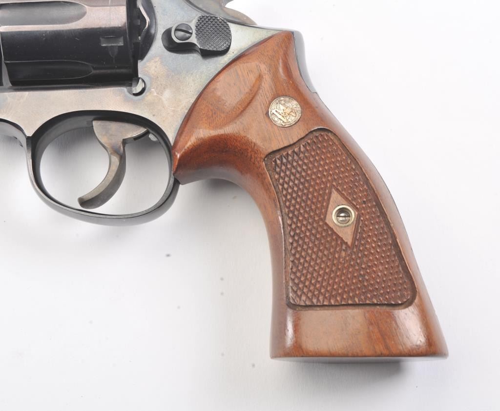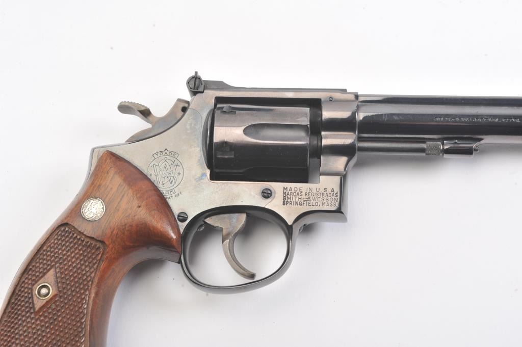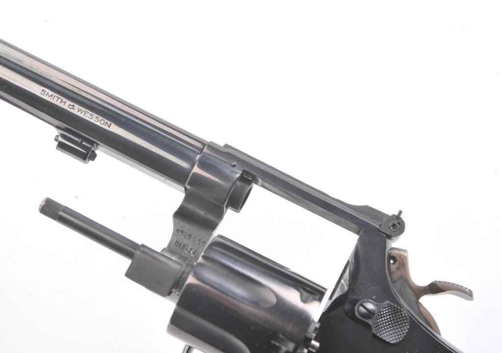 Smith & Wesson Model 14 K-38 Target Masterpiece Double Action Revolver, #K395655, .38 Spec. cal., 6'' pinned barrel, blue finish, case hardened target hammer and trigger on a 4-screw frame, micrometer clickadjustable rear sight and Patridge front sight, factory checkered square butt diamond magna walnut target grips with S& W medallions. Condition is near excellent showing approx. 99% factory bright blue andlight index line on cylinder. Grips are crisp with a minor small chip on right ear. Action is crisp, bore is bright. In factory S& W blue box, with instruction/parts brochure and original S& W packing paper. Factory letter found for this gun (C& R/PPT)Est.: $350-700