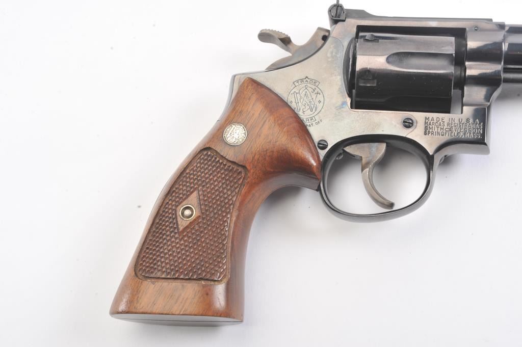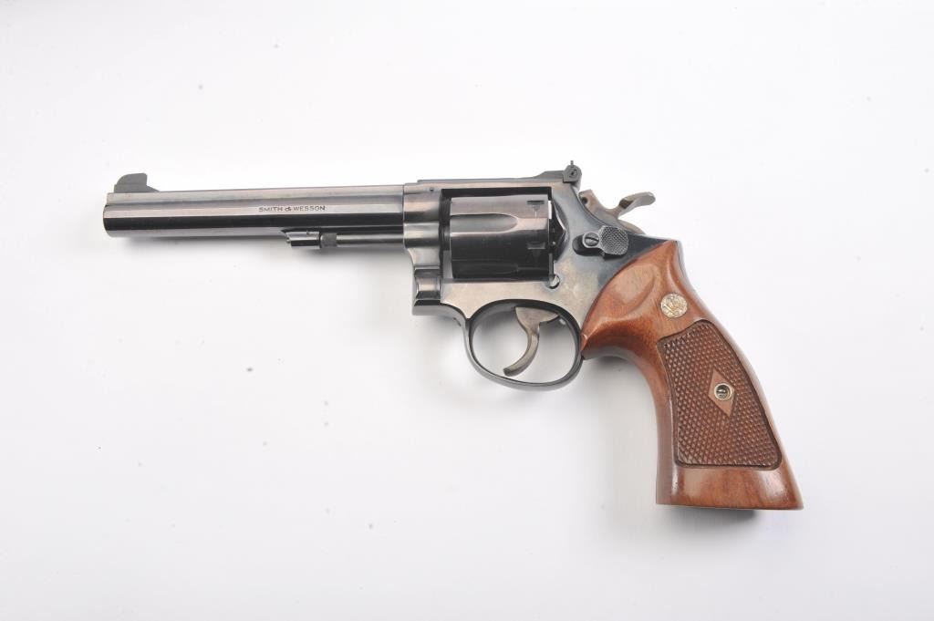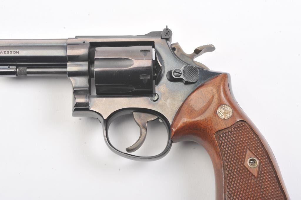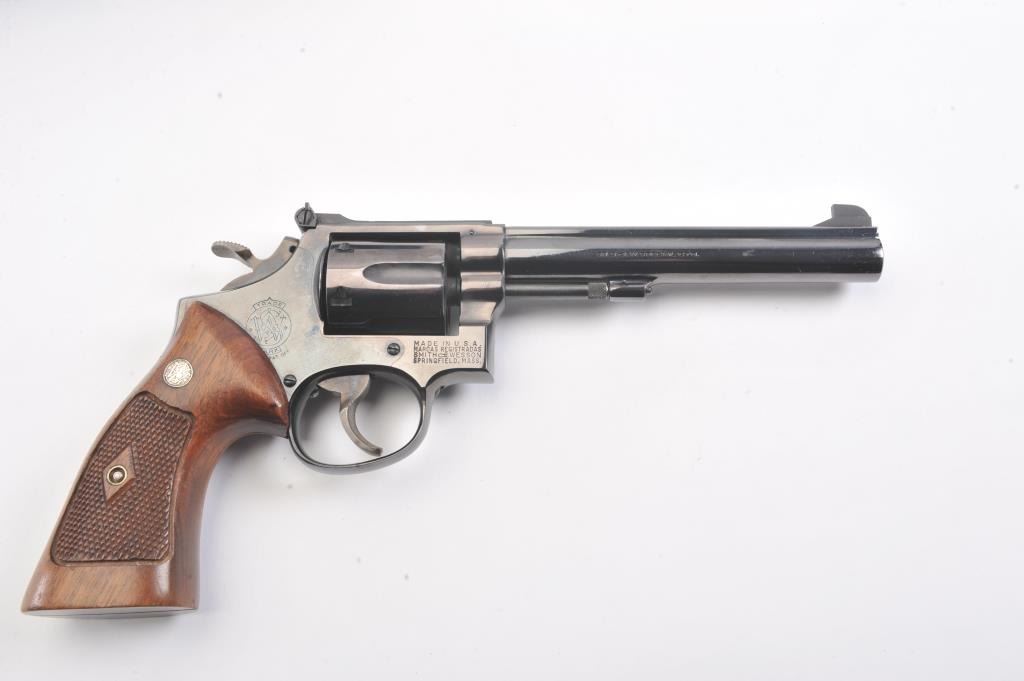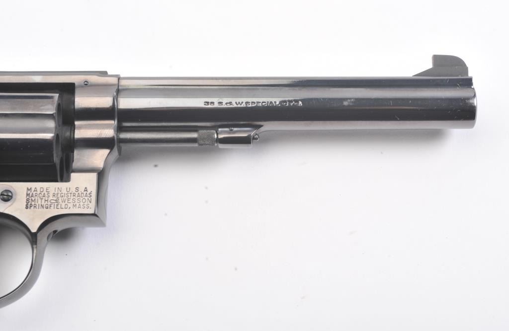 Smith & Wesson Model 14 K-38 Target Masterpiece Double Action Revolver, #K395655, .38 Spec. cal., 6'' pinned barrel, blue finish, case hardened target hammer and trigger on a 4-screw frame, micrometer clickadjustable rear sight and Patridge front sight, factory checkered square butt diamond magna walnut target grips with S& W medallions. Condition is near excellent showing approx. 99% factory bright blue andlight index line on cylinder. Grips are crisp with a minor small chip on right ear. Action is crisp, bore is bright. In factory S& W blue box, with instruction/parts brochure and original S& W packing paper. Factory letter found for this gun (C& R/PPT)Est.: $350-700