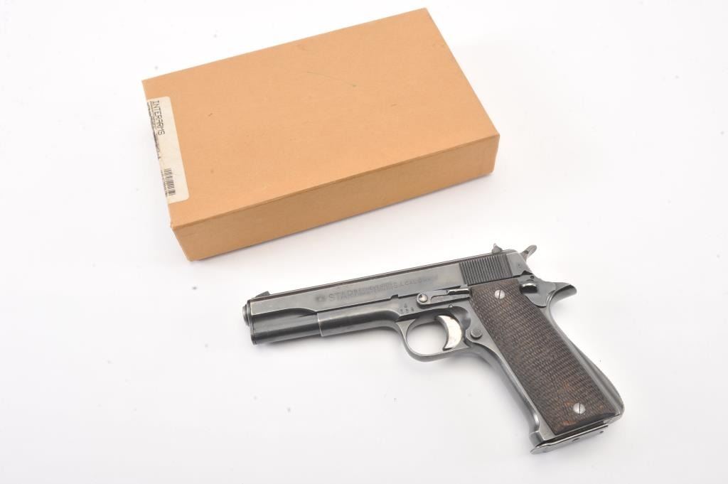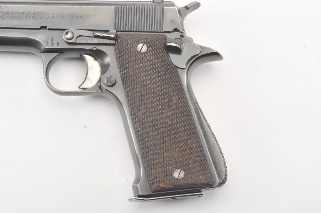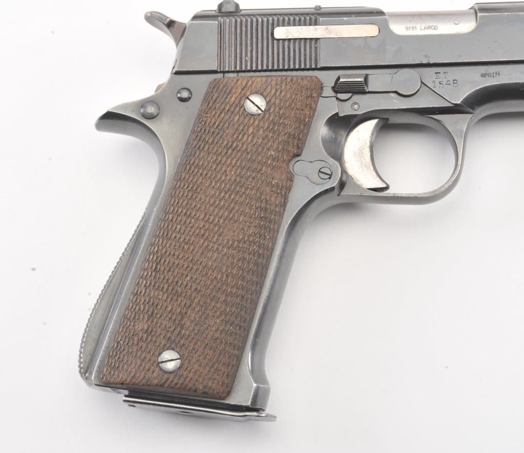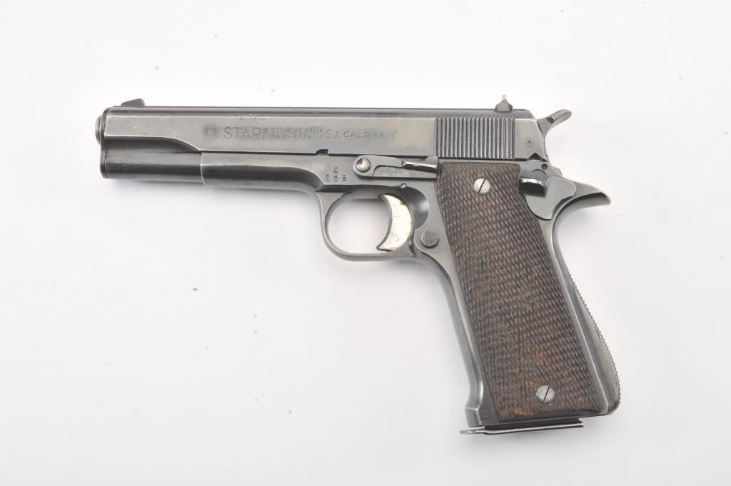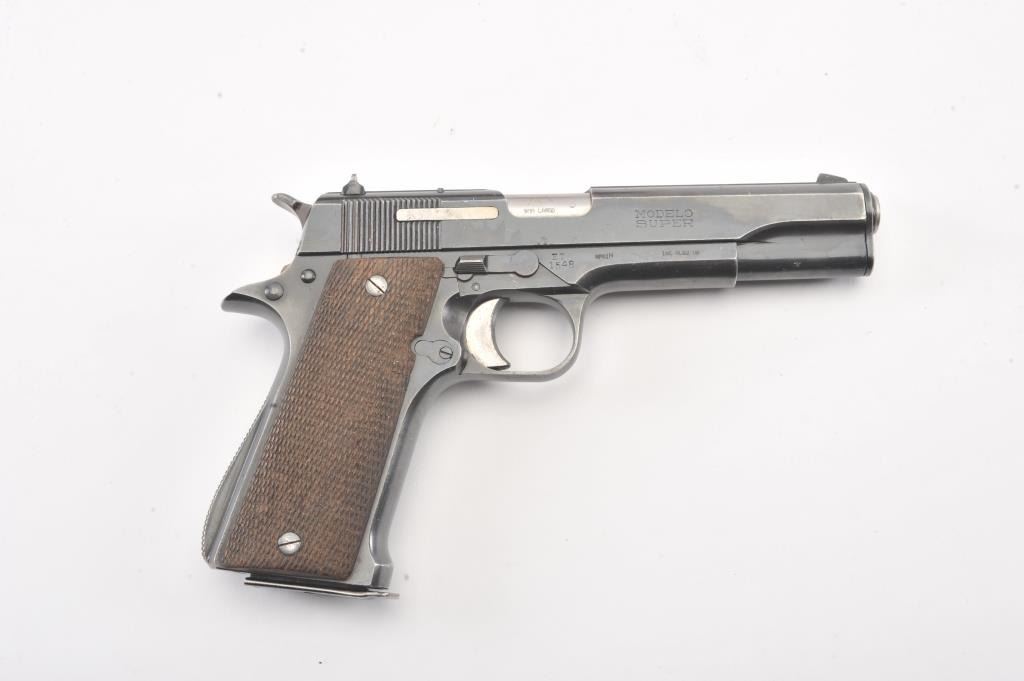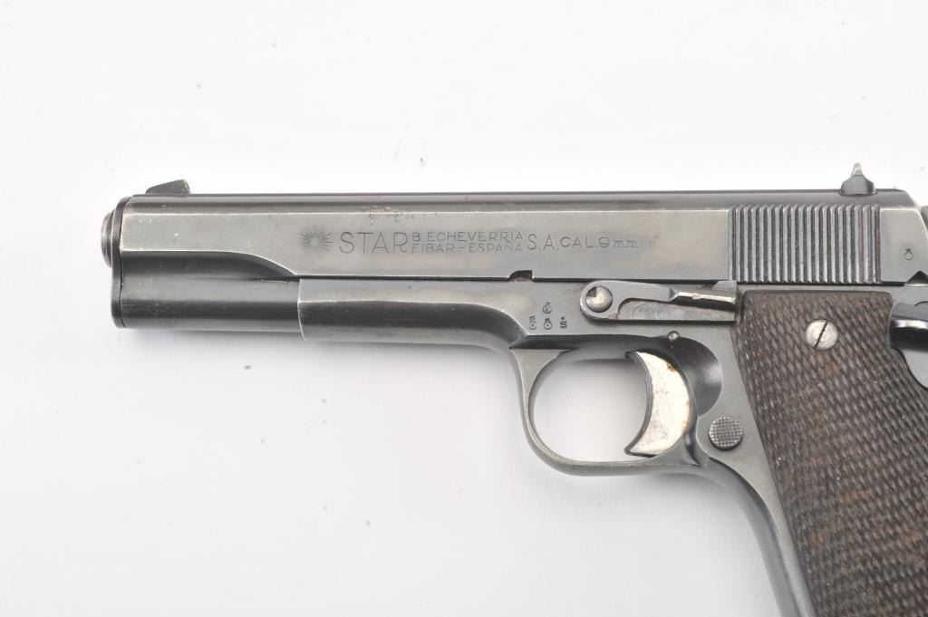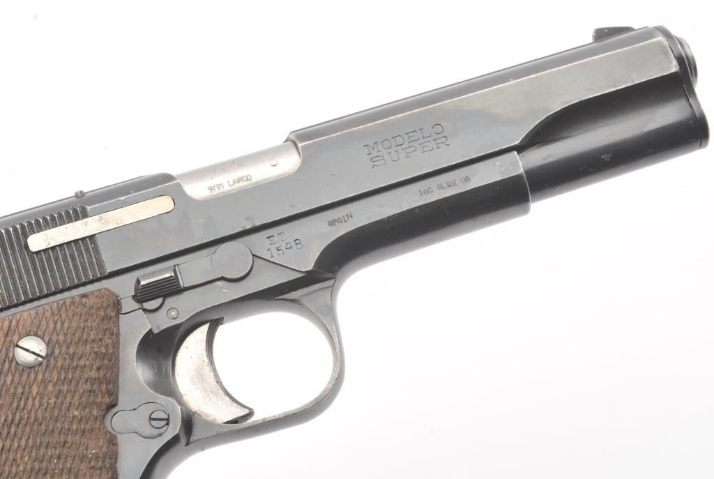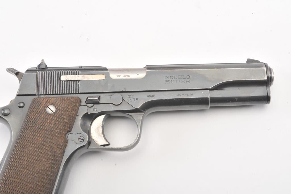Star Modelo Super semi-auto pistol, #314650, import-marked, 9mm Largo cal., 5” barrel, blued finish, checkered walnut grips, side of frame marked #ET 1548. This gun is in overall very good condition showingconsiderable original finish, good bore, action, markings and grips. Includes Kraft box, 2 correct mags, and instructions. (C&R/PPT) Est.: $300-600