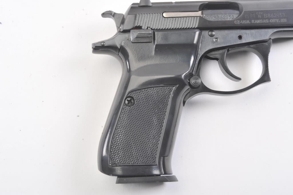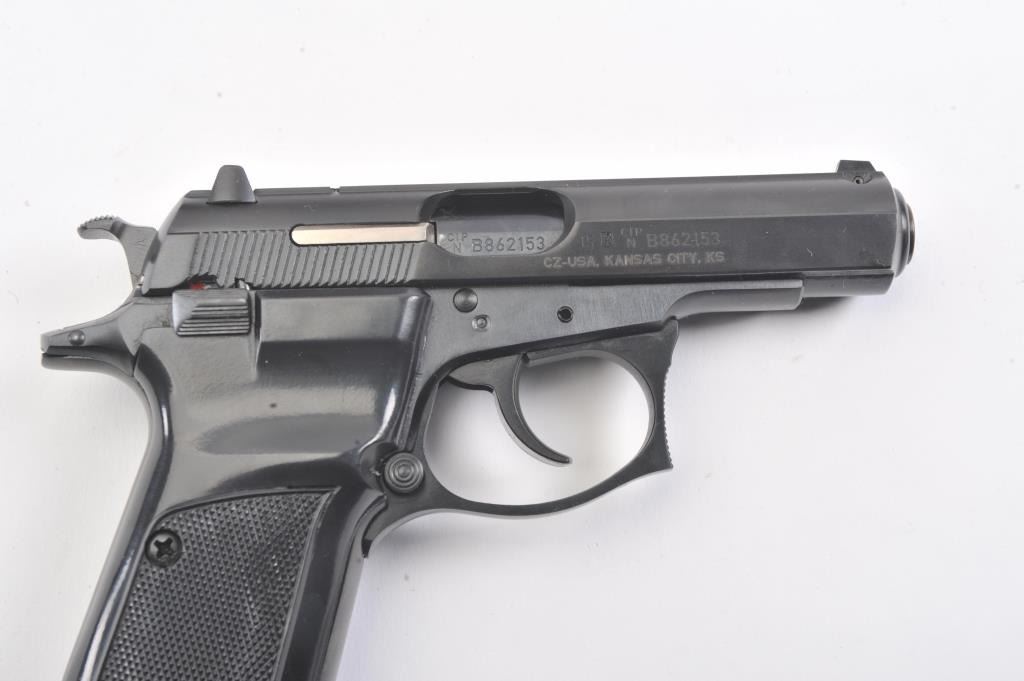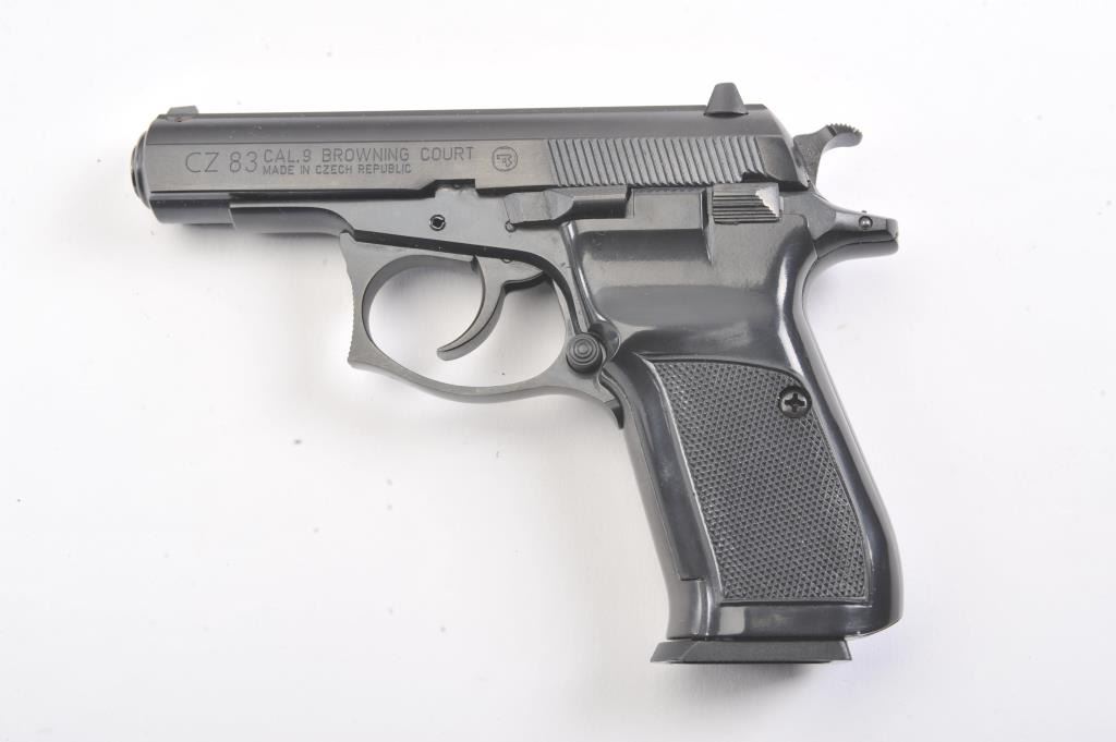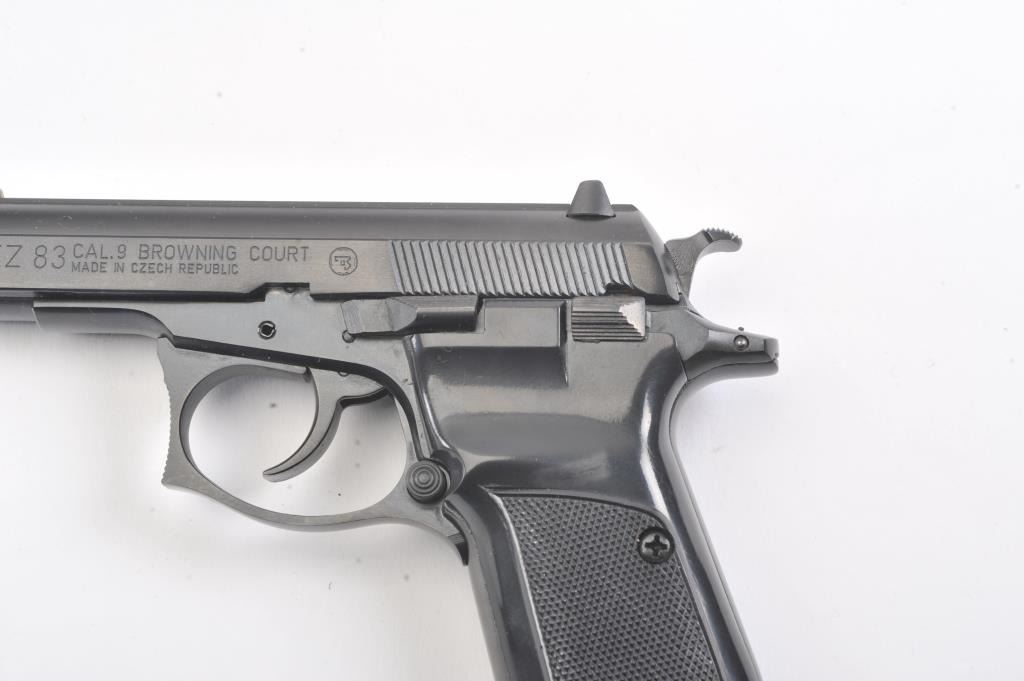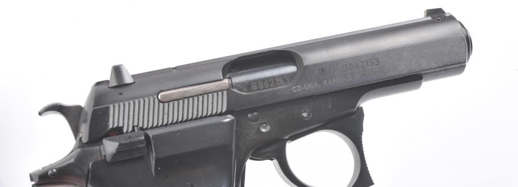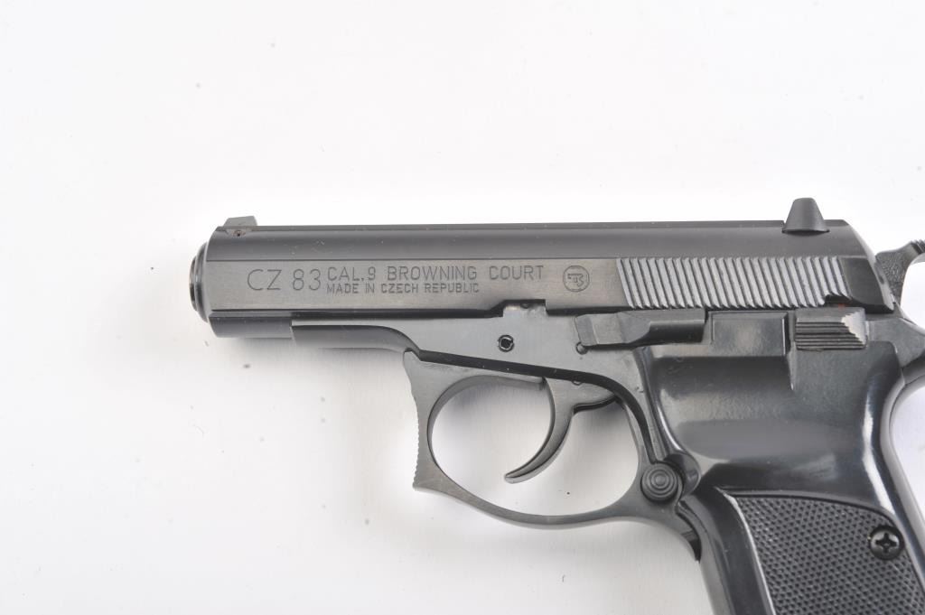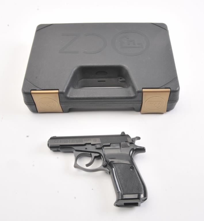CZ 83 #B862153, .380 cal, 3 3/4" barrel, blued finish, 3 dot fixed sights, ambidextrous safety, with black plastic checkered grips. Pistol is in excellent overall condition, with fine bore, excellentaction, and fine grips. Includes the original hard case, lock, paperwork, and two correct 10 round mags. (Modern/PPT) Est. $300-600