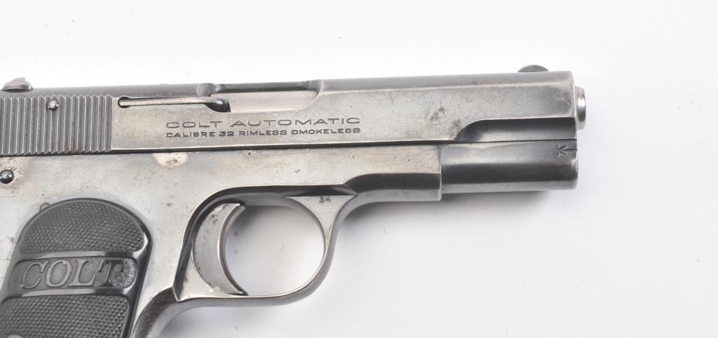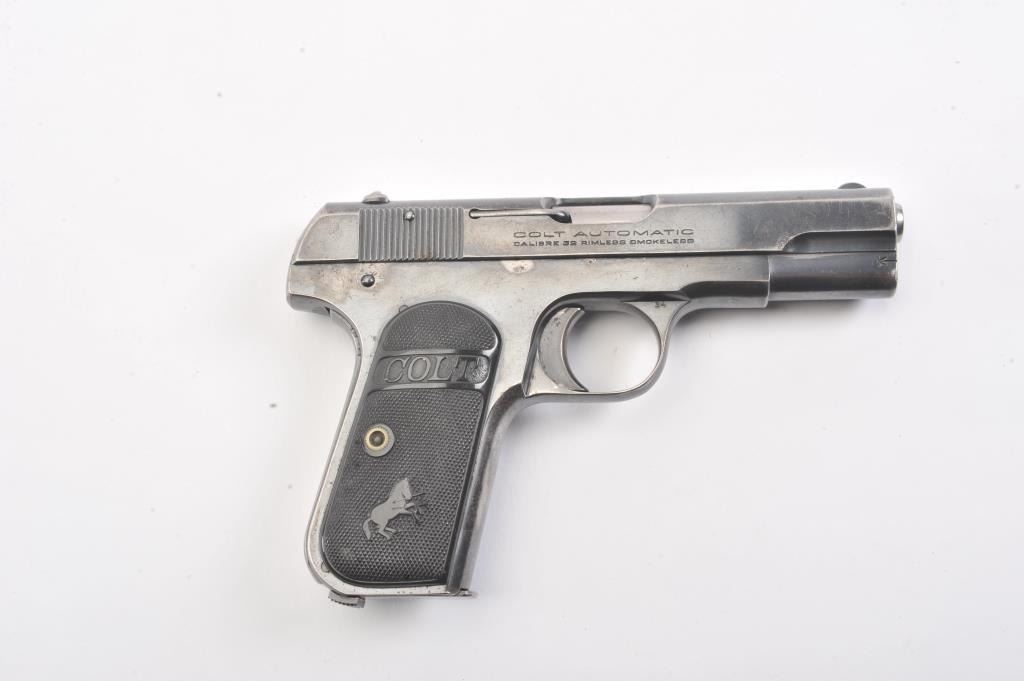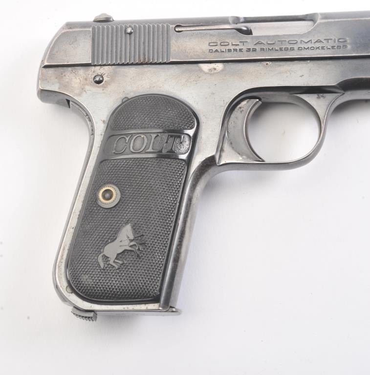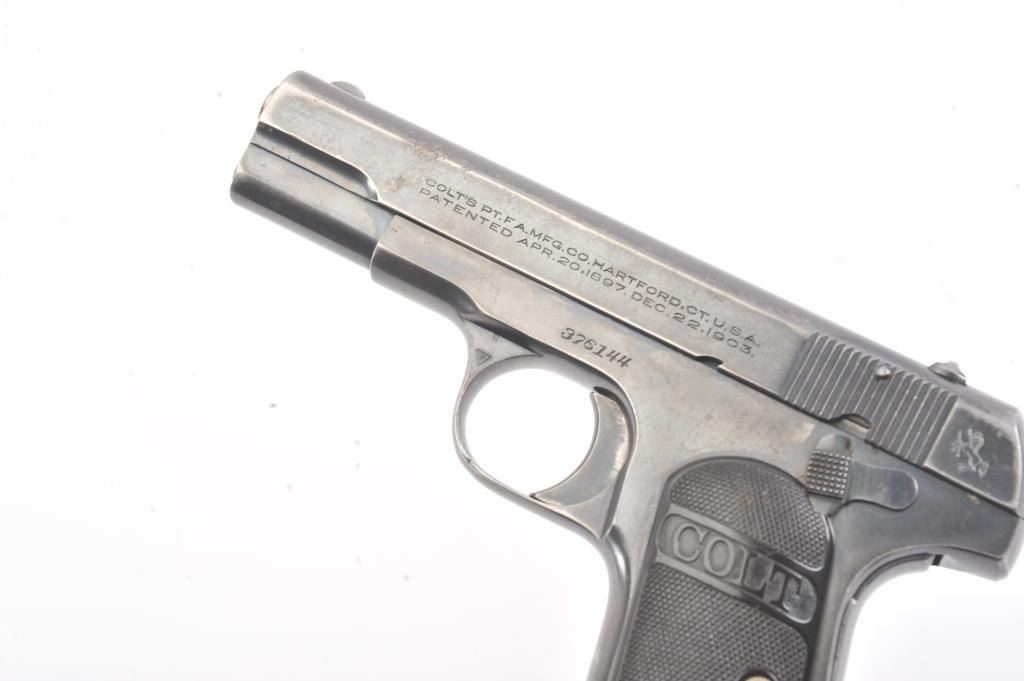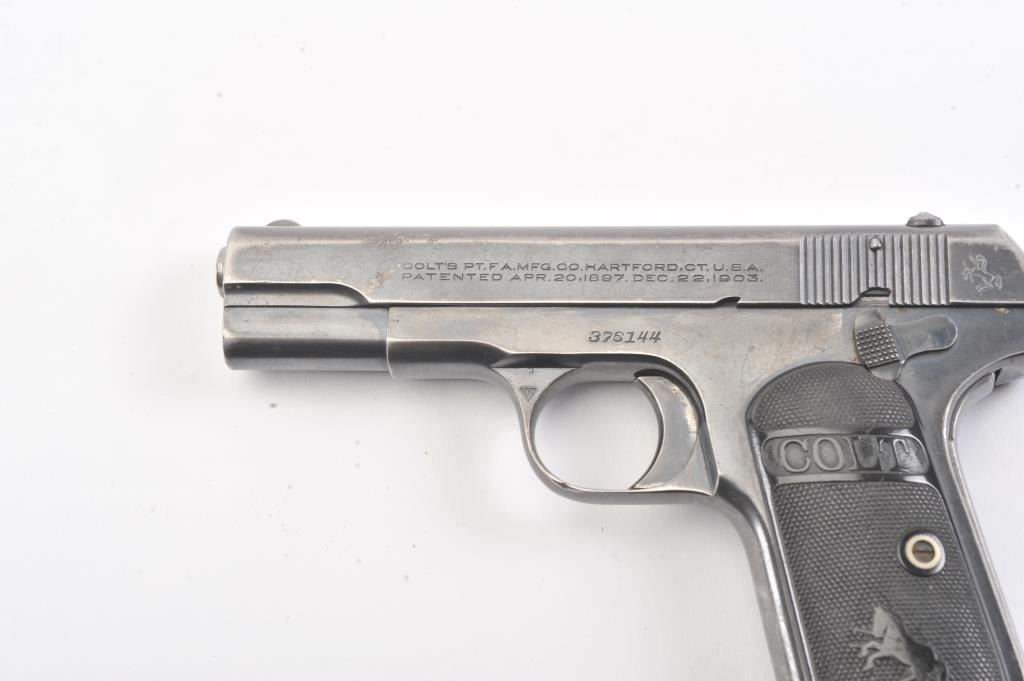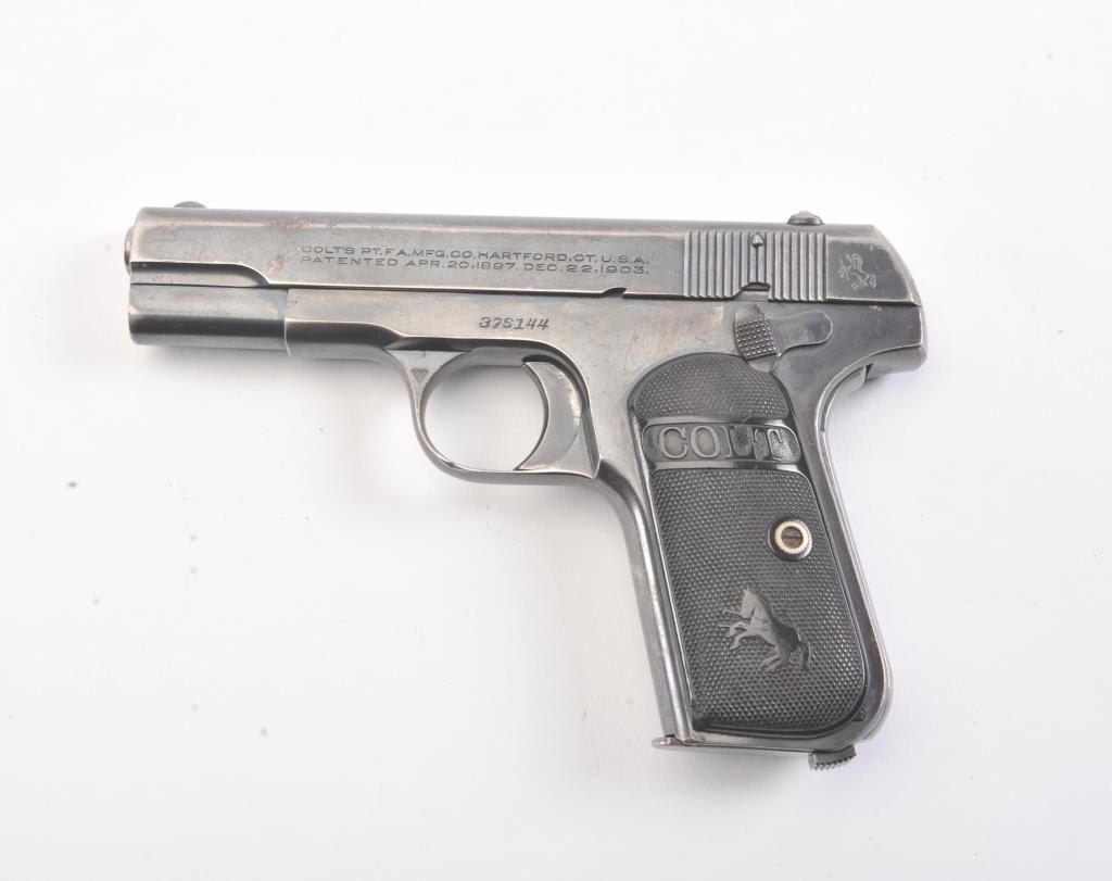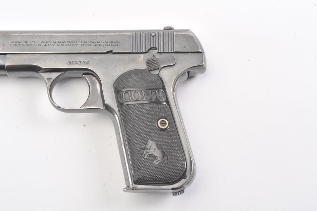 Colt 1903 Pocket Hammerless, #376144, .32 cal., 3 3/4" barrel, blued finish, black checkered logo hard rubber grips. Pistol is in very good condition overall, showing 75-80% original blue, several spots ofcorrosion on the right side have been cleaned, finish is thinning especially on the top of the slide and grip straps. The bore is good with minor corrosion, the action is good. The grips are good with no chips orcracks. Includes one correct magazine. (C&R/PPT) Est. 400-800