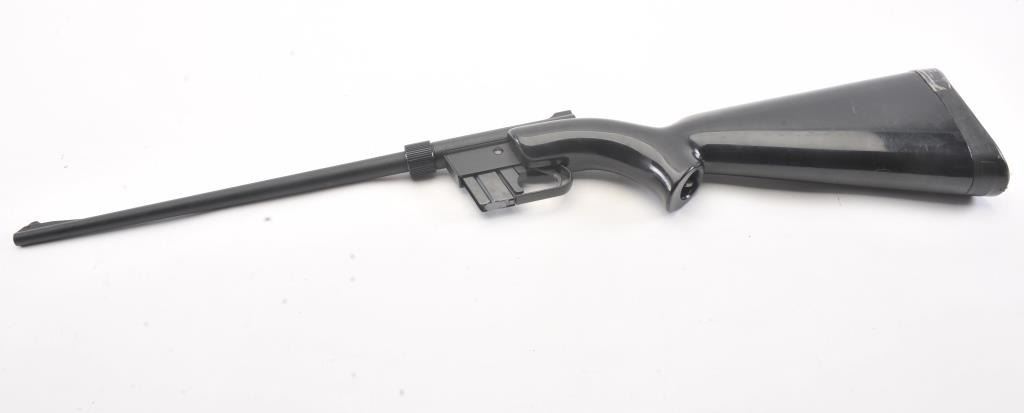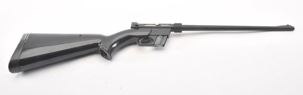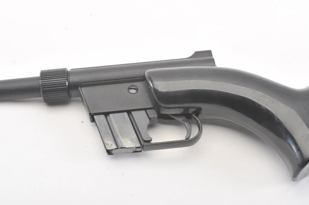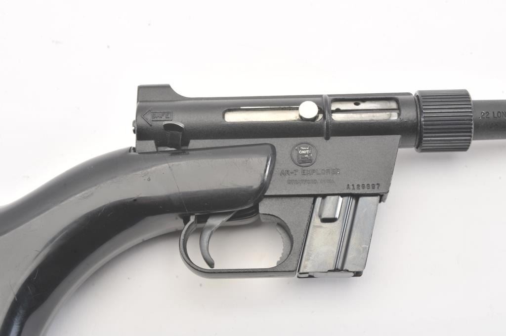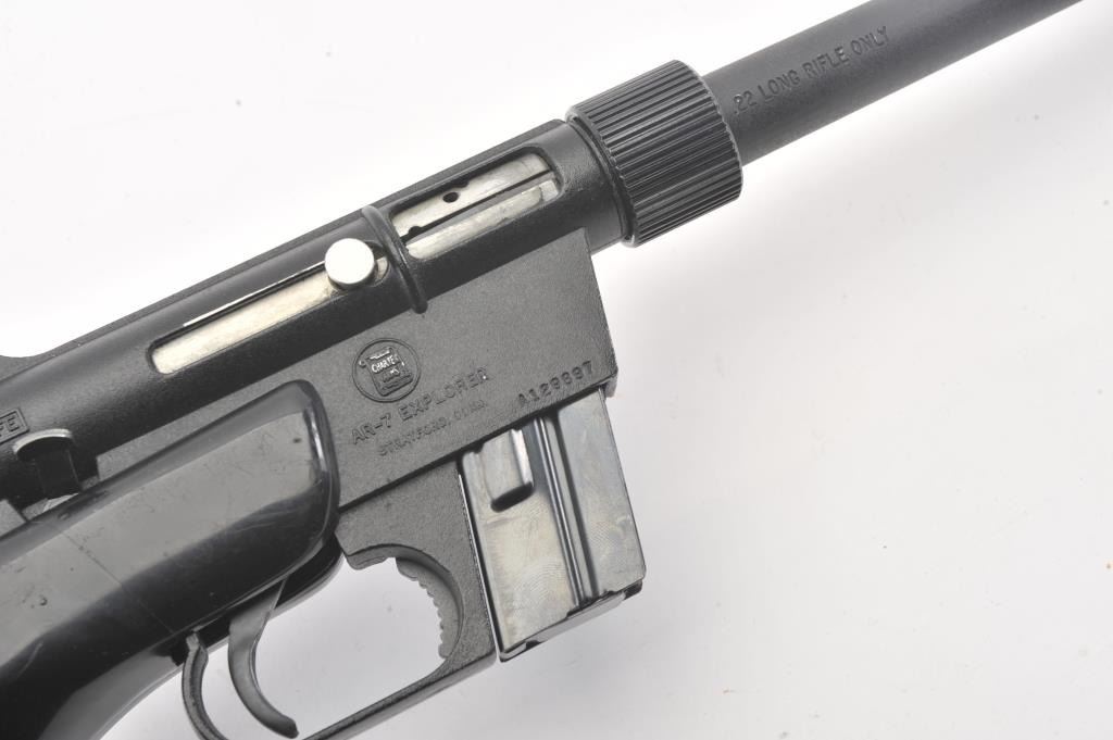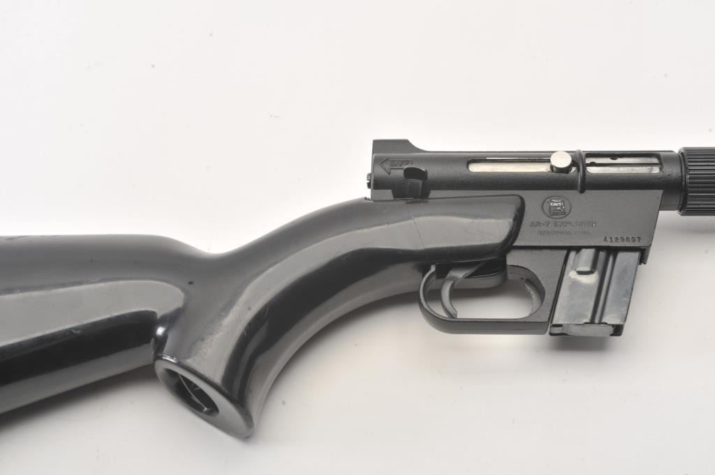 Charter Arms AR-7 Explorer take down rifle, #A129897, .22 LR cal., 16" barrel, matte black finish, fixed sights, with black synthetic stock. The rifle is in very good condition overall, with very good bore, goodaction, very good stock with minor scratches. The rubber end cap has a small tear and is taped, otherwise good. This popular rifle has been featured in several movies, including James Bond. This is an early"patents pending" version. (C&R/PPT) Est. $200-400