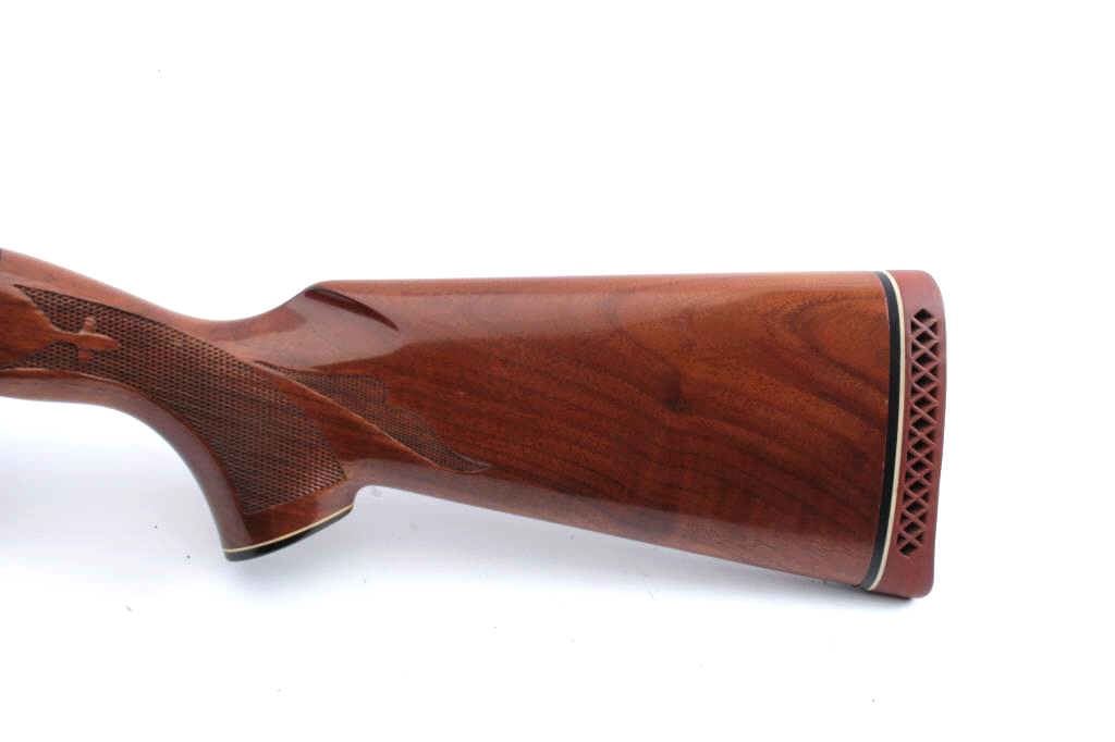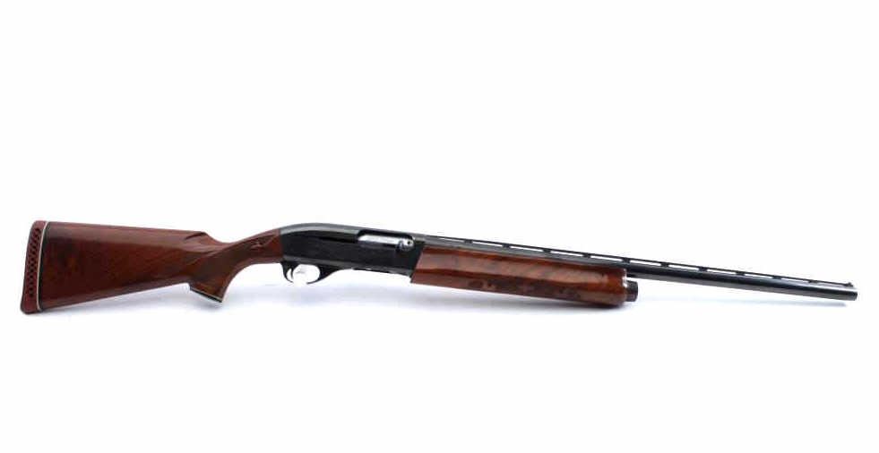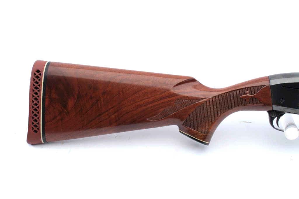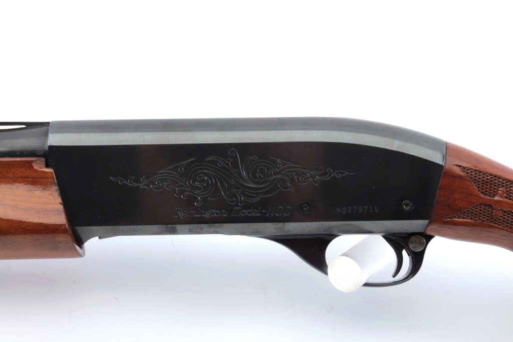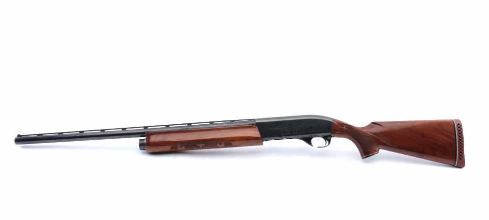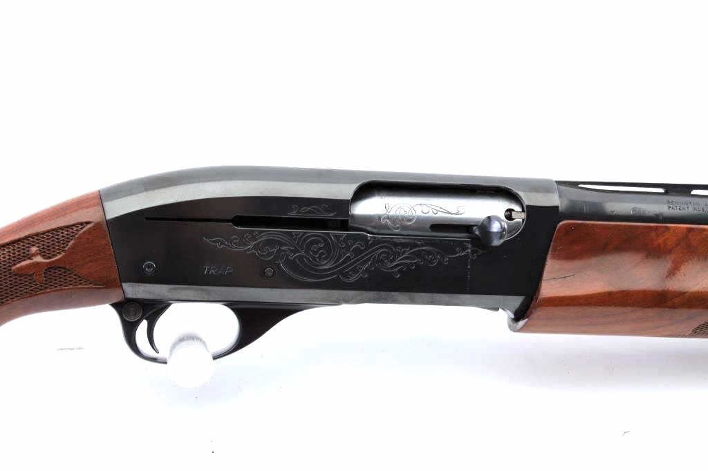 Remington Model 1100 TRAP semi-automatic shotgun, 12 gauge, Serial #M097971V. The shotgun is in fine overall condition with a 25” barrel with a full-length ventilated rib and ivory bead front sight, marked, “SKEET”. The metal surfaces retain nearly all the blue finish with light storage marks noted. The checkered wood stocks are in very good condition with small mars and abrasions consistent with field use. The butt stockends with a ventilated rubber pad providing a 14 ½” LOP. The bore is good, the action is crisp and the markings are sharp. Est.: $350-$700. (Modern).