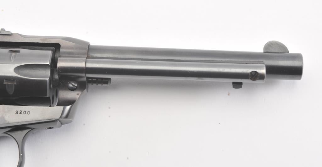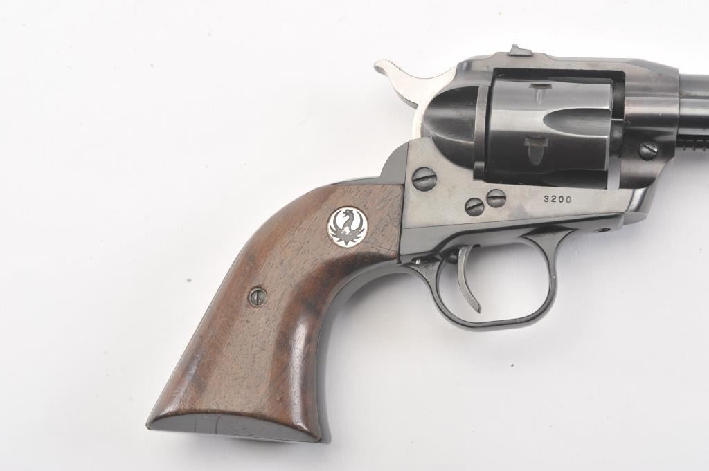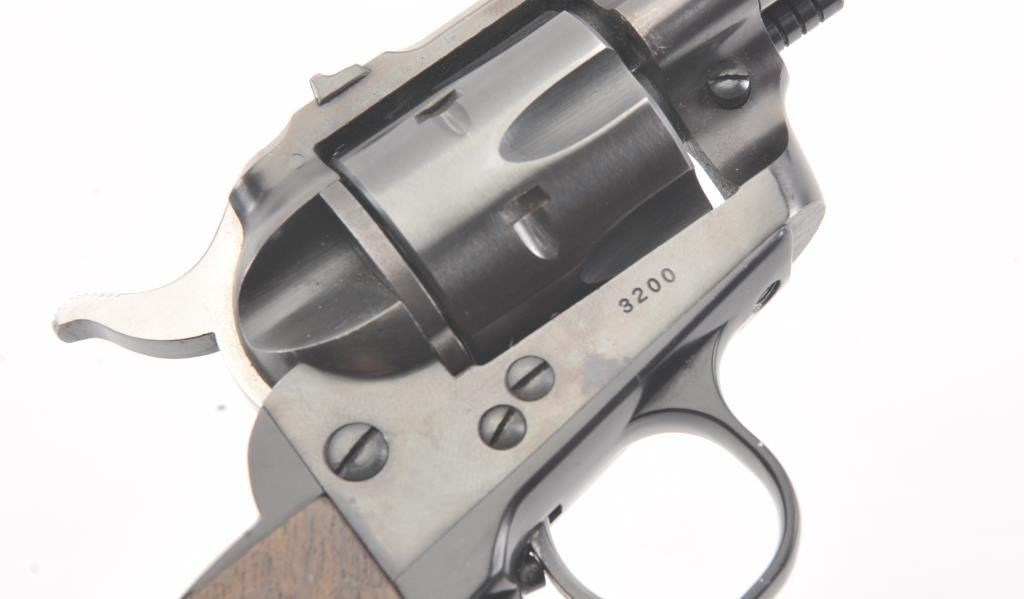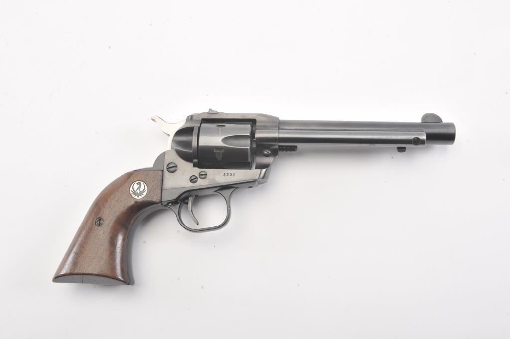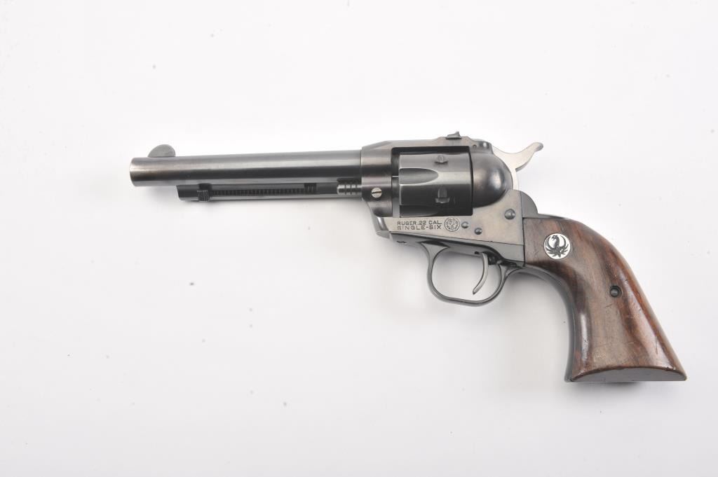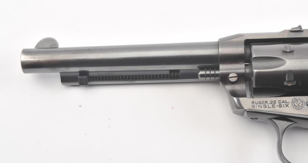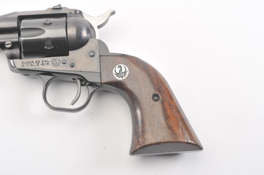Early Ruger Single Six flat gate 3 screw single action revolver, #3200, .22 LR cal., 5 1/2" barrel, fixed sights, with smooth medallion grips. The revolver is in fine condition overall, showing over 96% originalfinish, starting to turn plumb, has not been converted to transfer bar safety. The grips are very good with light scratches and dings, but with no chips, cracks or losses. The bore is bright with good rifling, the actionis very good. (C&R/PPT) Est $200-400