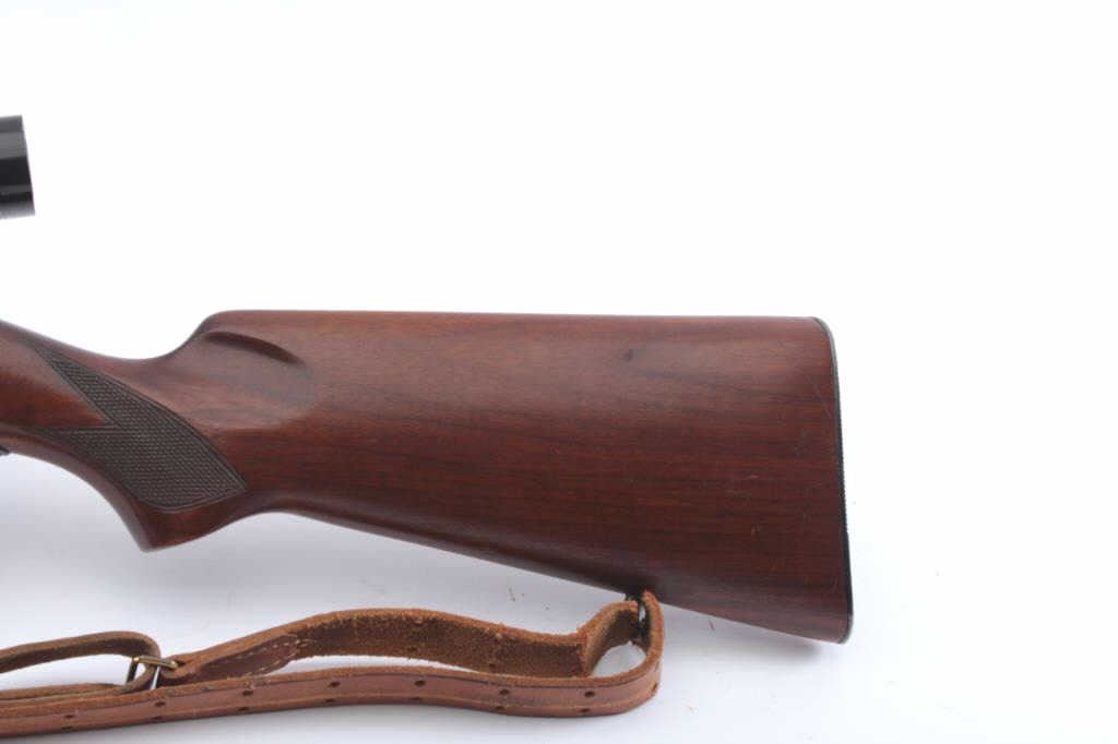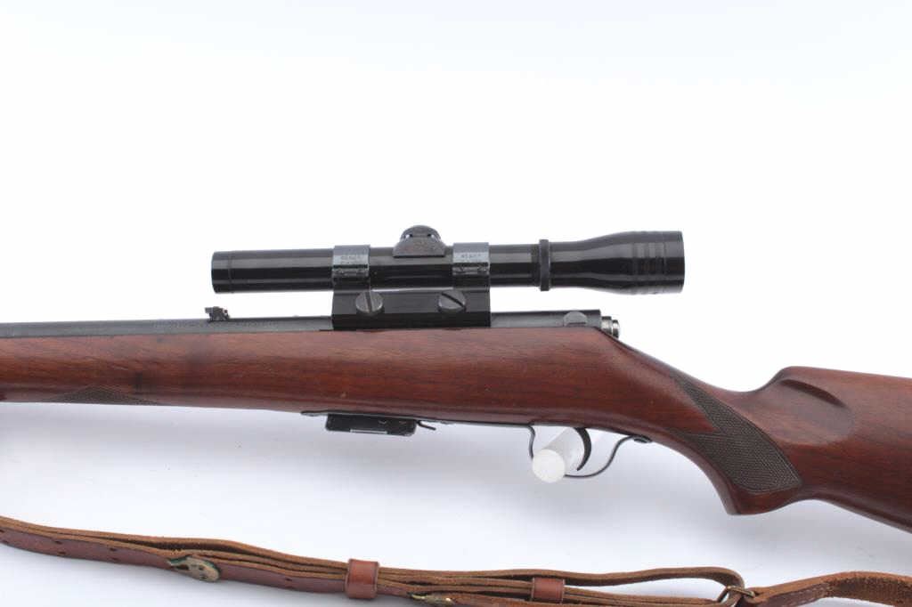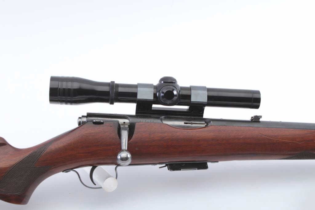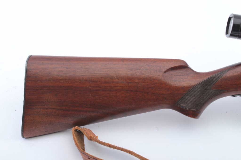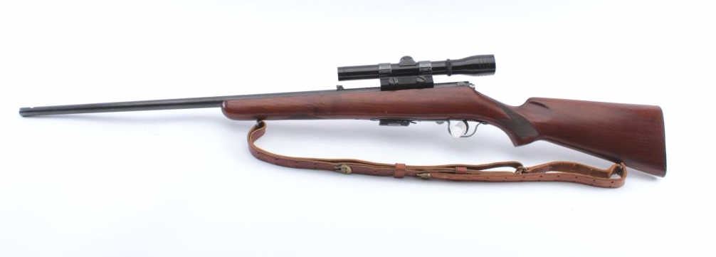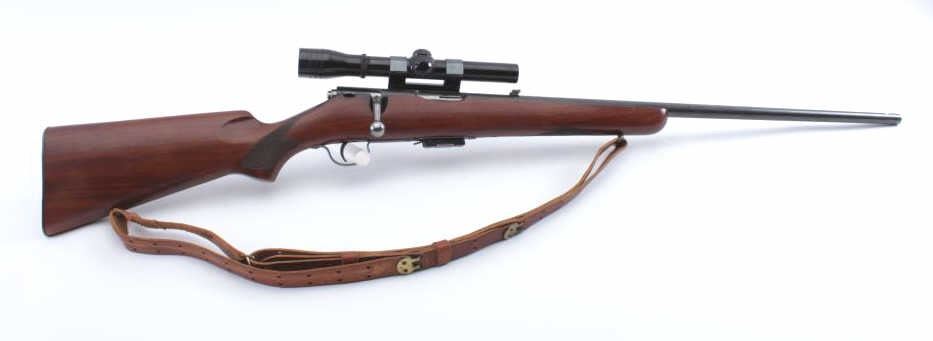 Savage Model 23D bolt action rifle, .22 Hornet caliber, Serial #217048. The rifle is in good overall condition with a 23 ½” barrel with the front sight removed and a folding rear sight. The metal surfacesretain a significant amount of muted blue finish with a chrome bolt handle. The checkered wood stock is in very good condition with small mars and compressions. The butt stock ends with a steel butt plate. The rifle is topped with a Weaver side mount and Redfield 2 ¾ X fixed power scope. The bore is good, the action is crisp and the markings are sharp. The lot includes a period leather sling. Est.: $150-$300.(C+R).