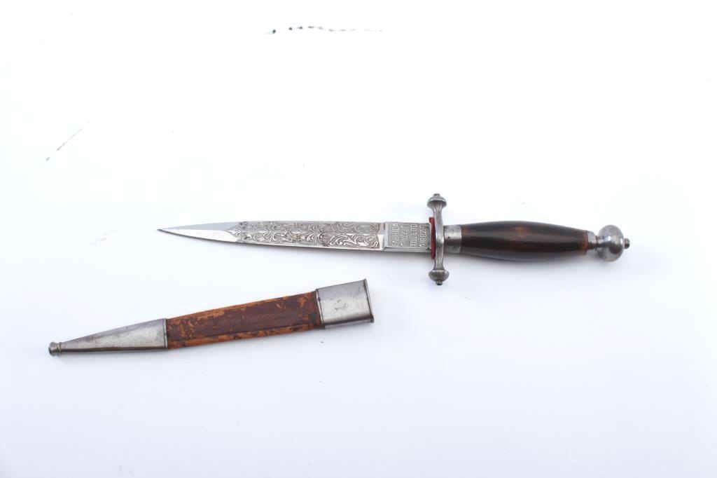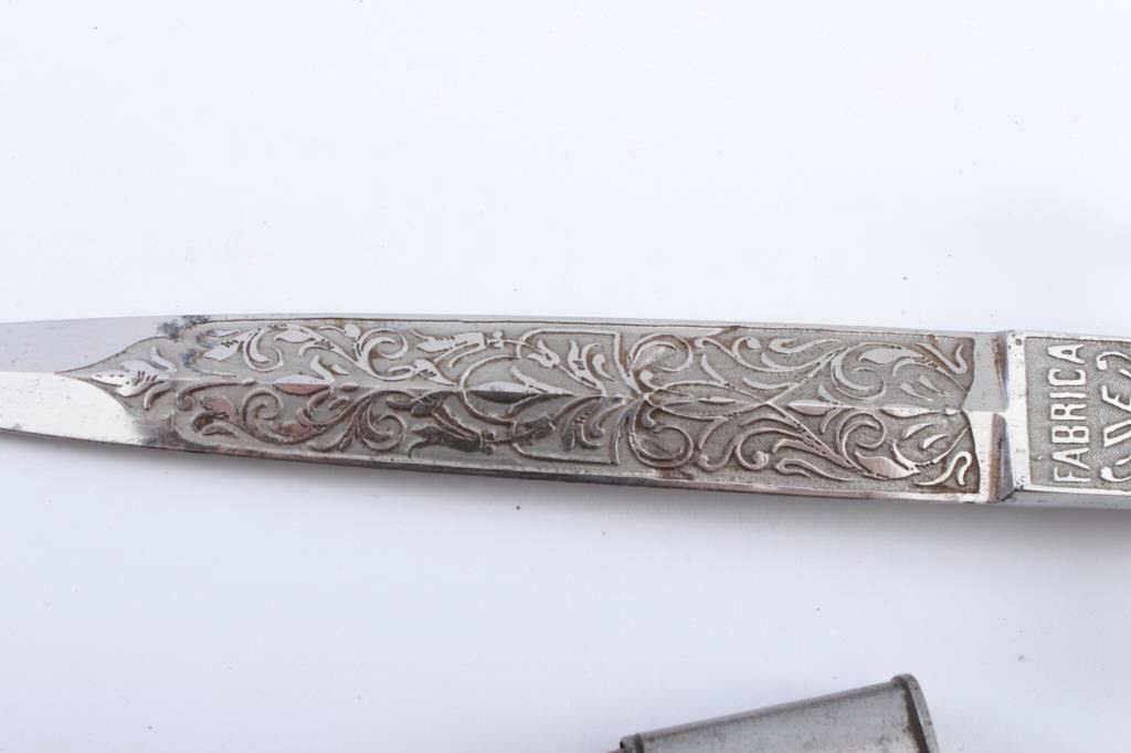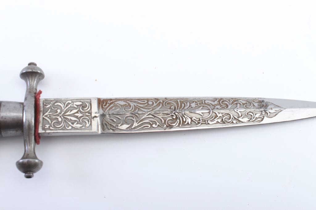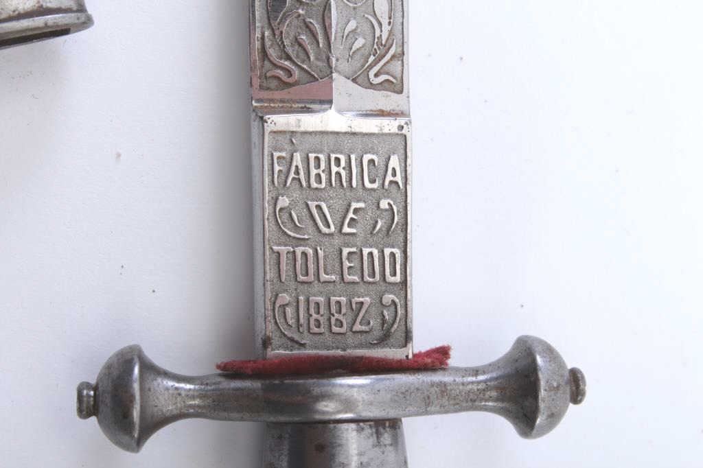 Fine quality Toledo dagger in armorial style marked "Fabrica de Toledo 1882" with 7" reinforced spear point blade showing fine and deep etching. Hardwood grip and original scabbard. Measures 12 3/8" overall. The armsof Toledo were world recognized in the 19th century when Spanish quality equaled 17th century masters under the direction of E. Zuluoaga. Est.: $250-$500
