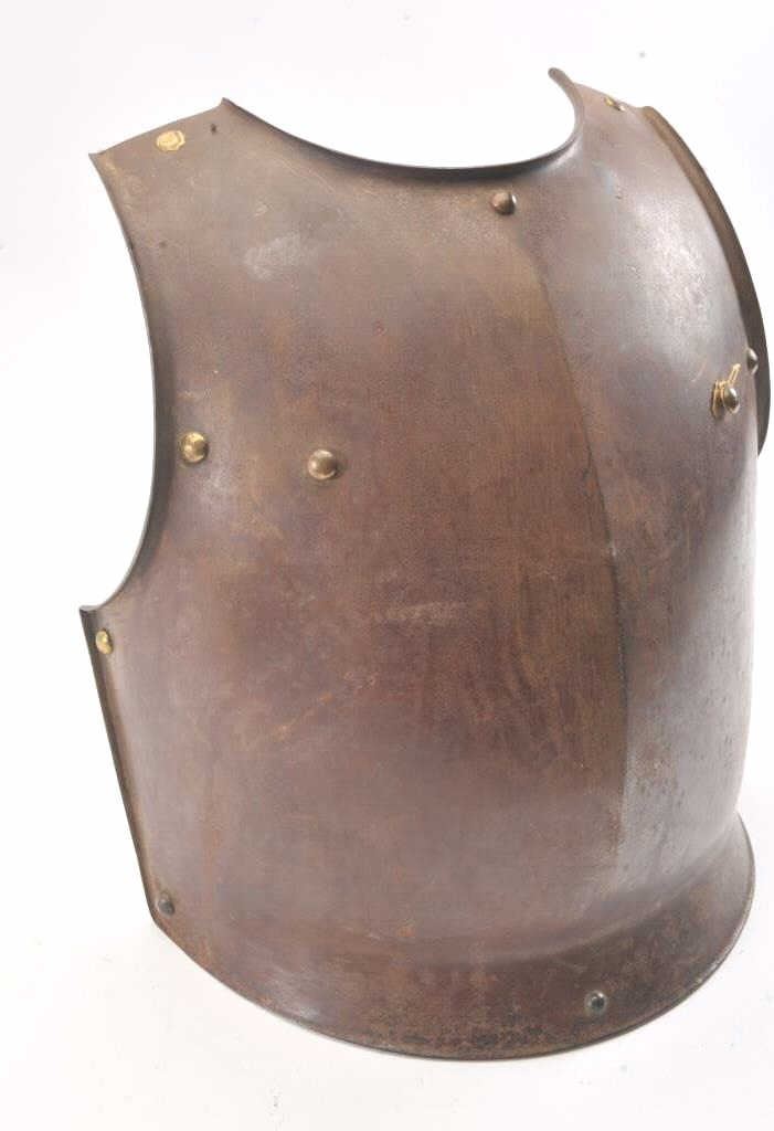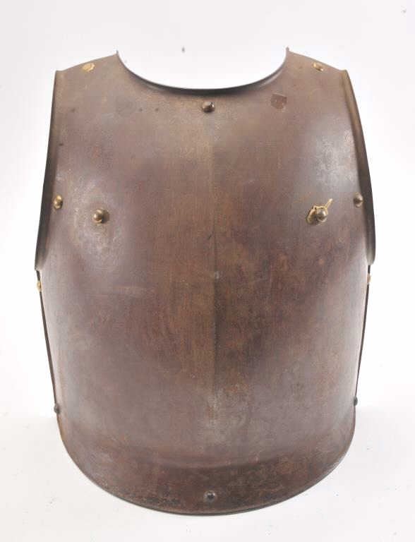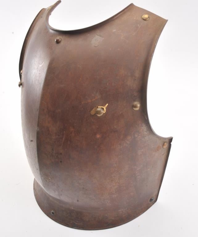 French Courasier breast plate engraved on the bottom inside edge "Klingenthal Arsenal 1830" and "LT 2L N 7483" in fancy script letters. Most original brown finish with brass rivets. Some scratches but generallyvery good for its age. Weighs 13.5 lbs. Est.: $350-$700