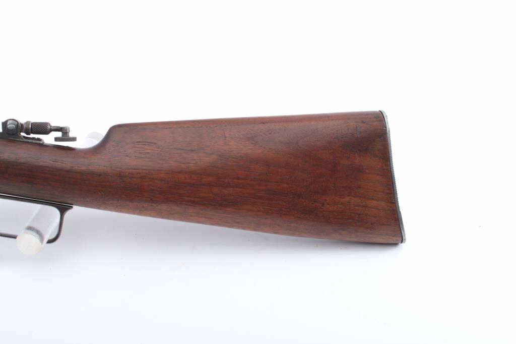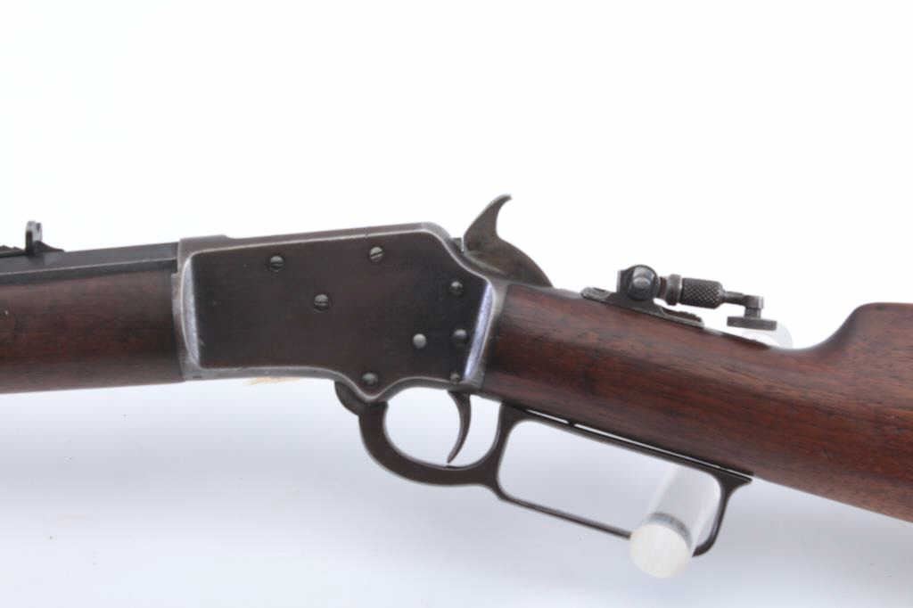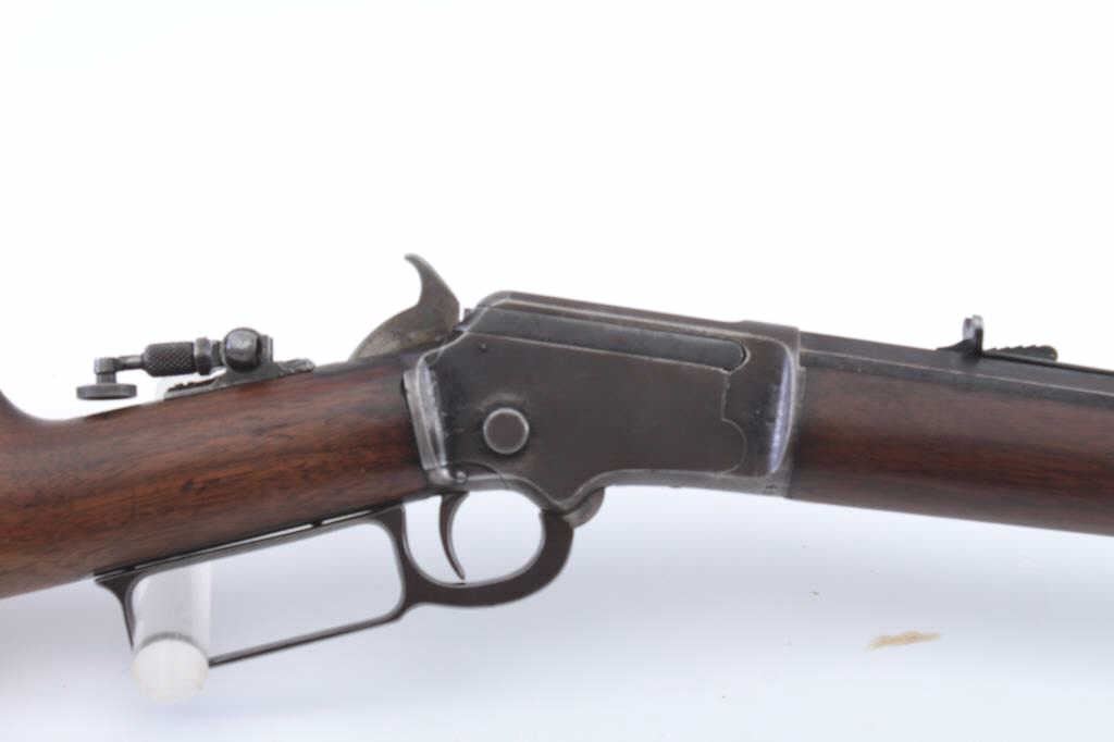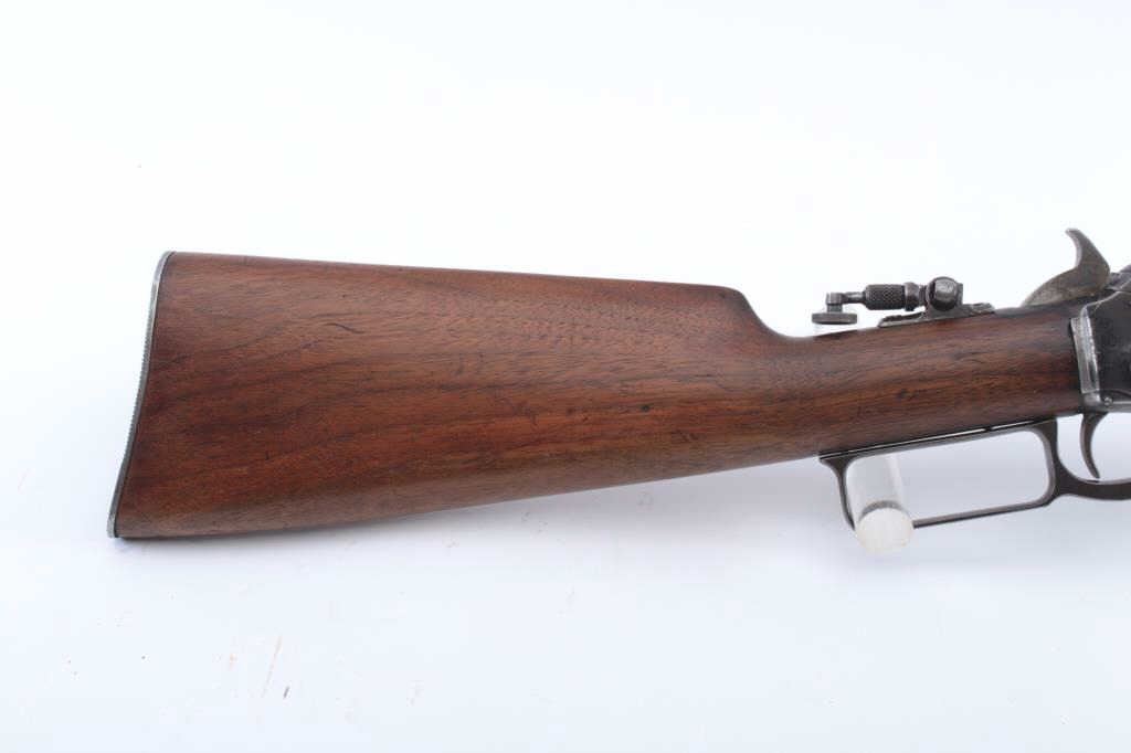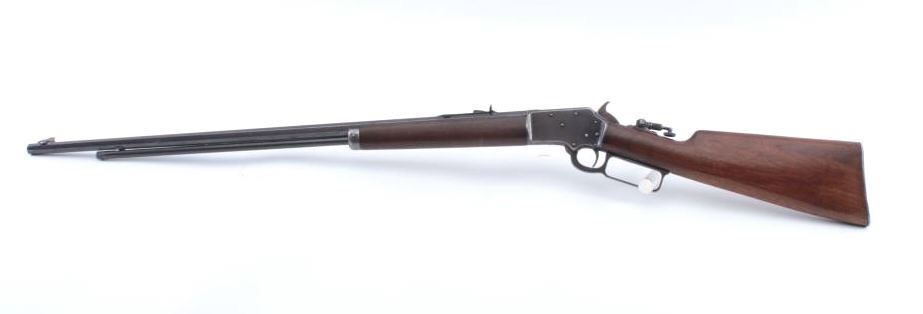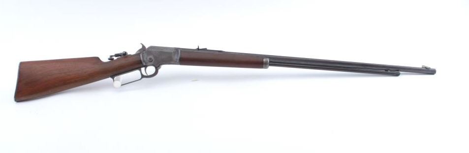Marlin Model 97 Take Down lever action rifle, .22 caliber, Serial #414665. The rifle is in good overall condition with a 28” octagon barrel with a ¾ length magazine tube and a German silver knife blade front sight. Thebarrel and magazine are a pleasing plum patina with sharp edges. The receiver drifting from muted blue to brown patina with bright blue on the bolt and muted case hardening on the hammer. A period tang sight has been added during the period of use. The smooth wood stocks are in good condition with dents and mars. The butt stock ends with a ribbed steel butt plate. The bore is fair, the action functions and the markingsare sharp. Est.: $350-$700. (C+R).