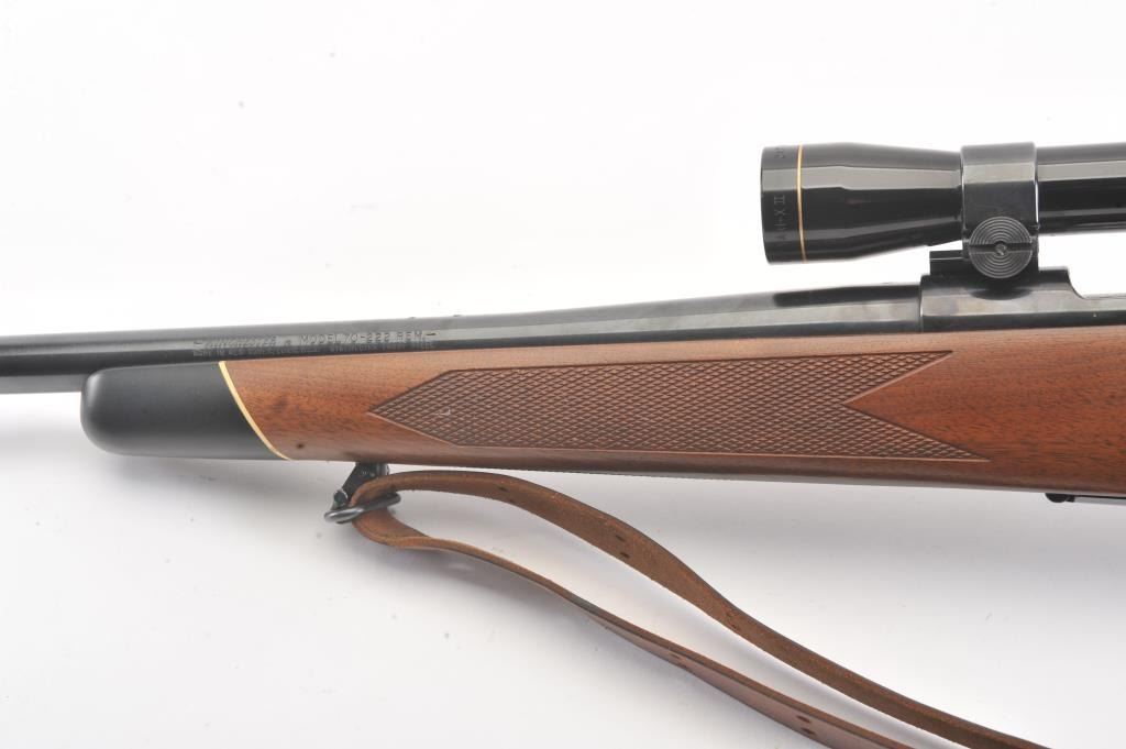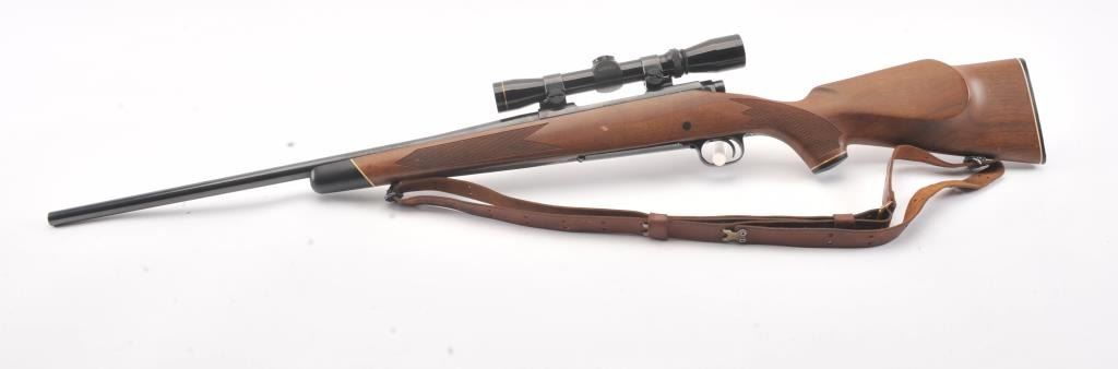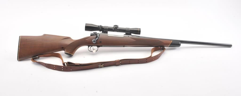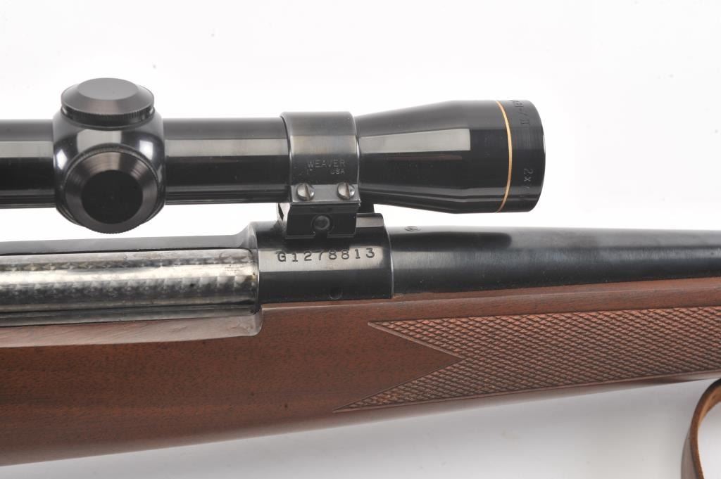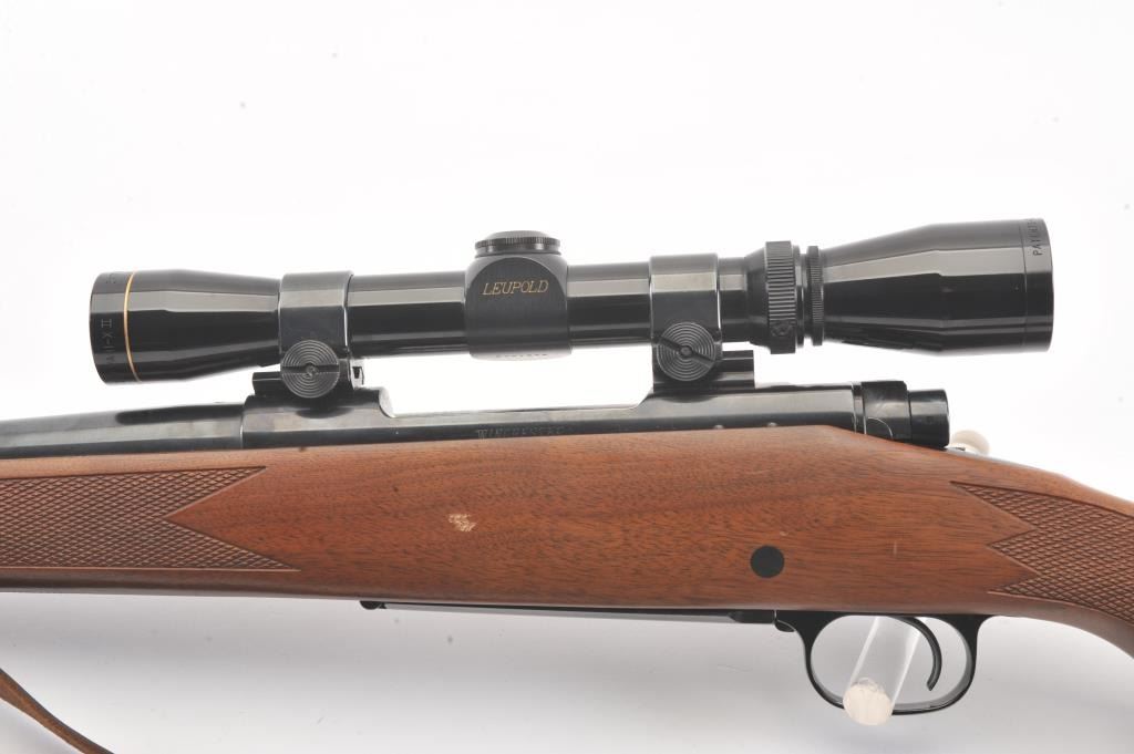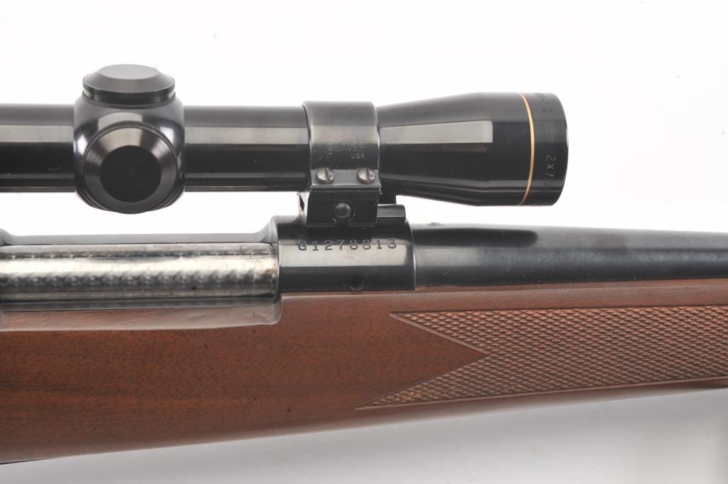 Winchester Model 70 bolt action rifle, #G1278813, .222 Rem cal., 21 3/4" barrel, blued finish, with checkered walnut stock, sling swivels, leather sling and mounted with a Leupold 2x7 Vari-X II scope. Rifle is invery good condition overall, 98% original blue remains, barrel is drilled and tapped for sights. Strong markings. Bore is bright, action is good. Stock is fine plus with minor nicks, scratches and dings. Optics are good. (C&R) Est $700-1400