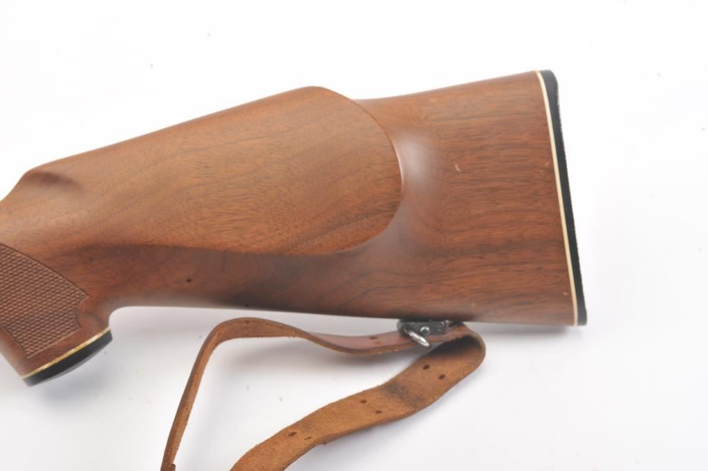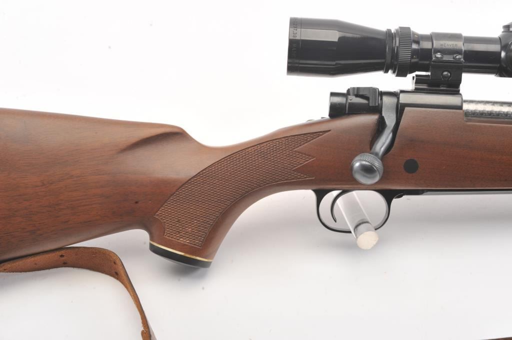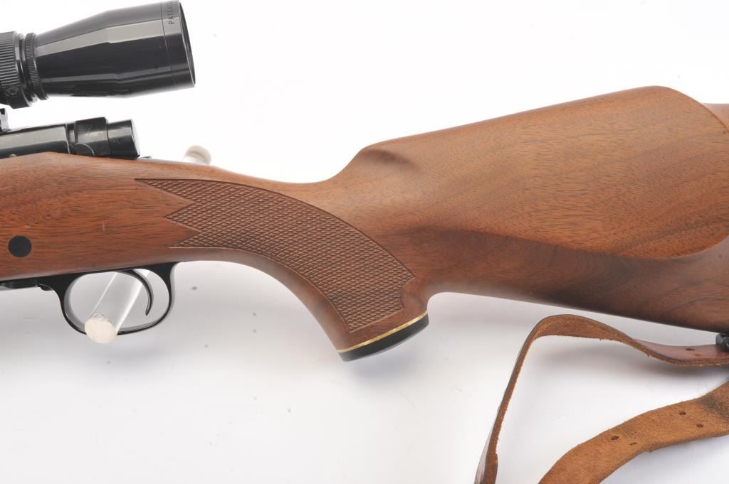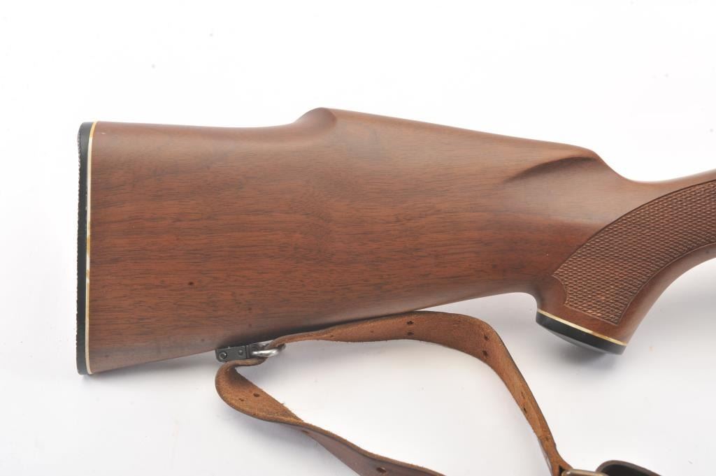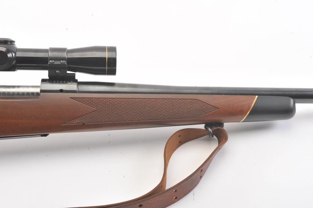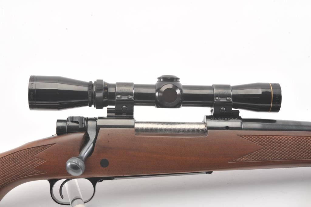 Winchester Model 70 bolt action rifle, #G1278813, .222 Rem cal., 21 3/4" barrel, blued finish, with checkered walnut stock, sling swivels, leather sling and mounted with a Leupold 2x7 Vari-X II scope. Rifle is invery good condition overall, 98% original blue remains, barrel is drilled and tapped for sights. Strong markings. Bore is bright, action is good. Stock is fine plus with minor nicks, scratches and dings. Optics are good. (C&R) Est $700-1400
