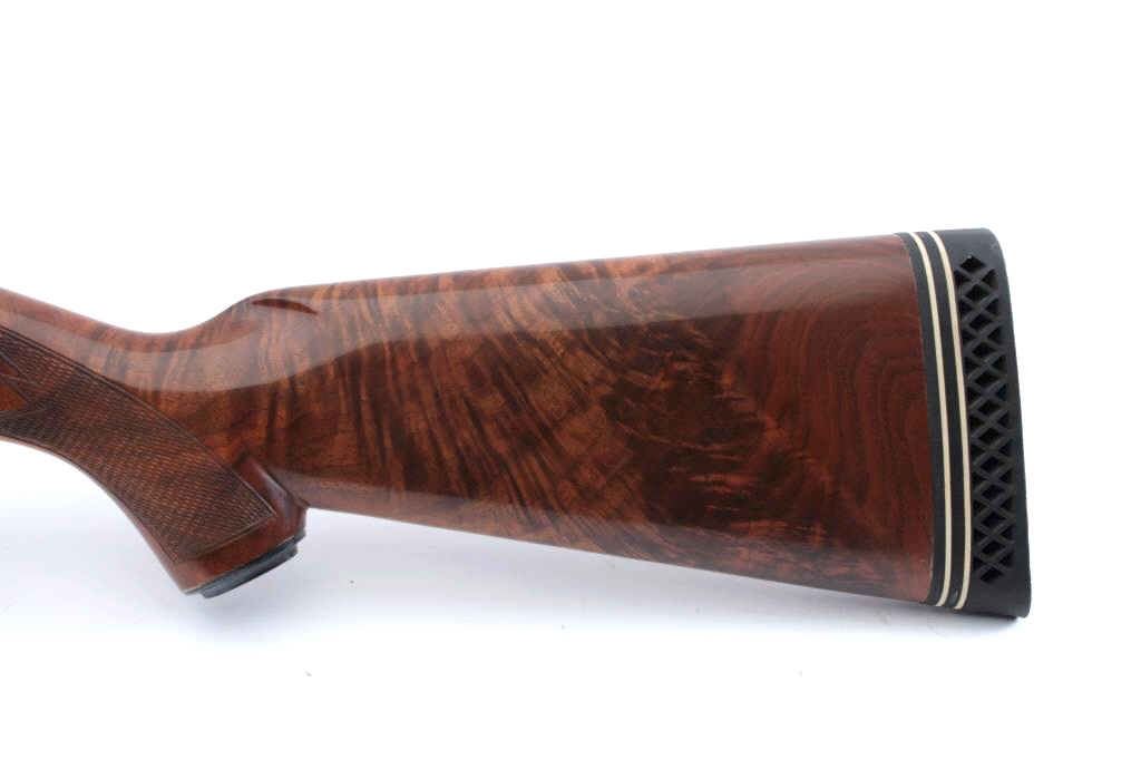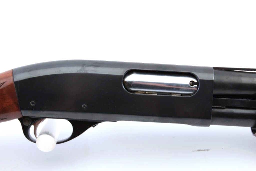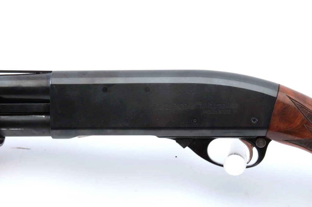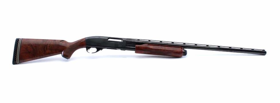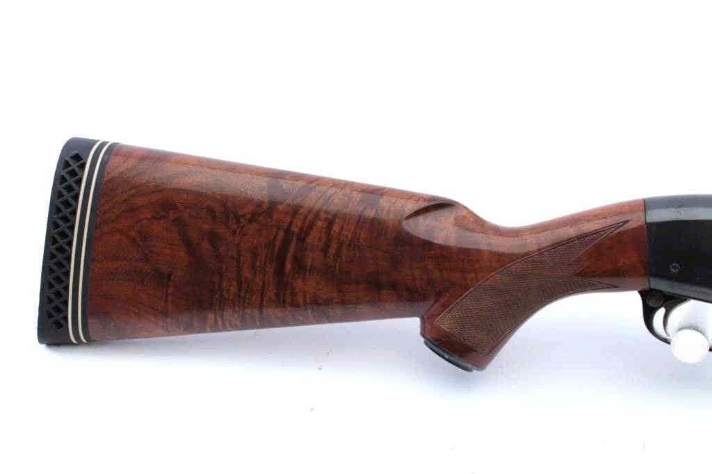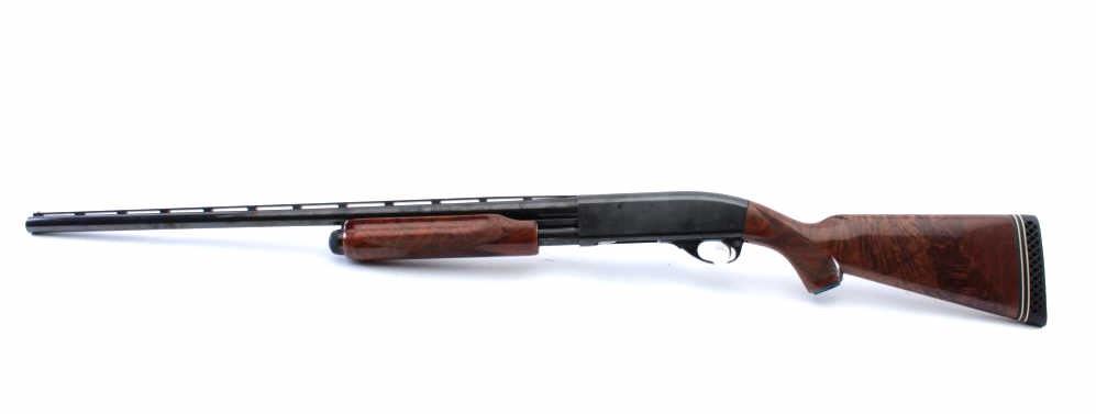 Remington Model 870TC Wingmaster pump shotgun, #588580V, 12 Ga, 2 3/4" chamber, 25" vent rib barrel, screw in chokes (full), bead sights, checkered deluxe walnut stock with rubber recoil pad. Shotgun is in fineplus condition overall, retaining over 98% original blue, with minor indentations on the right side of the receiver behind the ejection port. Bore is good, action is very good. The stock is very good overall, there is light scratches, but no chips or losses. Length of pull is 14 1/2" , 13 1/4" to the end of the wood. (Modern) Est. $500-1000