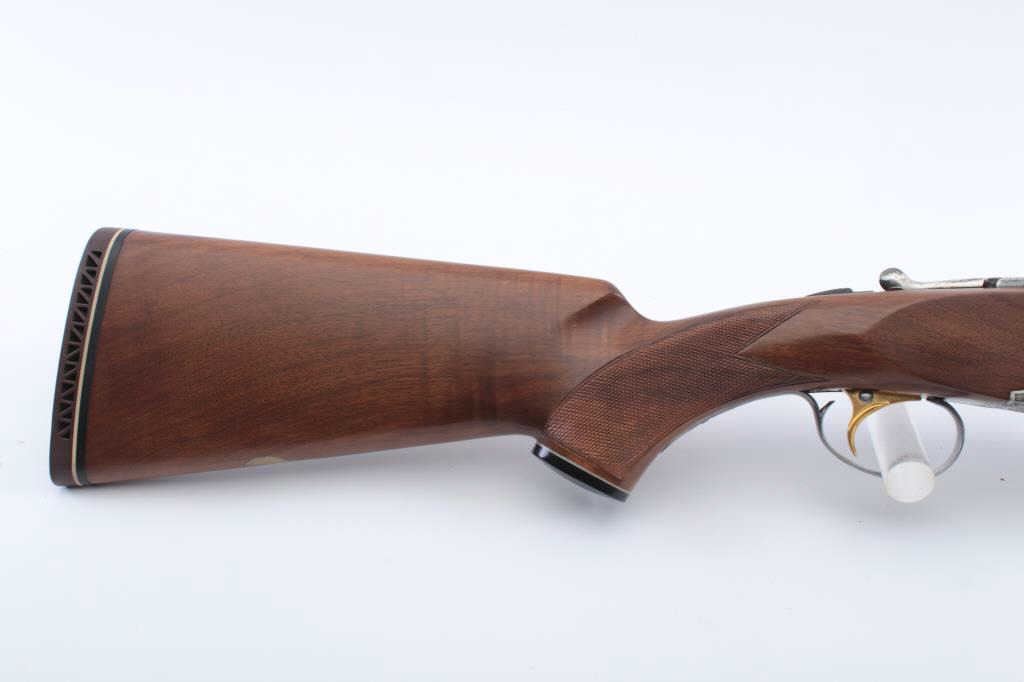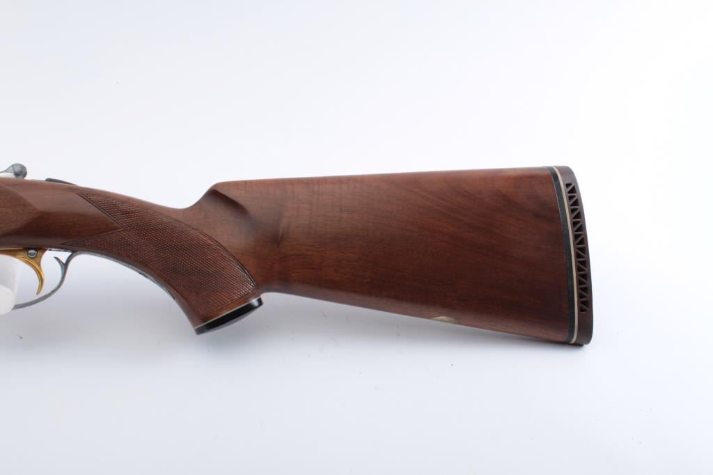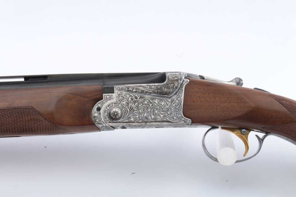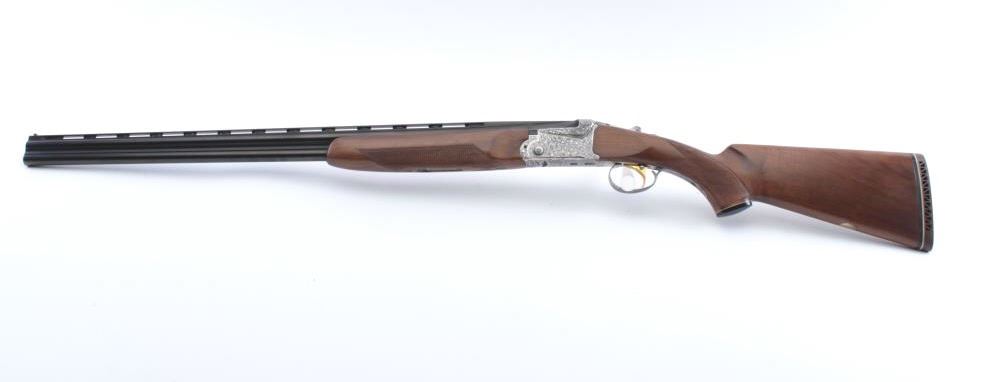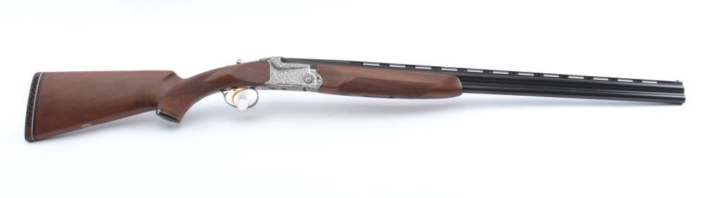 Ithaca Model 600 O/U shotgun, 28 gauge, Serial #S6609037. The shotgun is in excellent overall condition with 28” barrels with a full-length ventilated rib and ivory bead front sight. The barrels retain 99% ofthe blue finish with only light handling marks. The coin finished receiver is nicely relief engraved with a single gold trigger. The checkered wood stocks are in excellent condition with a blank escutcheon plate and a ventilated rubber recoil pad providing a 14” LOP. The bores are good, the action is crisp and the markings are sharp on this lightly used Ithaca. $500-$1,000. (Modern).