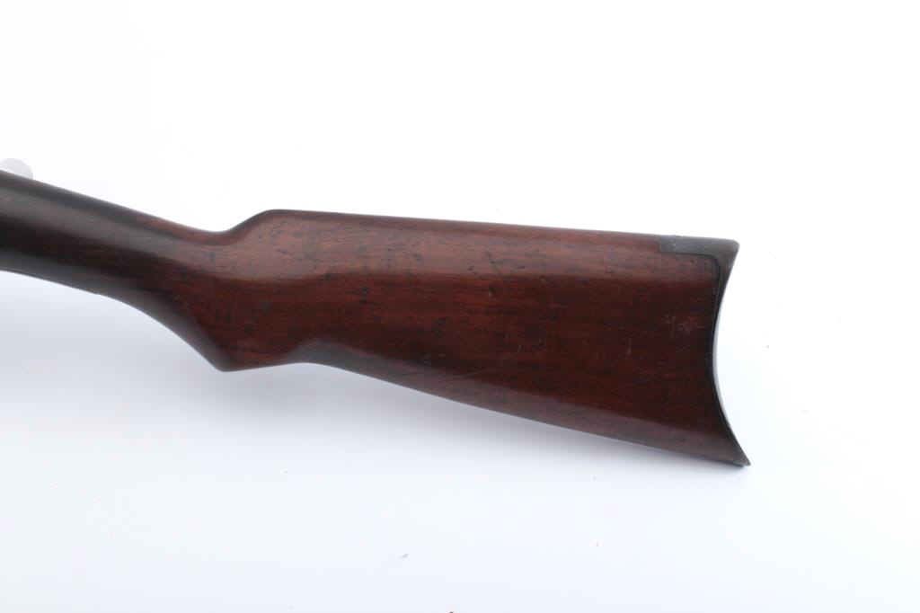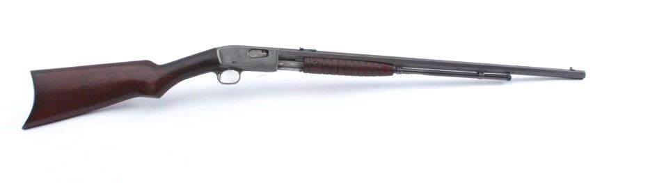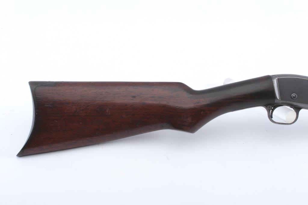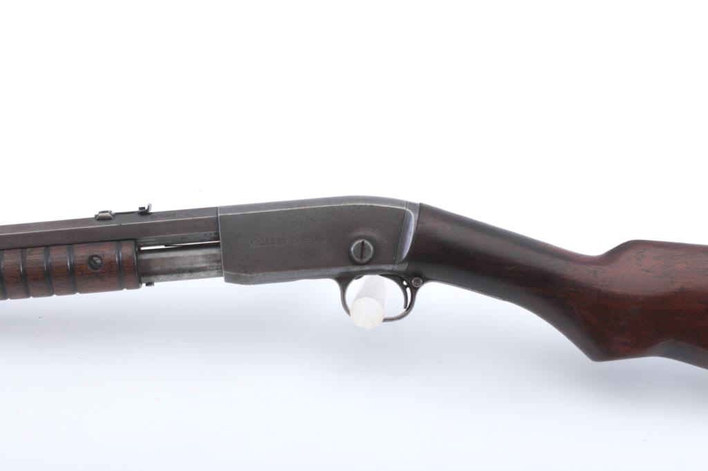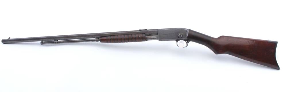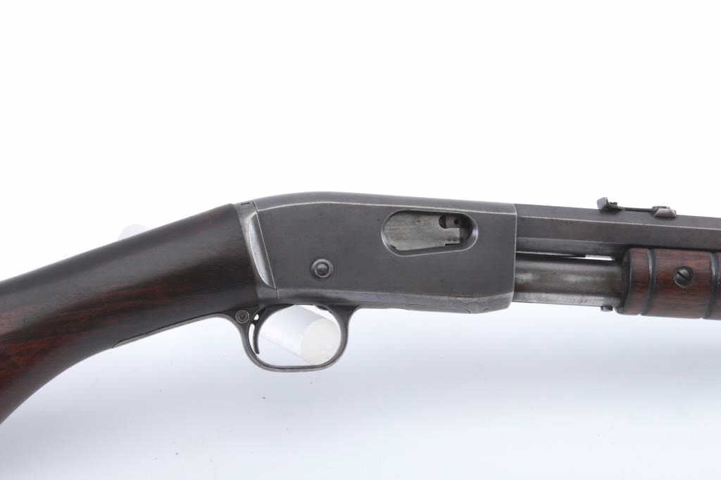 Remington Gallery Special takedown pump rifle, .22 Short caliber, Serial #45886. The rifle is in very good overall condition with a 24” octagon barrel with a ¾ length magazine. The rifle retains the majority ofthe drifting blue finish going to plum patina marked, “GALLERY SPECIAL”. The rifle has sharp edges and light scratches. The smooth wood stocks are in good condition with a smooth steel crescent butt. The bore isfair, the markings are legible and the action is crisp. Est.: $250-$500. (C+R).