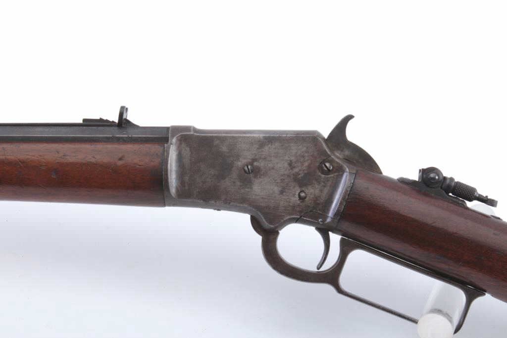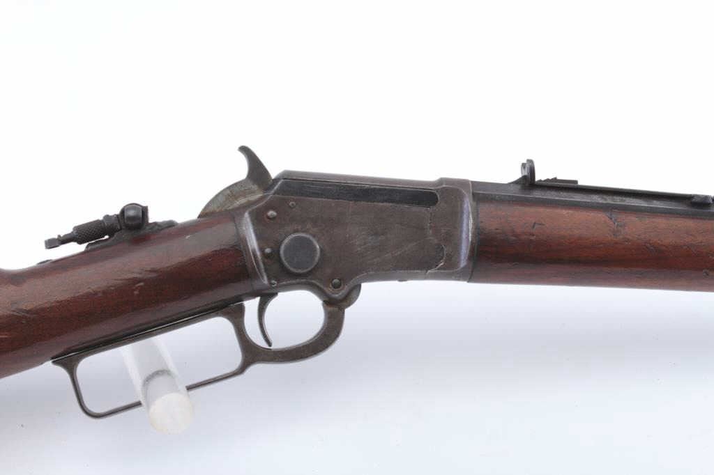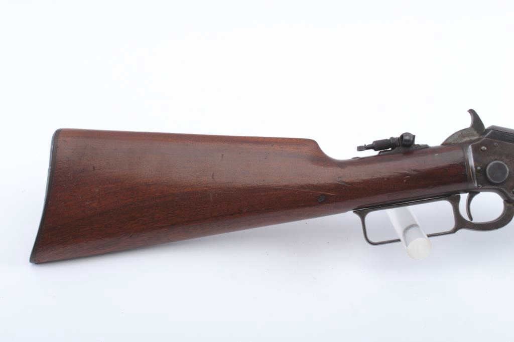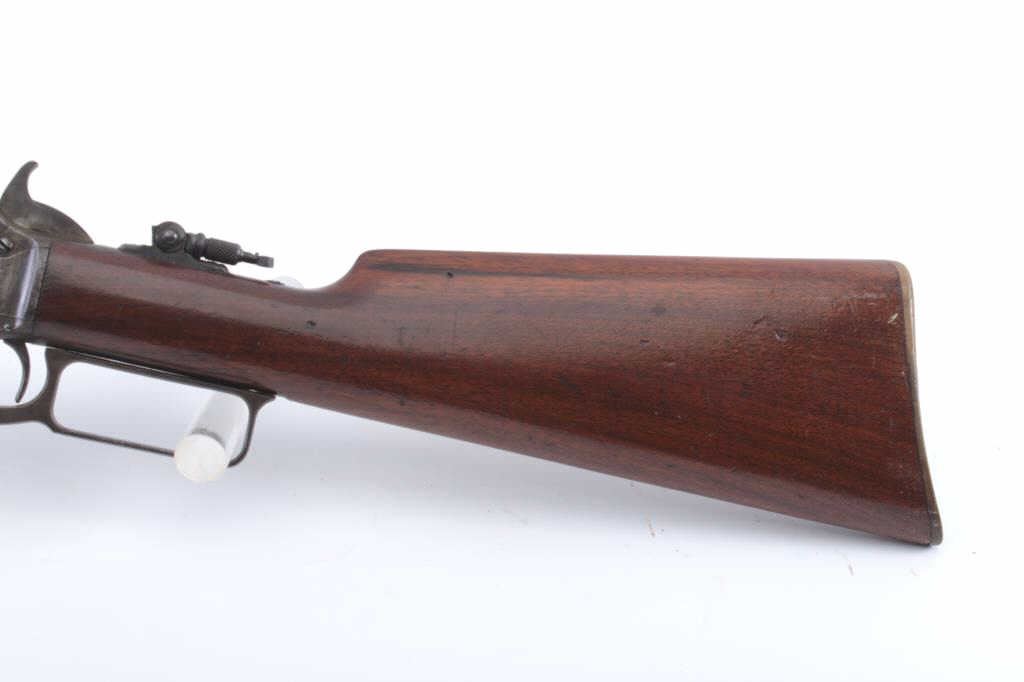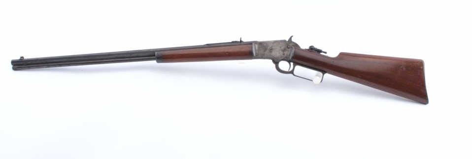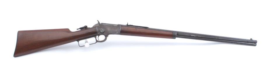 Marlin Model 1897 Take Down lever action rifle, .22 caliber, Serial #219471. The rifle is in good overall condition with a 24” octagon barrel with a full-length magazine tube. The barrel and magazine have both gone to a dark patina. The barrel is inscribed on the top flat, “PAPA TO MAMIE 1905”. The receiver has gone to a mixture of brown patina and toning case hardening with bright blue on the bolt. A period tang sight hasbeen added during the period of use. The smooth wood stocks are in good condition with dents and mars. The butt stock ends with a hard rubber Marlin marked butt plate. The bore is fair, the action functions and themarkings are sharp. Est.: $250-$500. (C+R).