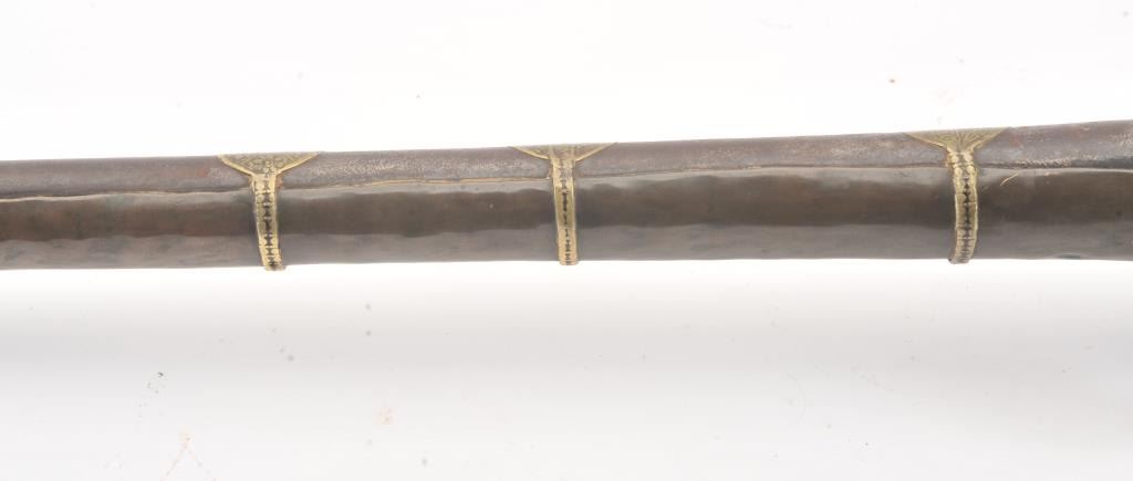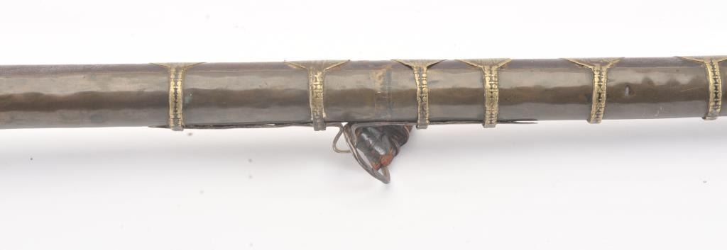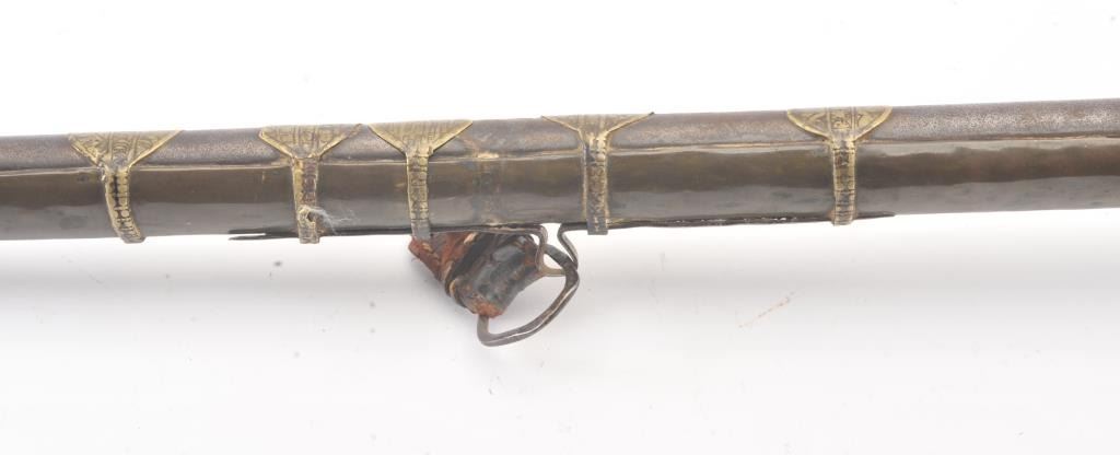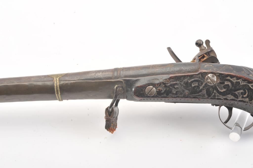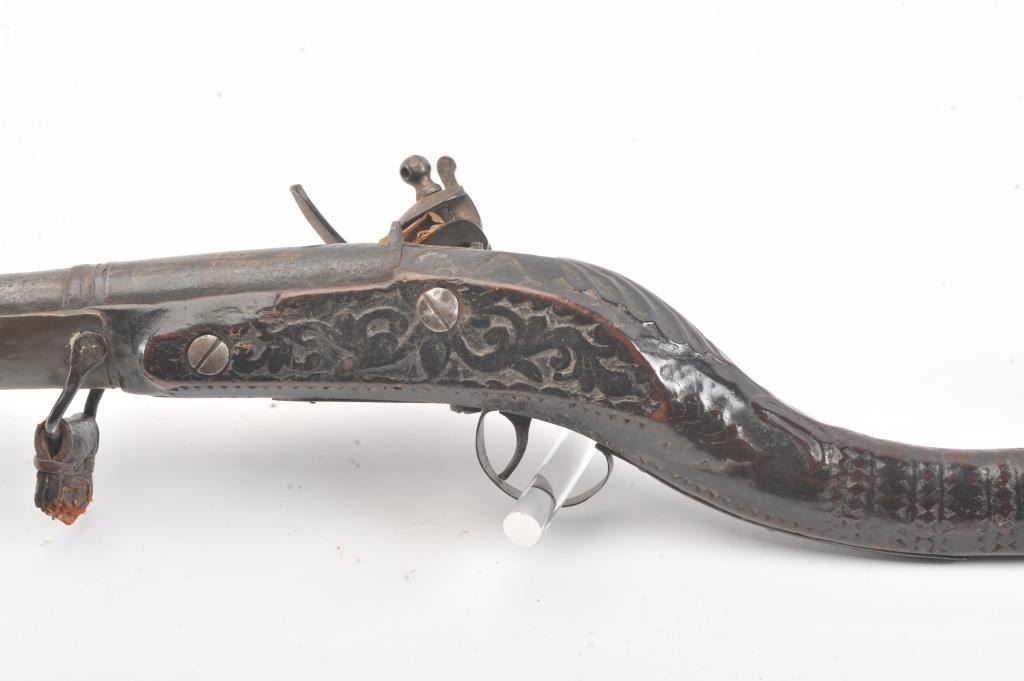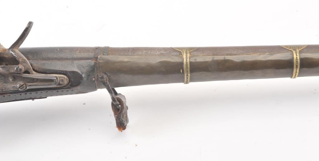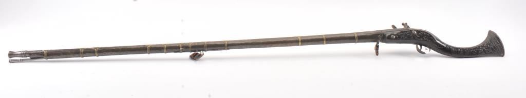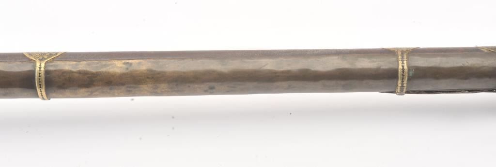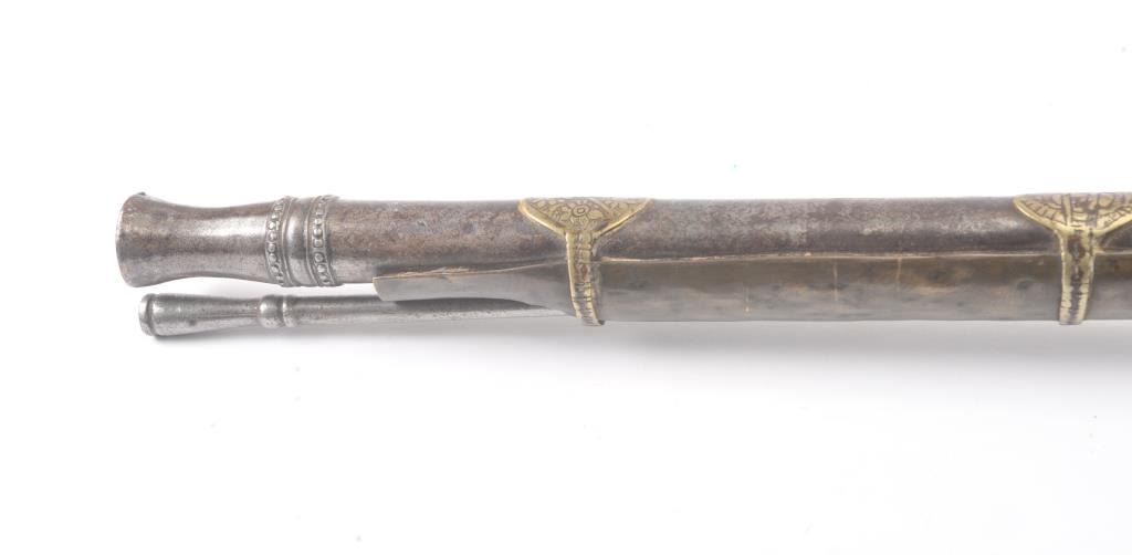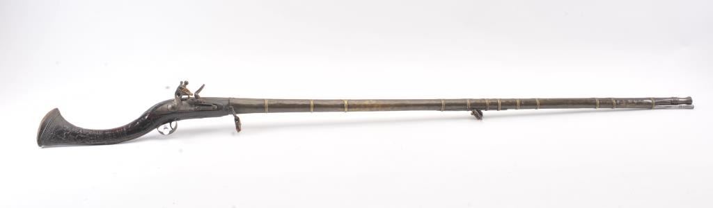 19th century flintlock "Camel Gun" with carved stock and sheet brass fore stock with fancy engraved bands. Shows wear and use but good overall and definitely over 100 years old and a genuine antique. Measures 69"overall with 59" barrel of approximately .60 caliber with flared muzzle. Period ramrod. Far better than average for this type. (Antique) Est.: $400-$800
