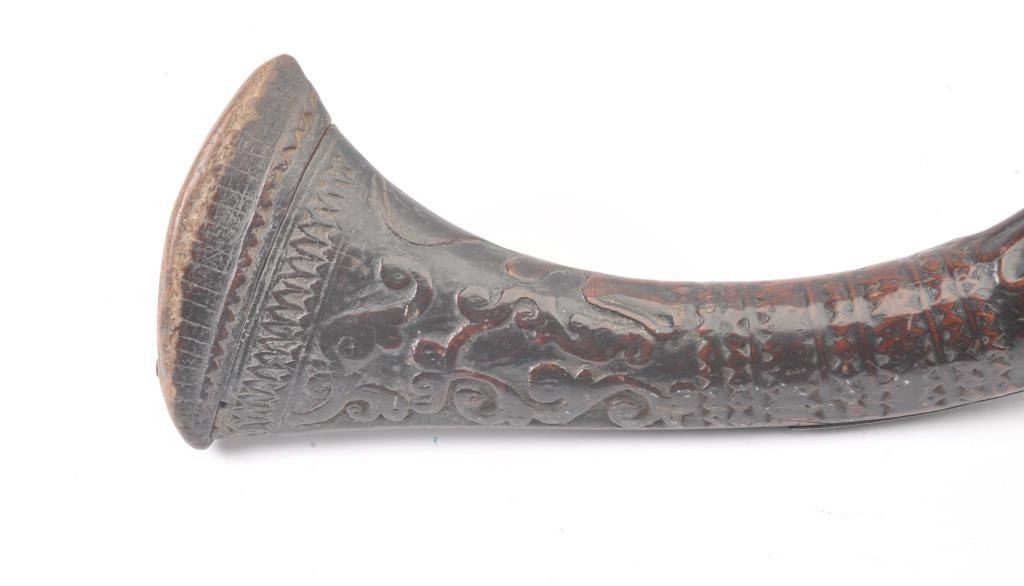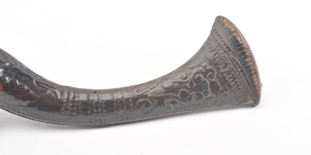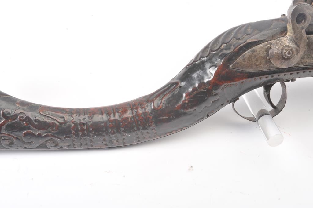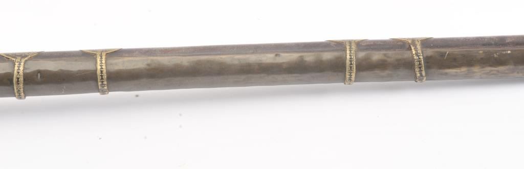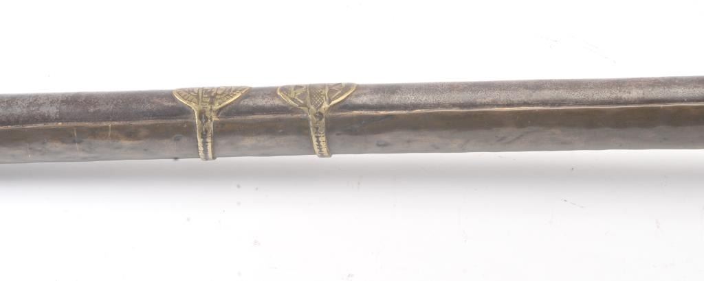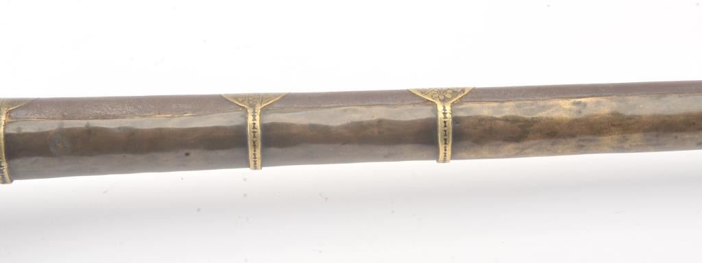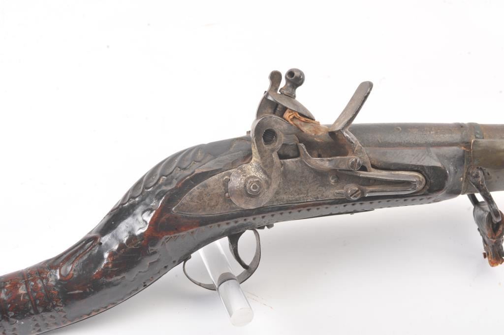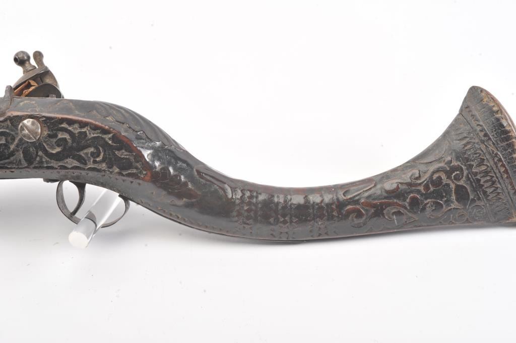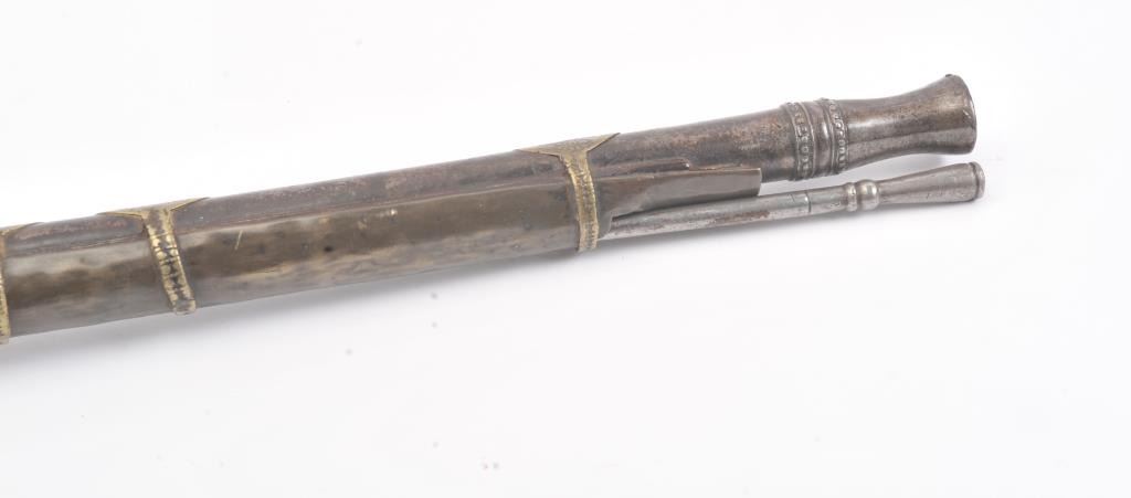 19th century flintlock "Camel Gun" with carved stock and sheet brass fore stock with fancy engraved bands. Shows wear and use but good overall and definitely over 100 years old and a genuine antique. Measures 69"overall with 59" barrel of approximately .60 caliber with flared muzzle. Period ramrod. Far better than average for this type. (Antique) Est.: $400-$800