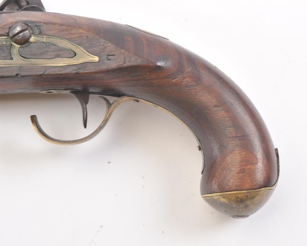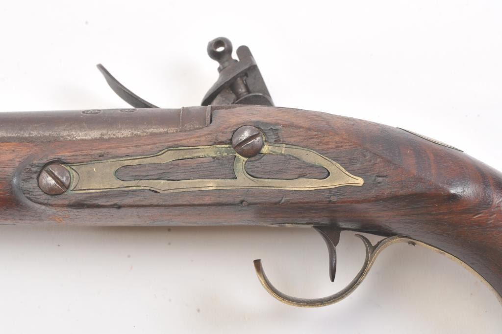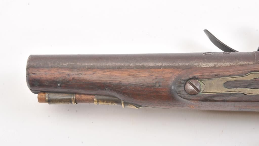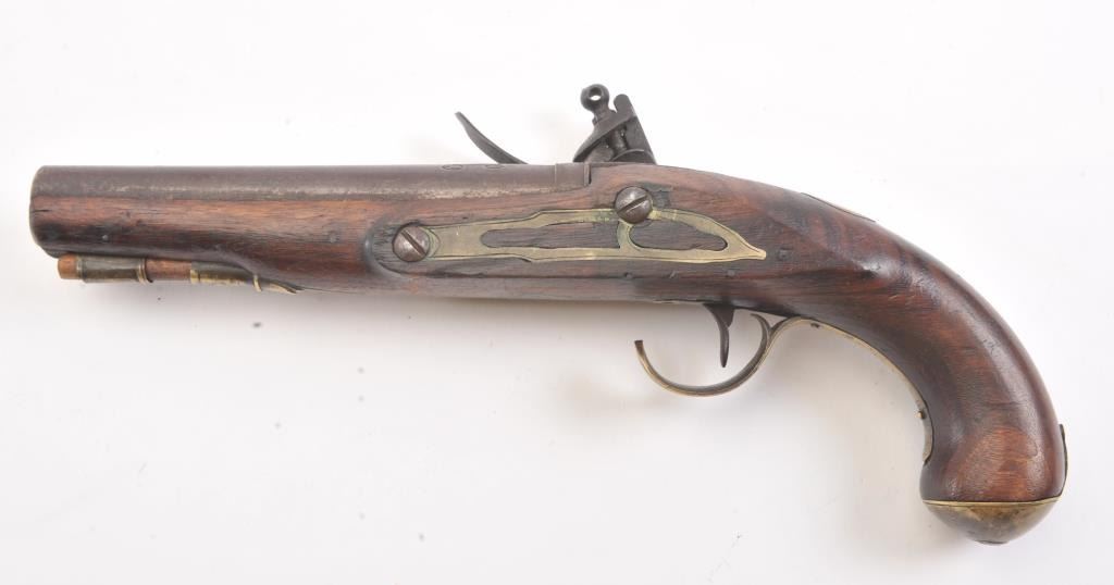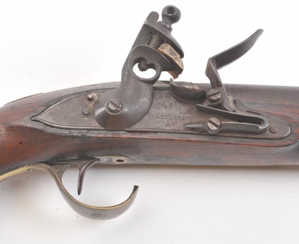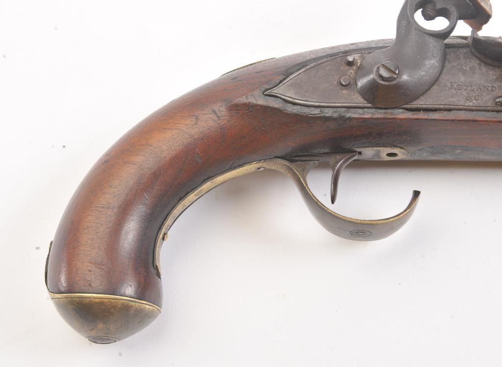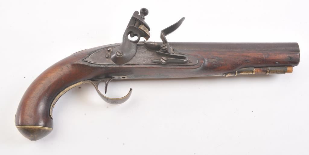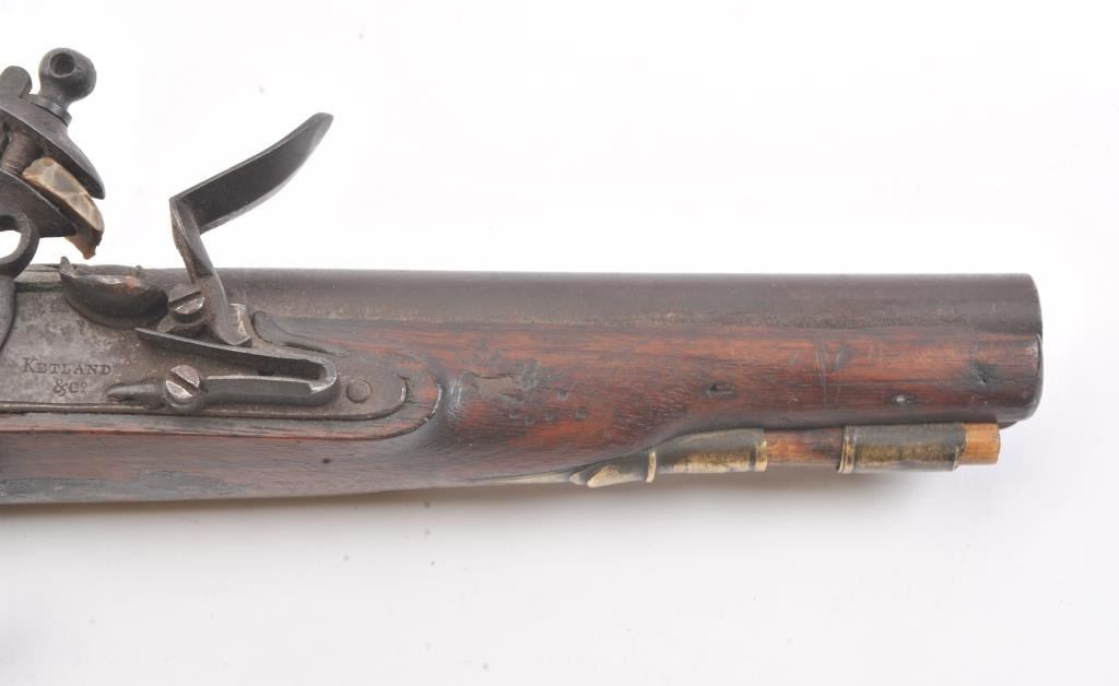 English flintlock fur trade era export pistol marked "Ketland & Co.". Measures 12 3/8" overall with 7 3/4" barrel of approximately .58 caliber smoothbore with brass mounts. The front of the trigger guard was purposely cut away and the stock inlet filled. The barrel shows "V" and "P" proofs and the metal condition is good with deep brown patina showing minor erosion and light to moderate pitting. The lock works but the spring isweak. The stock is god with minor imperfections. Circa about 1800-1830. (Antique) Est.: $300-$600