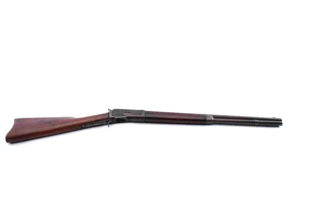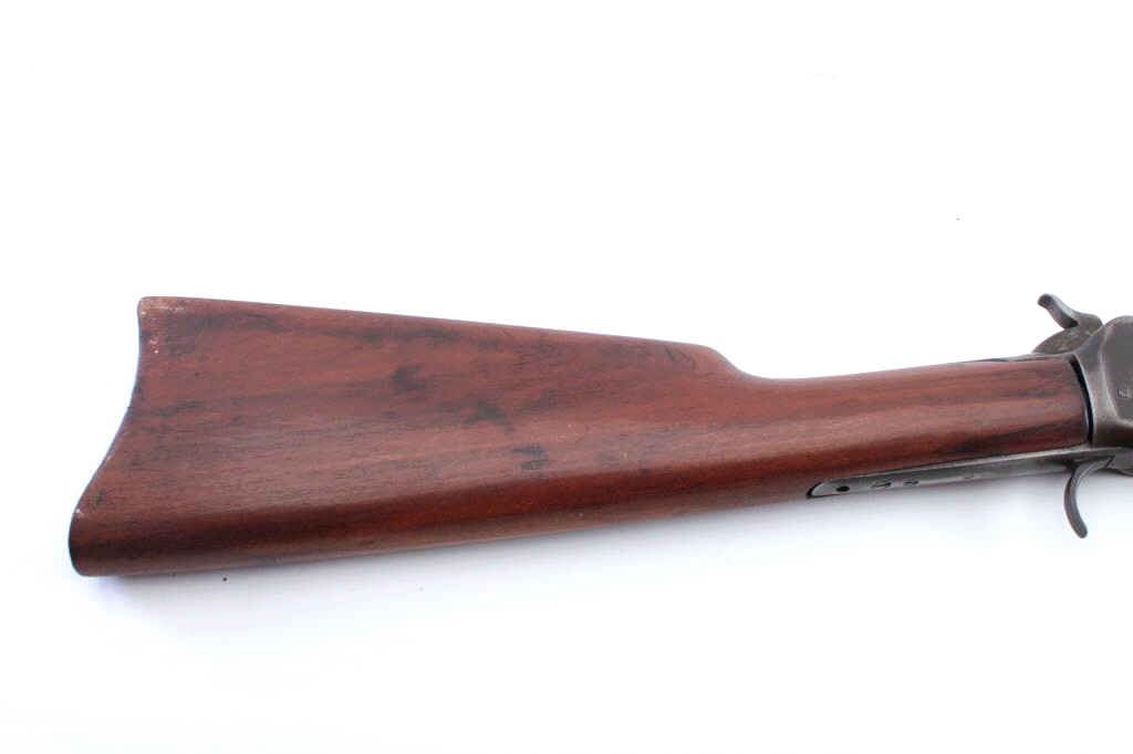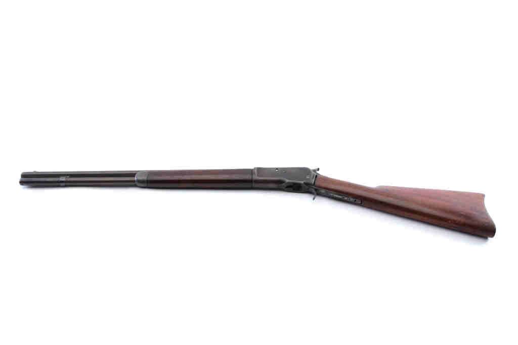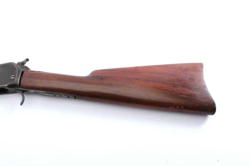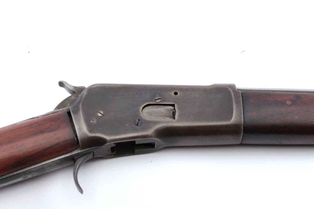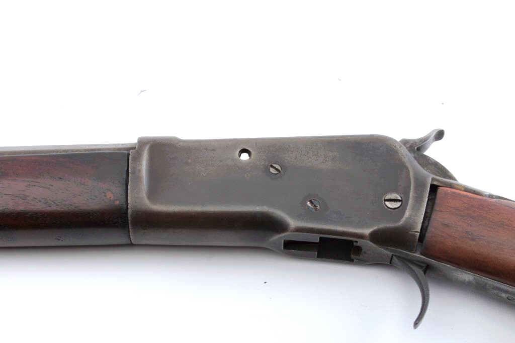 Winchester Model 1892 lever action rifle parts lot. The lot includes a barreled action foe end and butt stock missing the guts of the action. The receiver is Serial #475608 with a 20” barrel and full-lengthmagazine are marked .44 WCF. The metal surfaces have been polished and the serial number is faint. The smooth wood stocks are in good condition. Est.: $100-$200. (C+R).