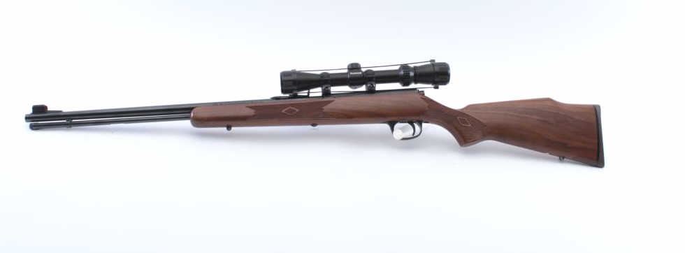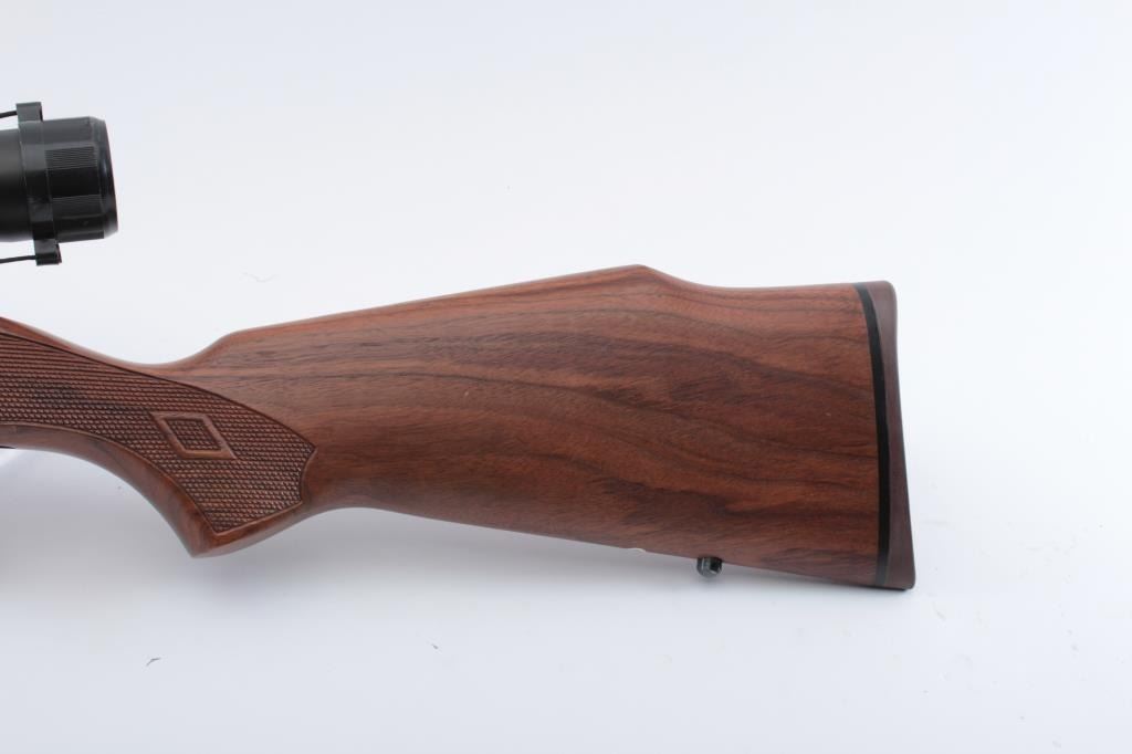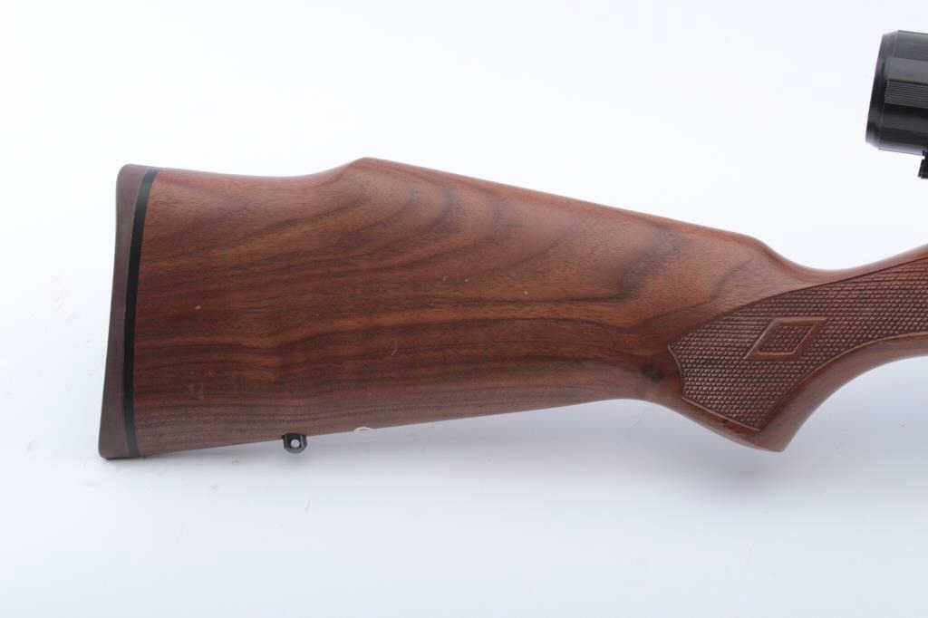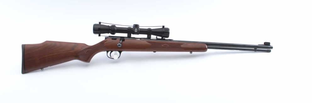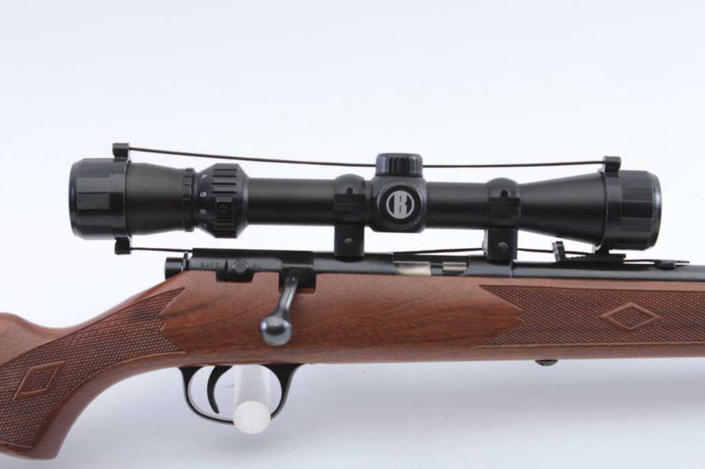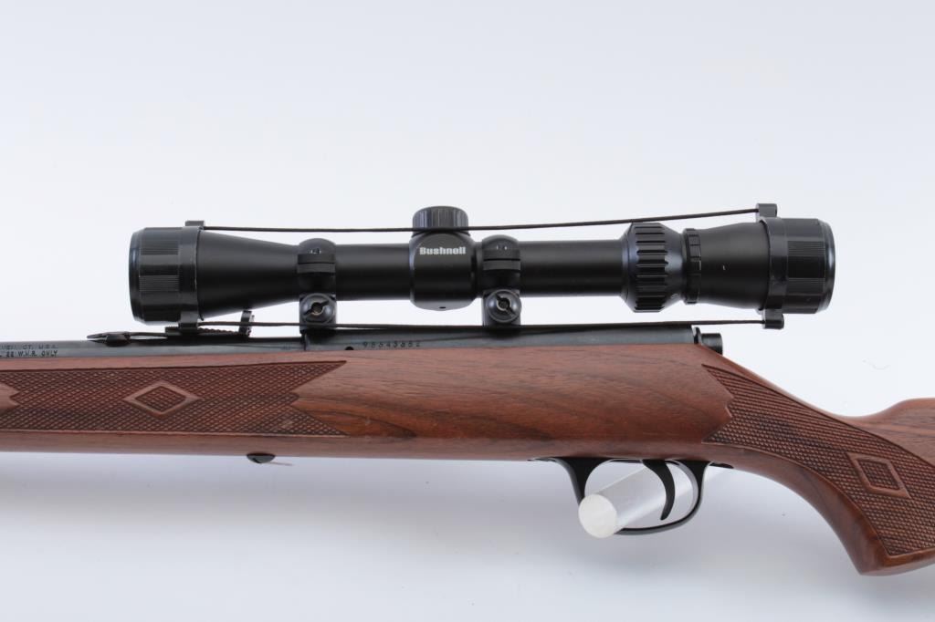 Marlin Model 883 bolt action rifle, #98643682, .22 Mag. cal., 21 3/4" barrel, blued finish, rifle sights, with checkered walnut stock, sling swivel mounts and rubber recoil pad, mounted with a Bushnell 3x9scope. Rifle is in very good condition overall, 98% original blue remains. Bore is mirror bright and minty, action is good. Stock is very good with various minor nicks, scratches and dings. Optics are good.(Modern) Est $125-250