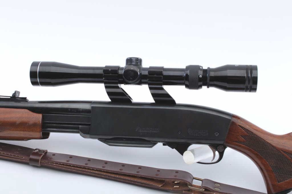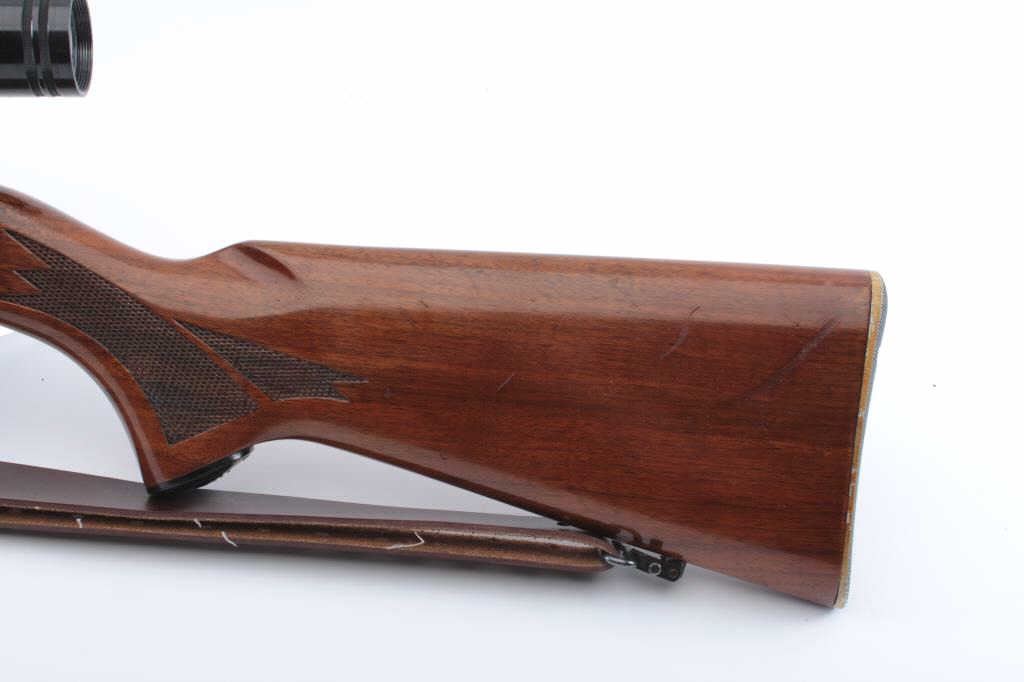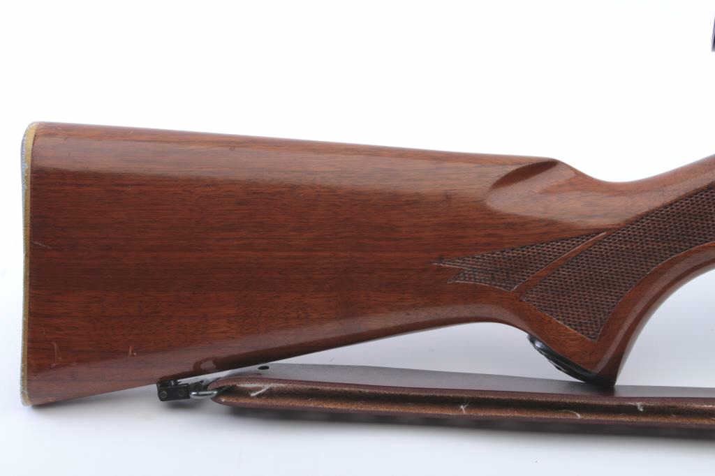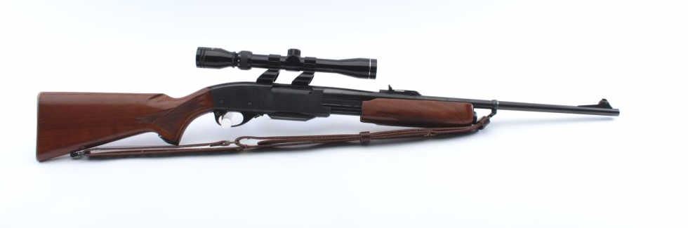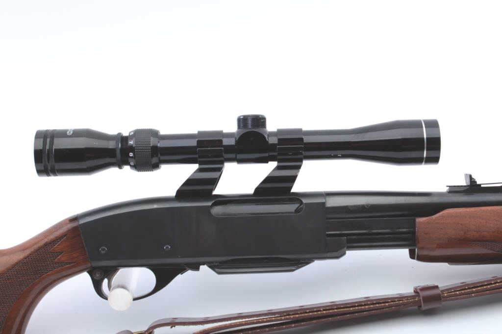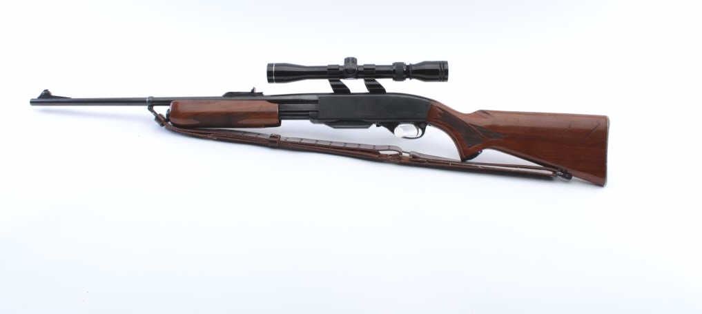 Very rare Remington Model 760 Gamemaster pump action rifle, #418412, .223 cal, 22 1/4" barrel, detachable mag, checkered wood stock with original aluminum butt plate, with sling swivels, leather sling, and mounted with aTasco 3x9 scope. Rifle remains in near fine original condition, retaining approximately 98%+ original finish, receiver and trigger guard with a few light scratches and minor finish loss. Stock is very good plus,buttstock shows scattered scratches and impressions, with a few larger mars to the left side; checkering is excellent. Forend has light impressions in the laquer finish, probably from storage in a boot. Action issmooth and crisp with a minty bore. Optics are bright and clear. Less than 1% of all 760's were in .223 Remington. Mfg 1964. One originall mag. Note: we have seen these priced over $3,000 on collector's lists.(C&R) Est. $400-800