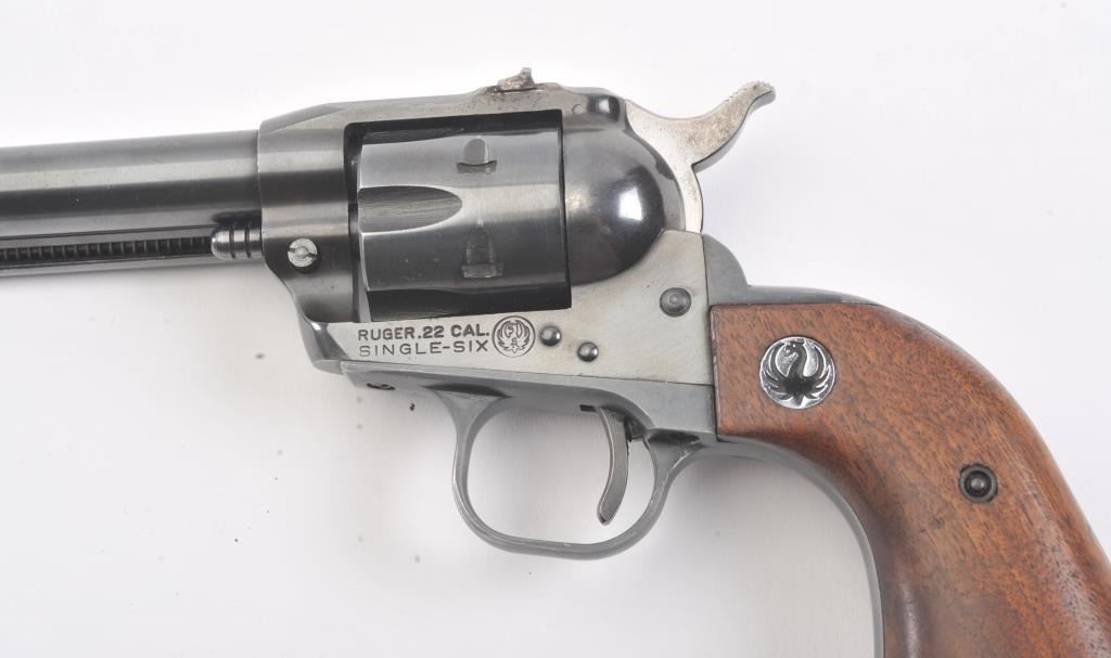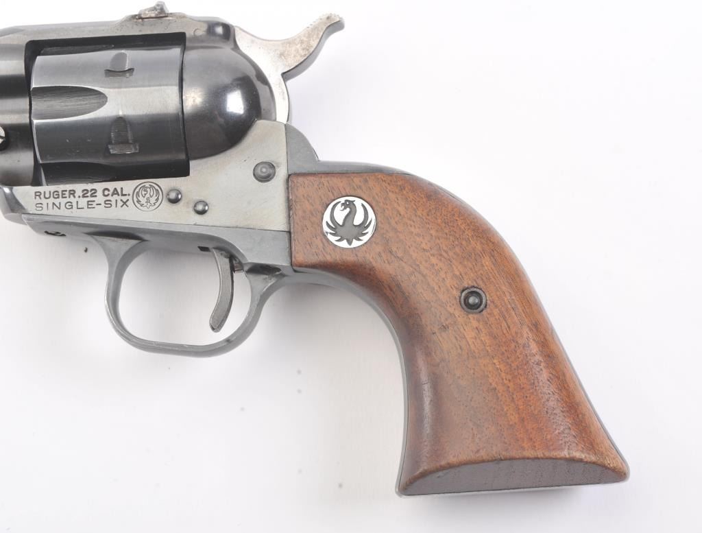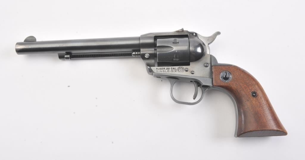 Early Ruger Single Six, #353473, .22 LR, 6 1/2" barrel, blued finish, with black medallion walnut grips. This pre transfer bar safety revolver remails in near fine condition, the finish on the trigger guardand back strap has faded to a gray, there is a large chip out of the front toe of the right grip panel. The pistol retains the majority of its original finish with the exception of the grip strap, and a small area at the muzzle from holster wear. The bore is excellent, the action is crisp. These three screw non transfer bar Rugers are becoming collectable and increasingly hard to find, especially in this condition. (C&R)Est. $300-600