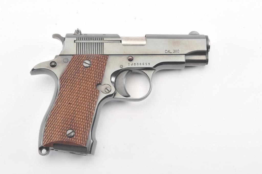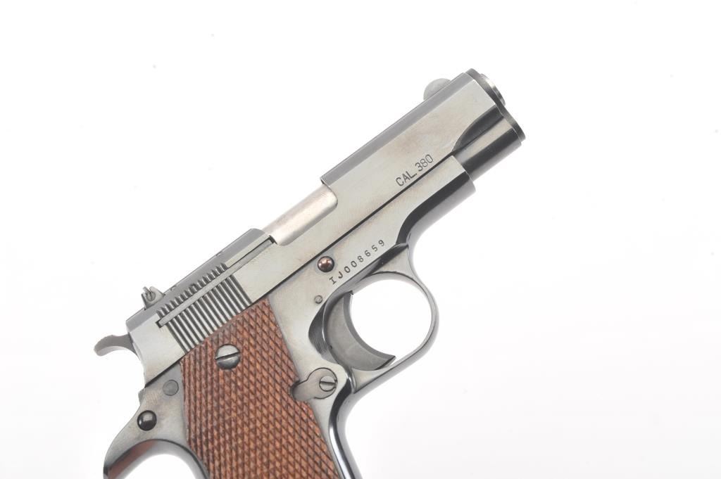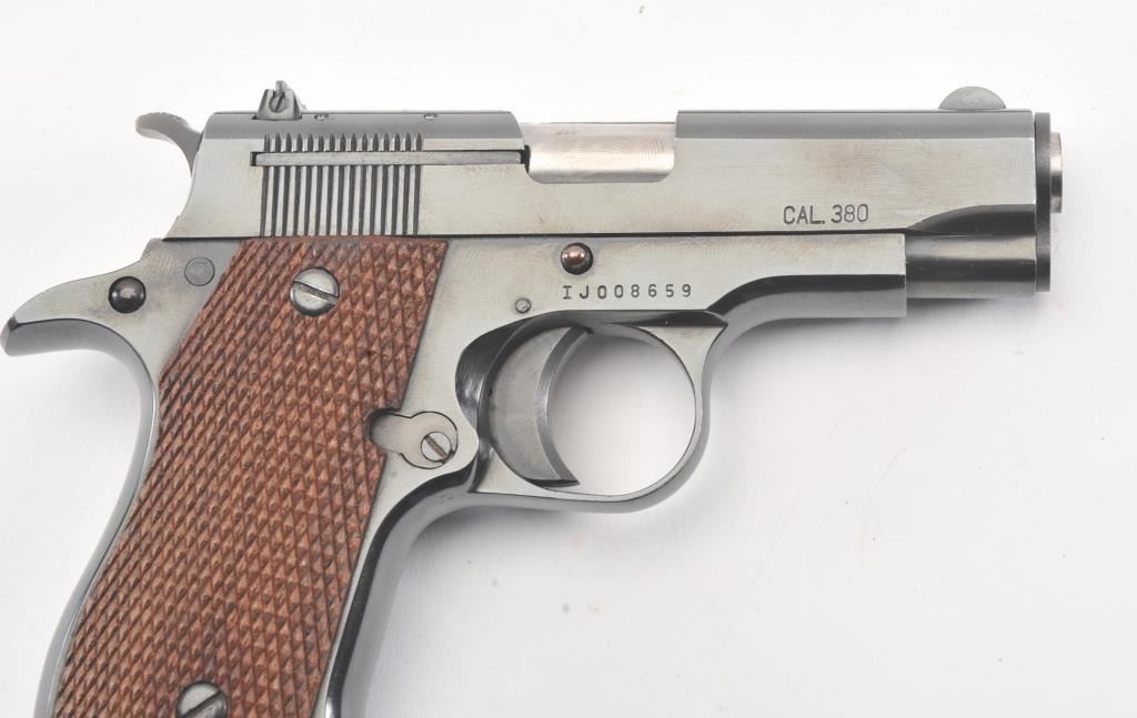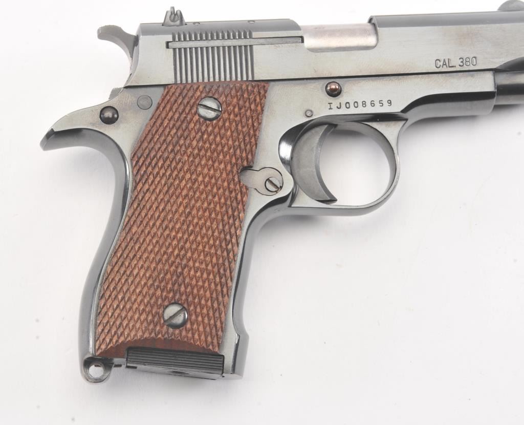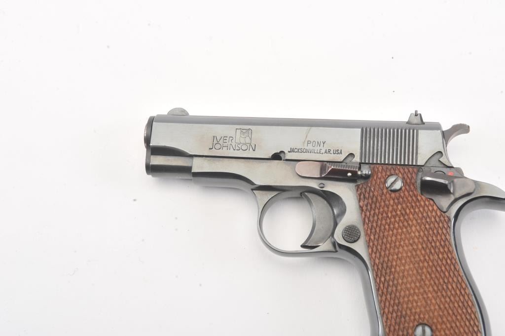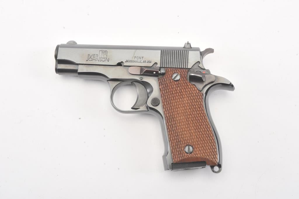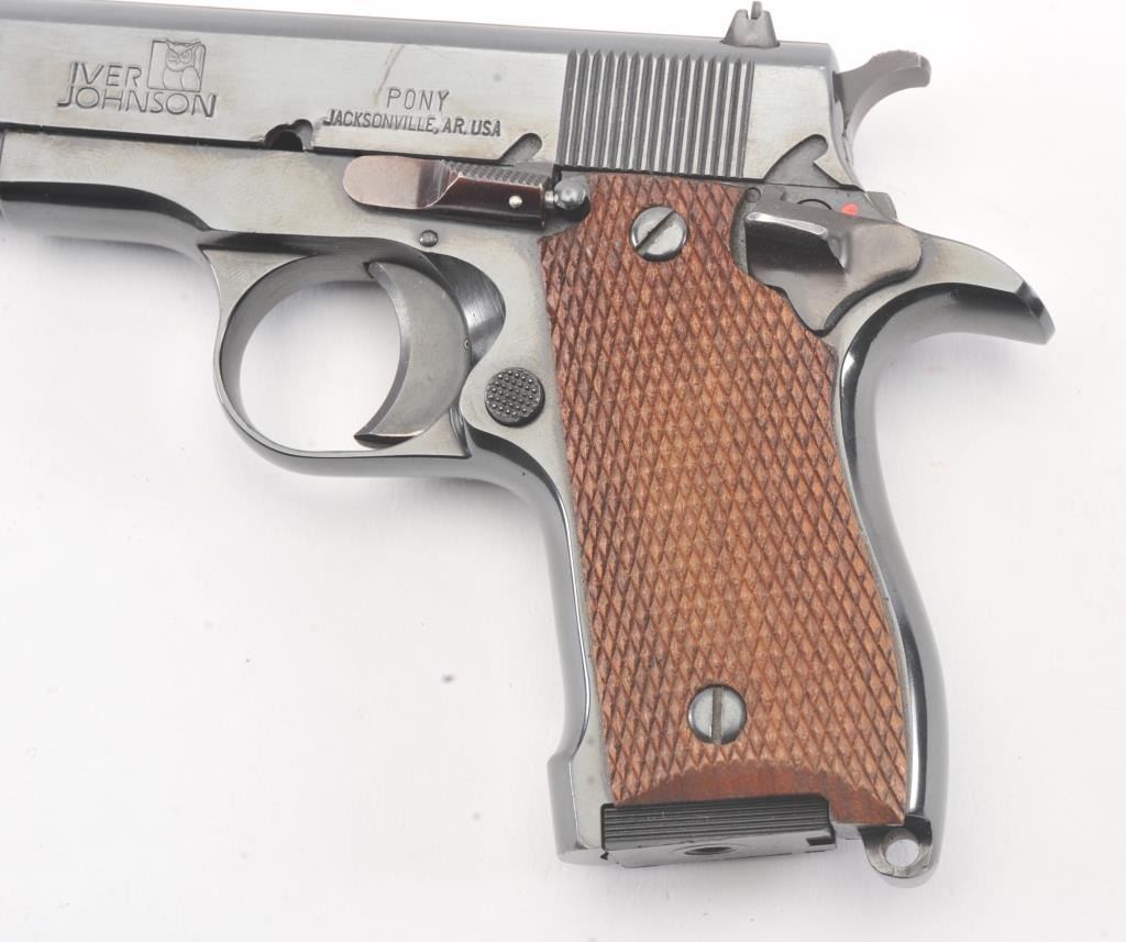 Iver Johnson Pony pistol, #IJ008659, .380 cal, 3 1/4" barrel, blued finish, adjustable rear sight with checkered walnut grips. Pistol is in fine to near excellent condition overall, showing 97-99% original blue, boreis very good, action is crisp. The grips are near excellent with crisp checkering, and no chips, cracks or losses. This out of production pistol is the ideal size for concealed carry. One correct mag. (Modern) Est. $250-500
