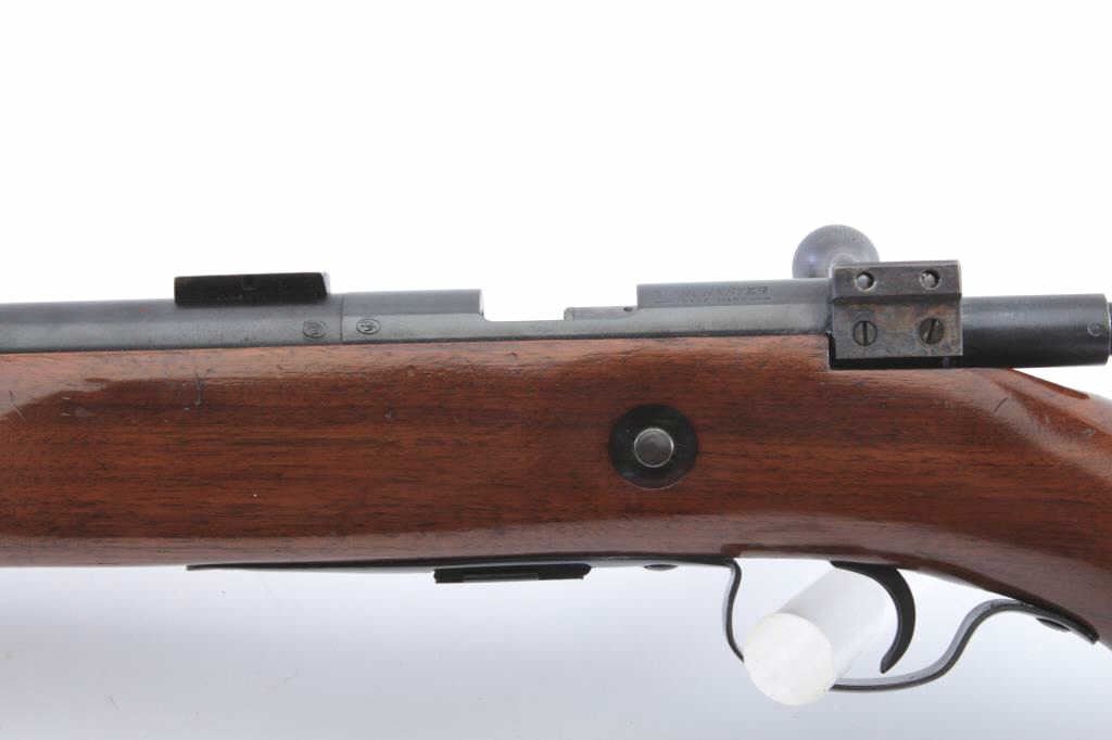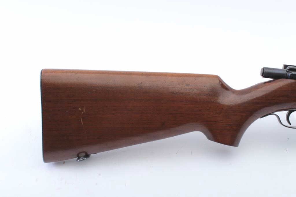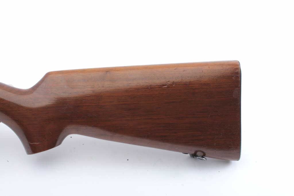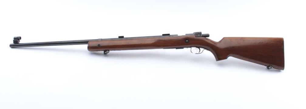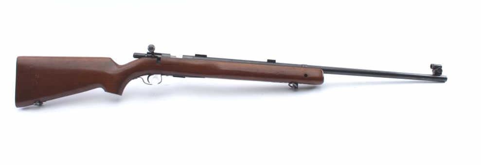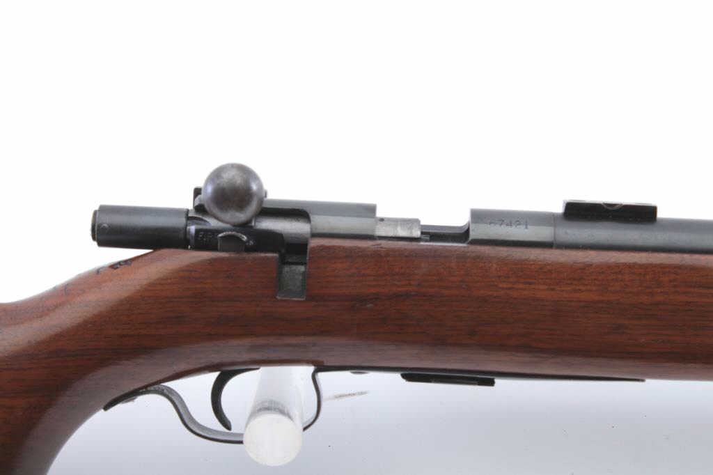 Winchester Model 75 bolt action rifle, #67421, .22 cal., 28" barrel, blued finish, globe front sight, with checkered walnut stock, sling swivels, and blocks for a scope or rear sight. Rifle is in very goodcondition overall, 95-97% original blue remains. Strong markings, receiver was drilled and tapped for receiver sight, and side of stock has been relieved for same. Bore is bright with strong rifling, action is good. Stock is good with scattered minor nicks, scratches and dings. One correct mag. (C&R) Est $350-700