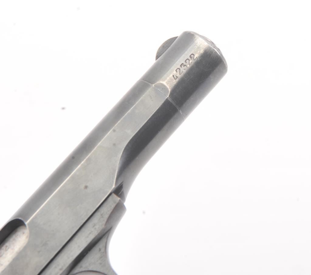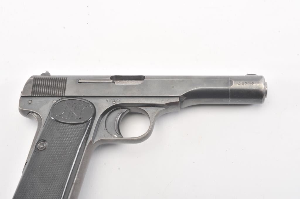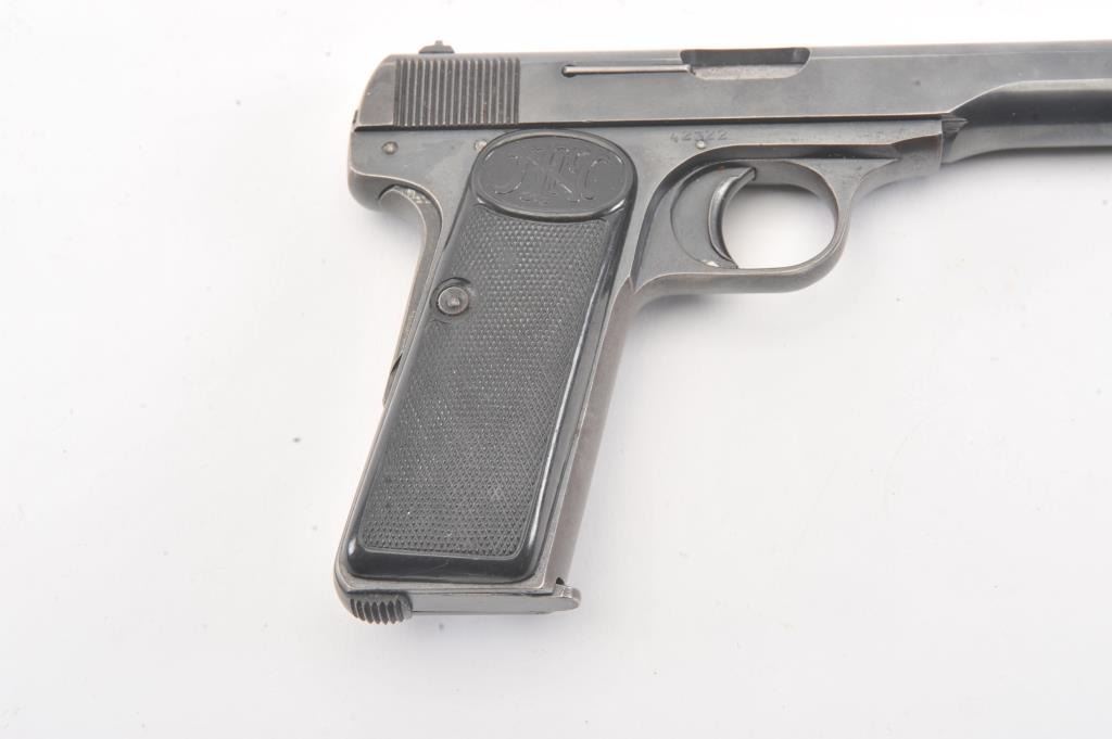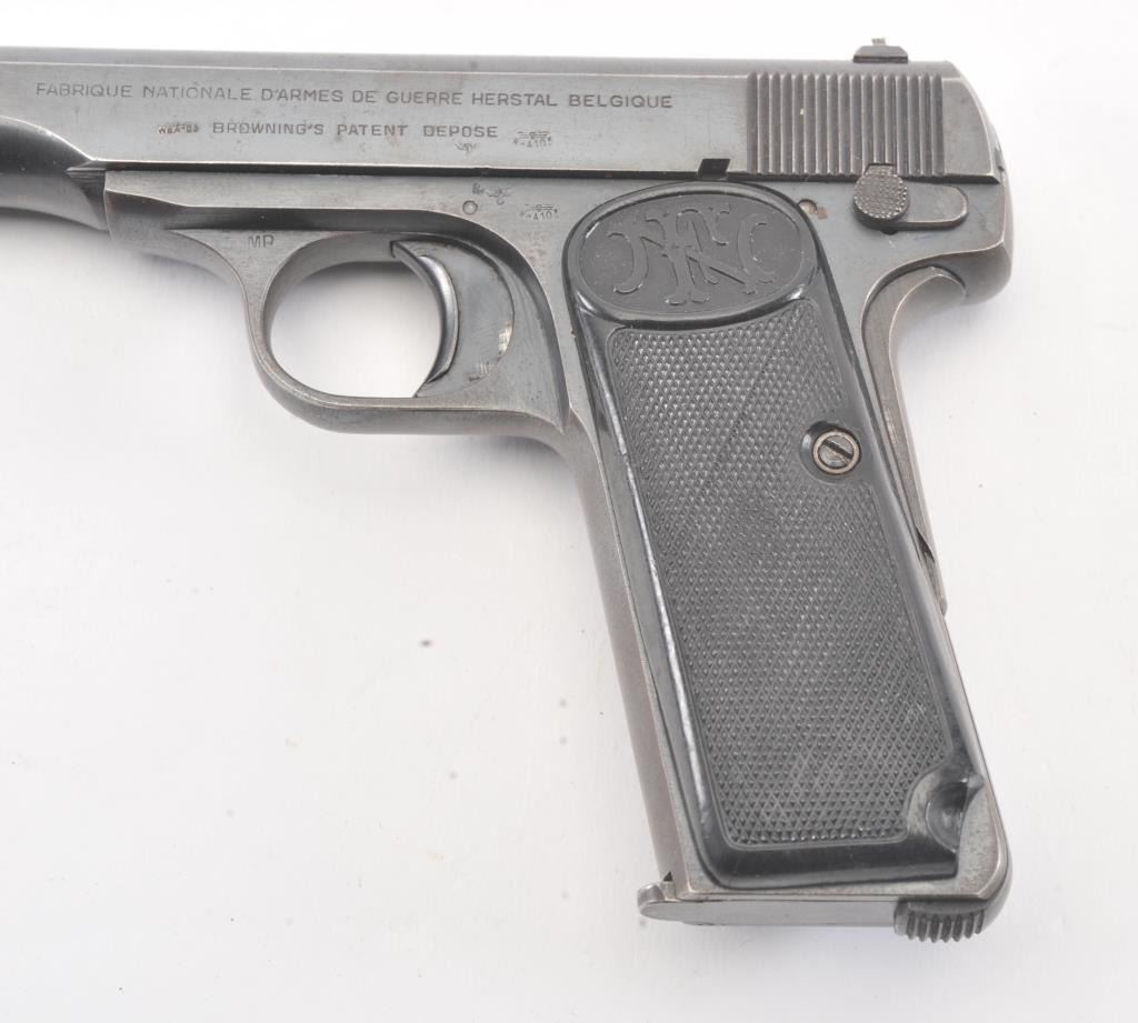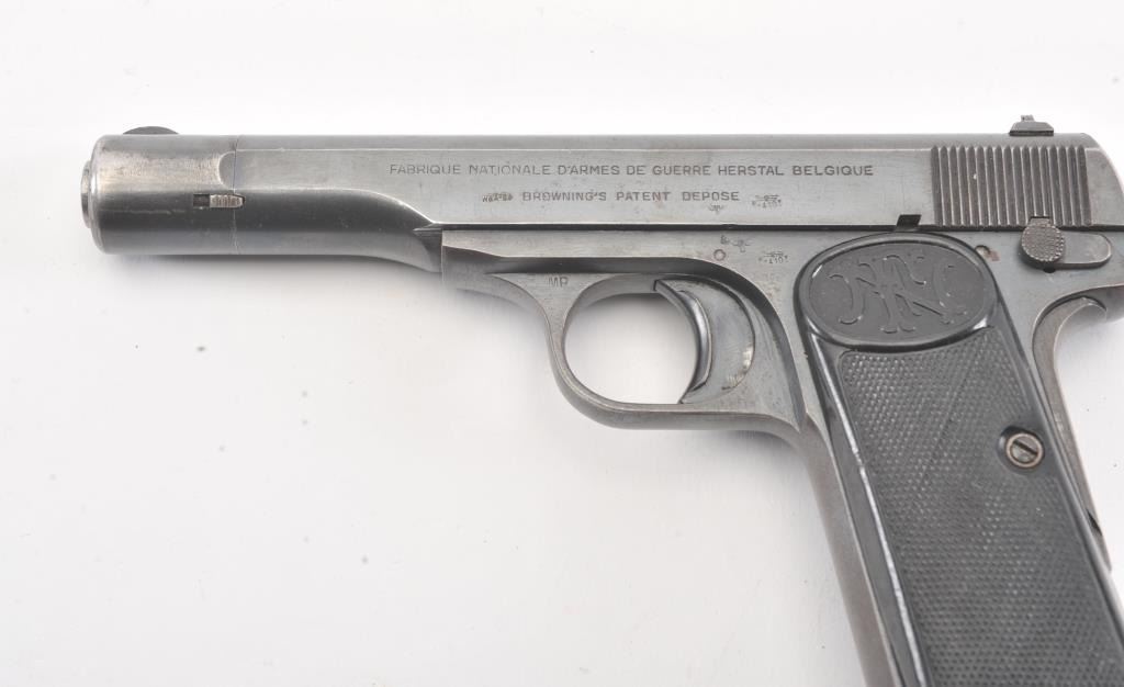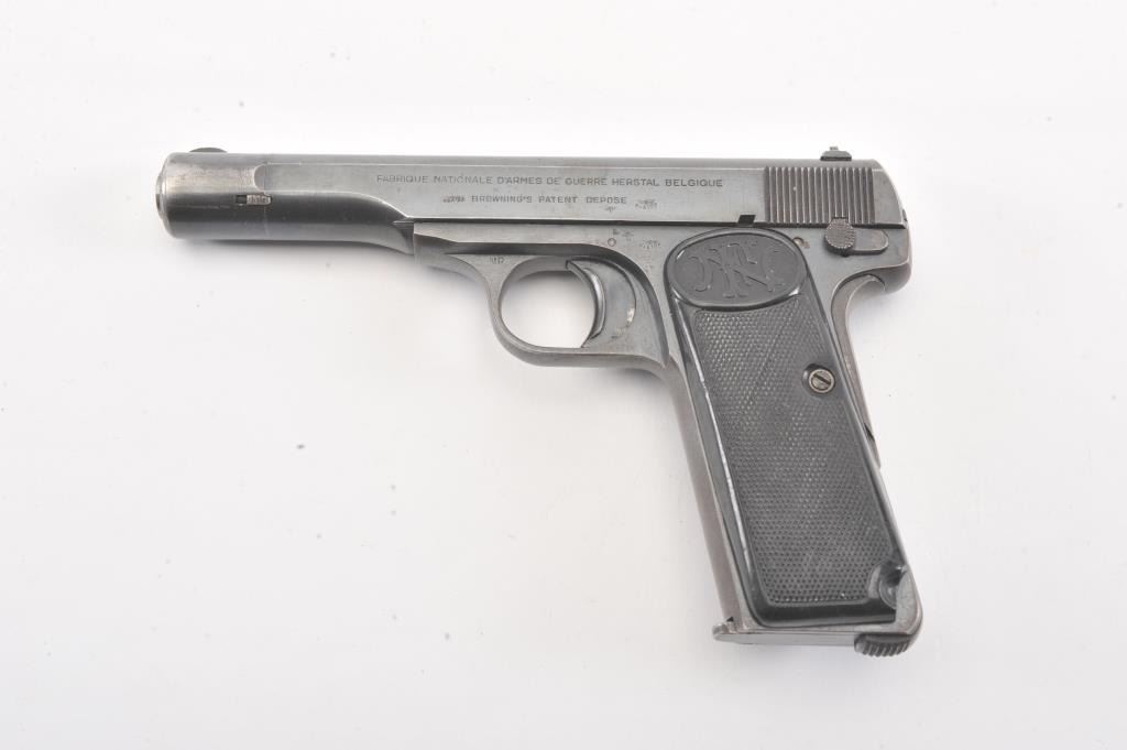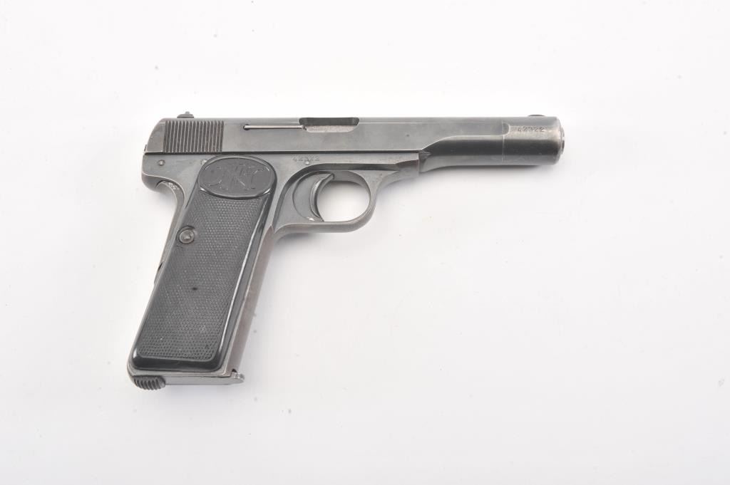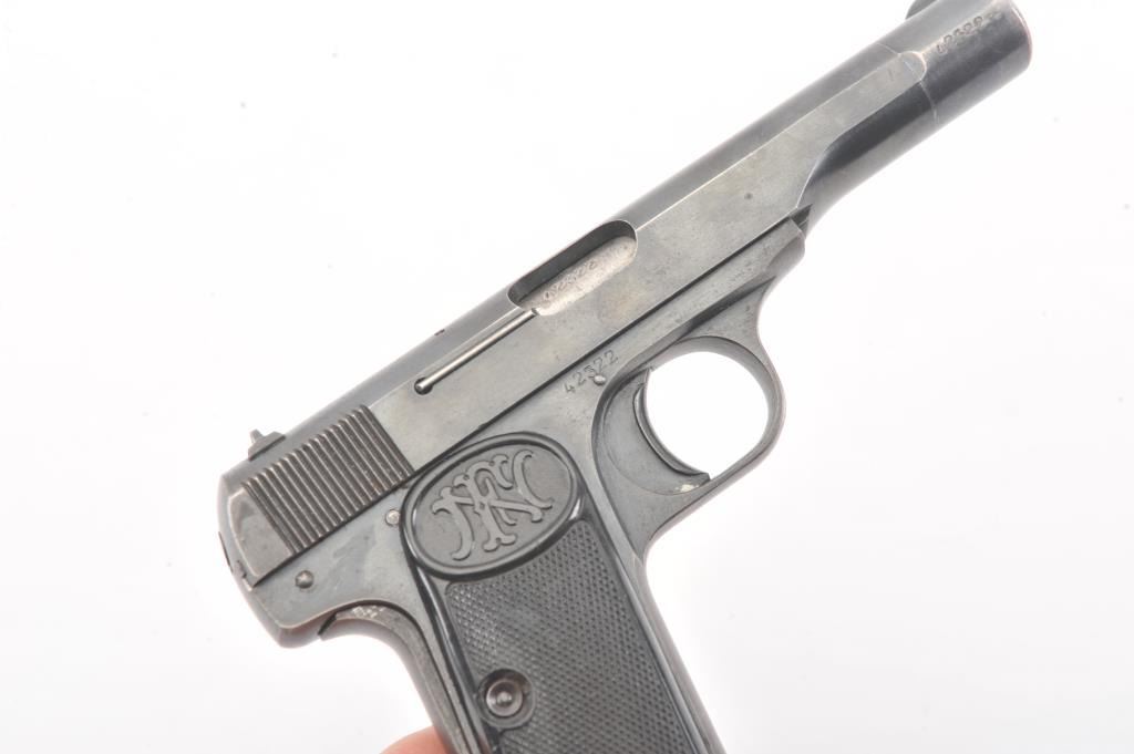 FN 1922 semi auto pistol, #42322, 7.65mm cal., 4 1/2" barrel, blued finish, with checkered plastic logo grips. This pistol is in fine condition, retaining approximately 90-95% of a pre war arsenal refinish, verygood bore, good action. "Eagle L" proofs and "WaA 103". One correct mag. (C&R/PPT) Est. $200-400