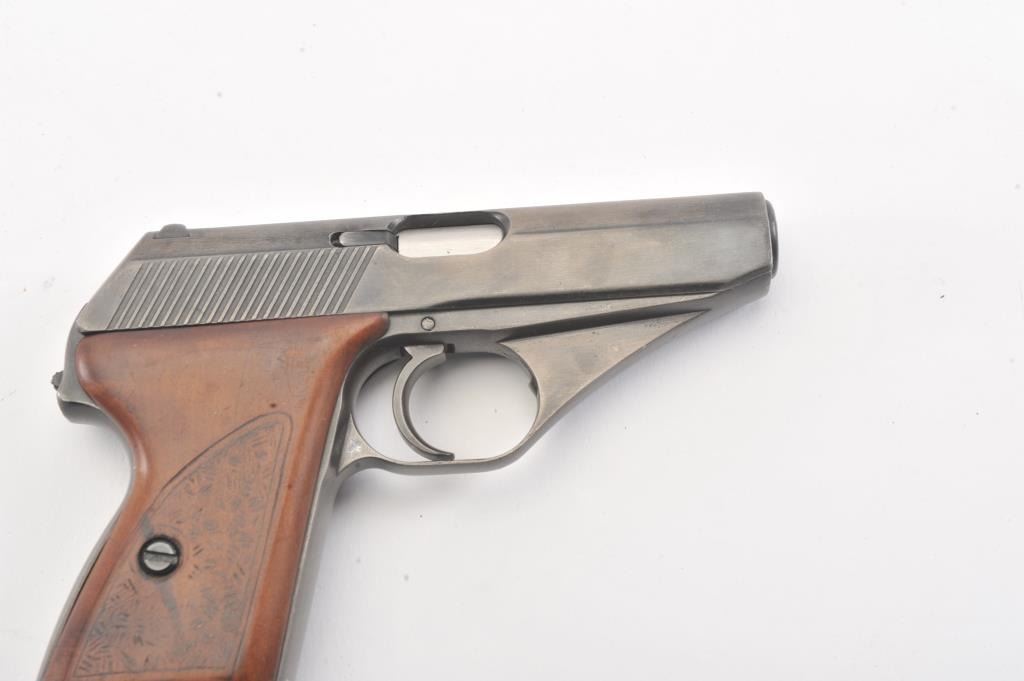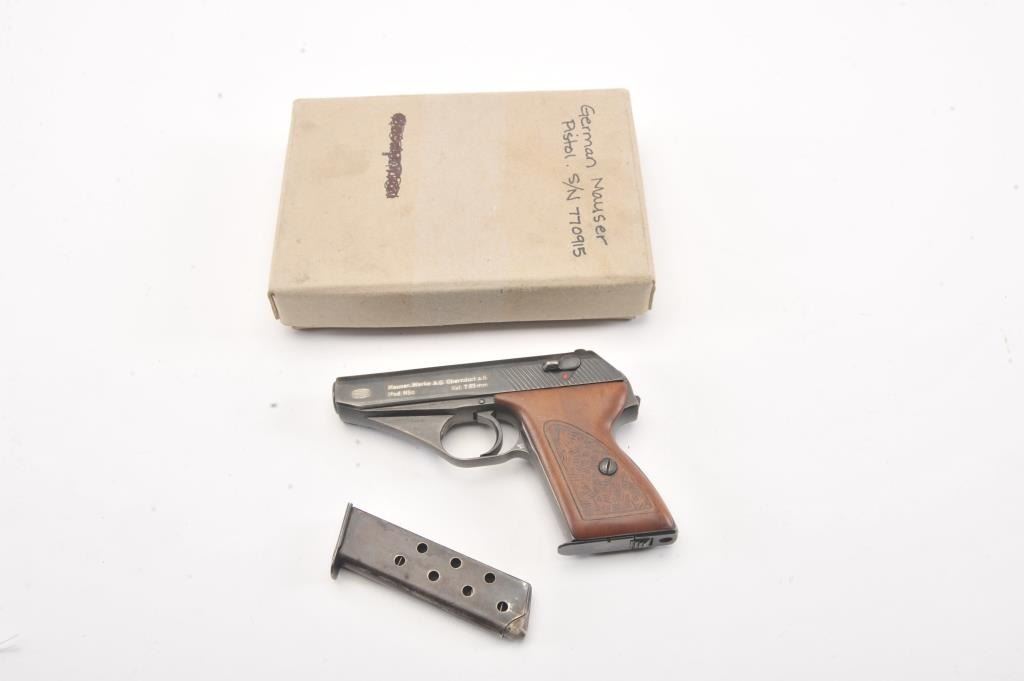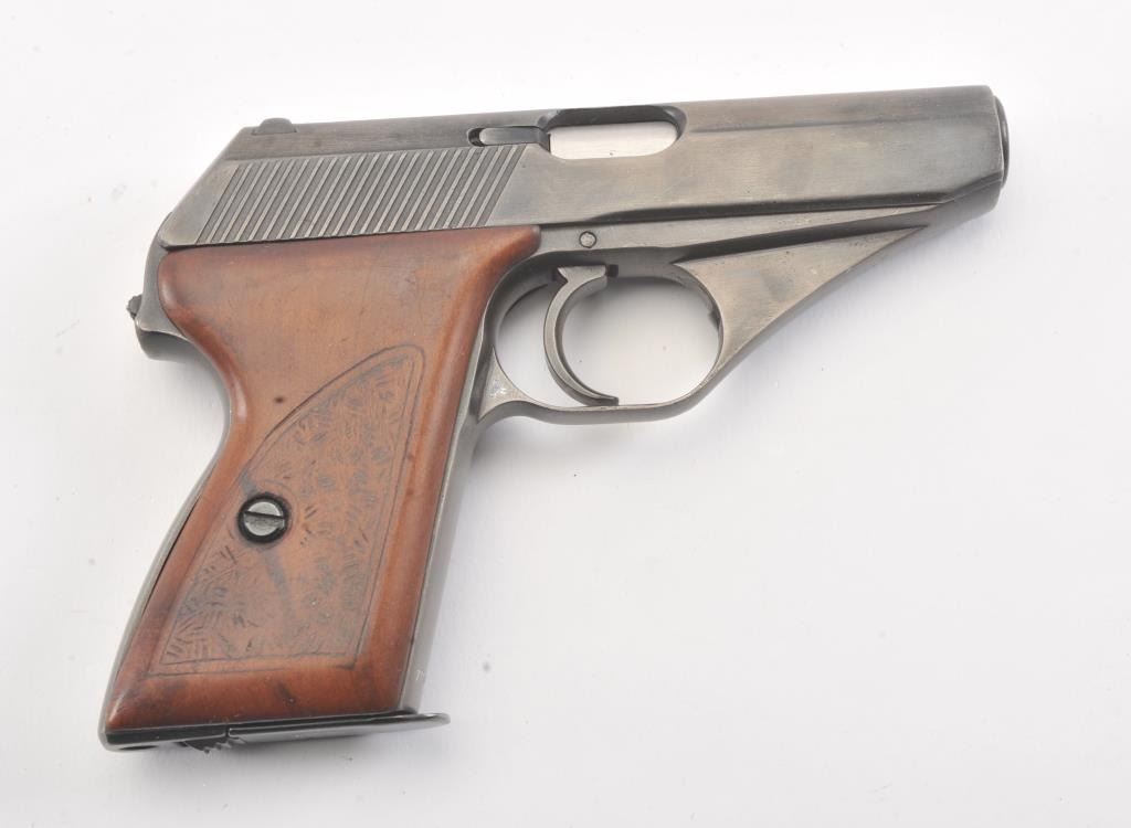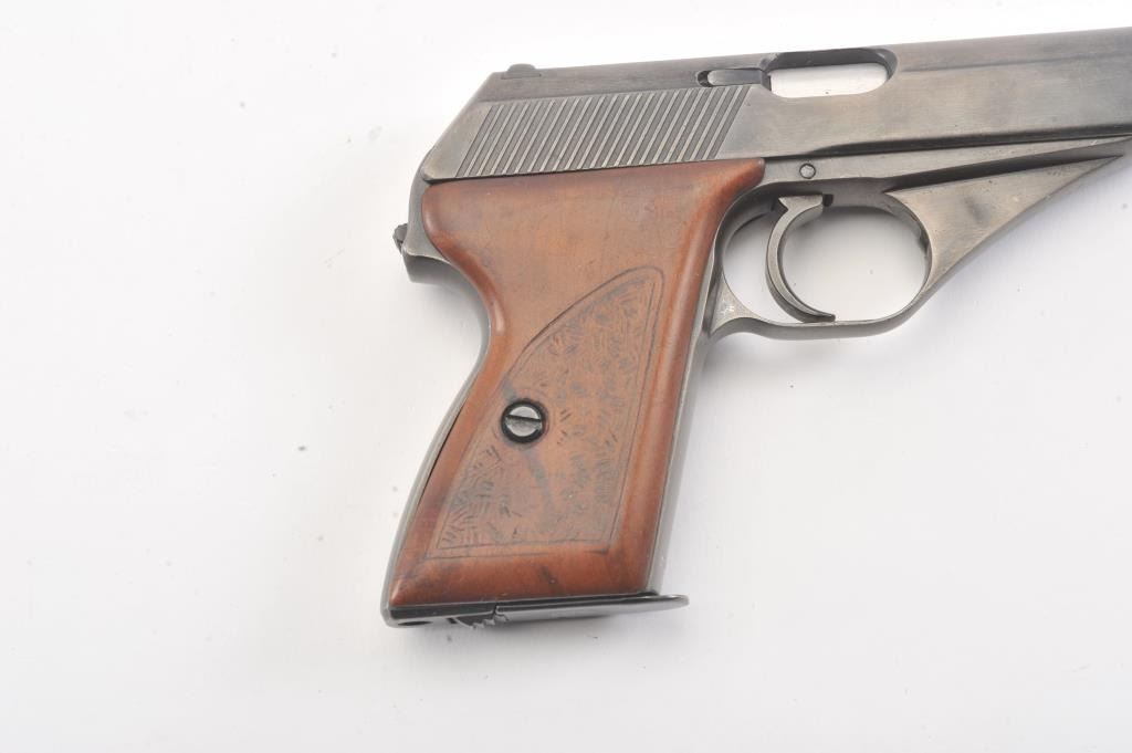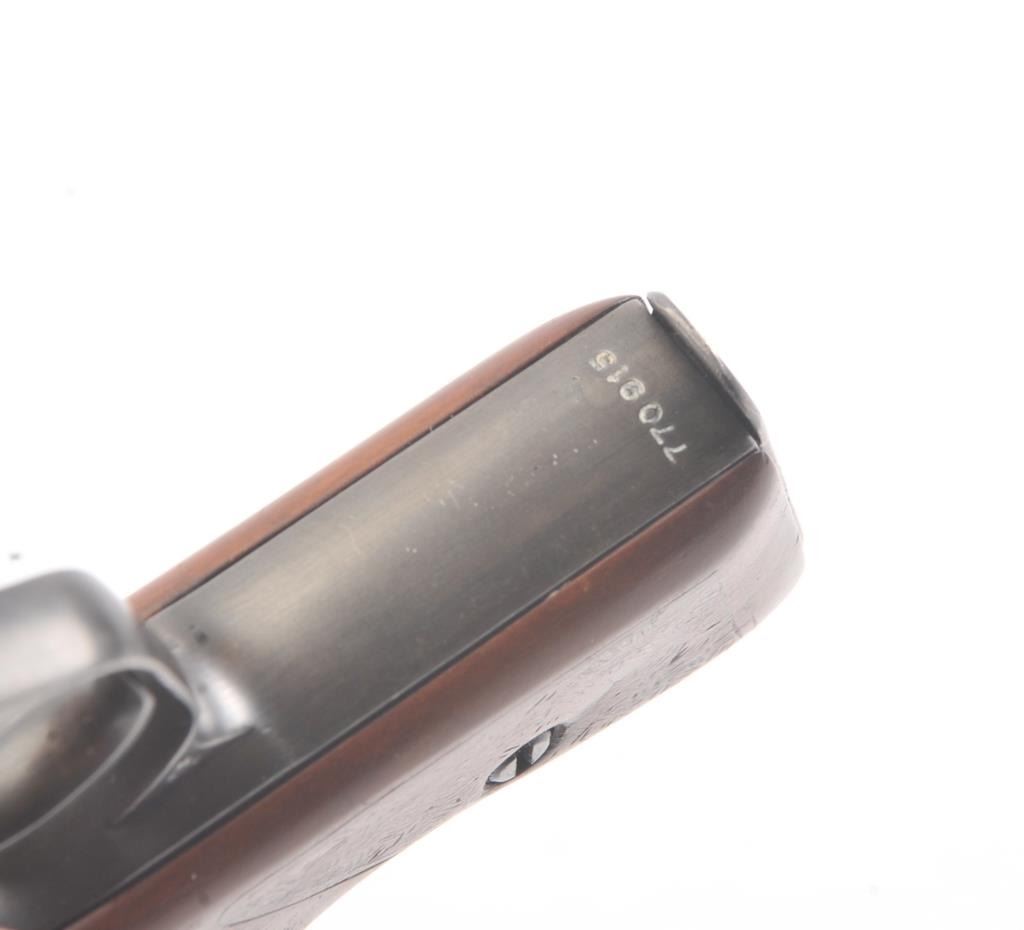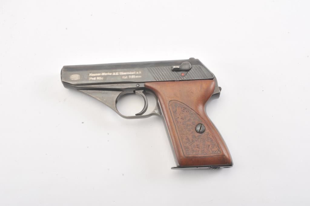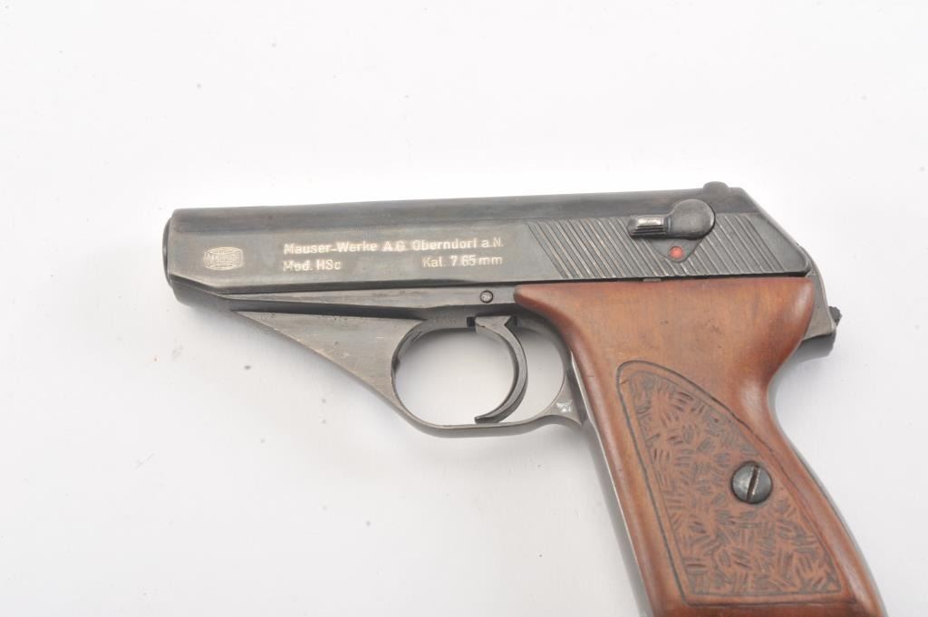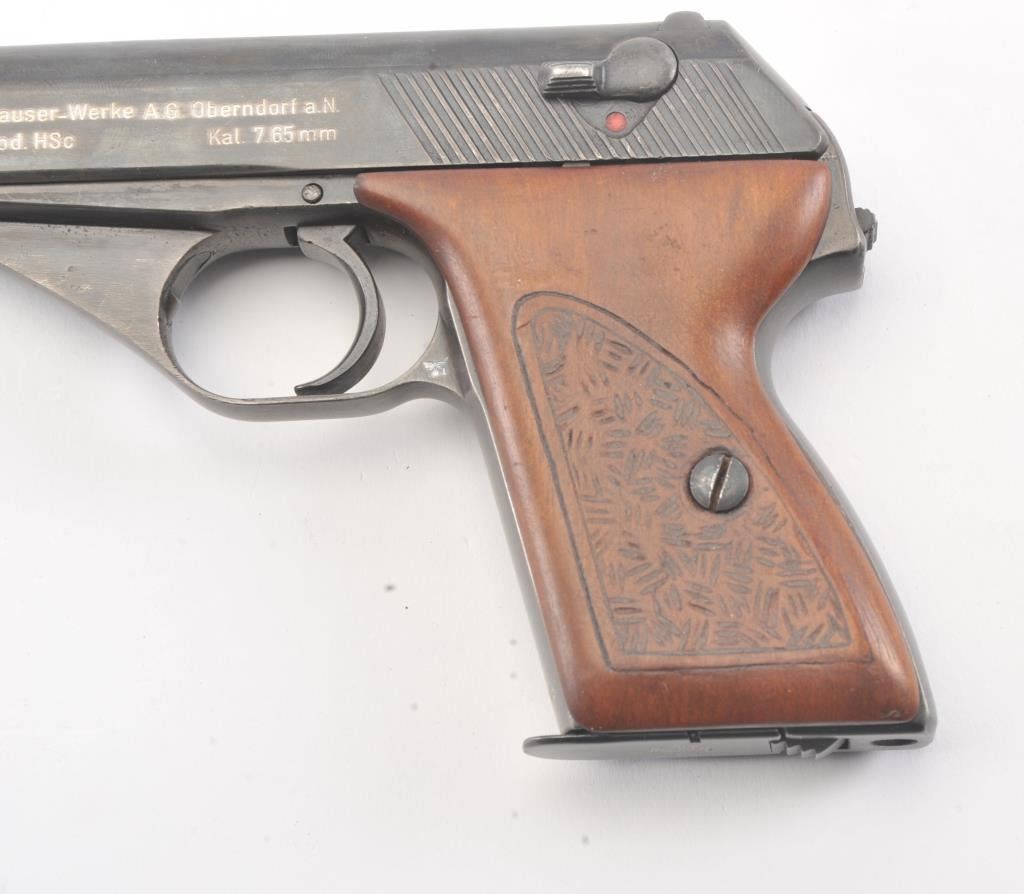 Mauser HSc semi automatic pistol, #770915, 7.65mm cal., blued finish, with hand textured wooden grips. Pistol is in good to very good condition, as refinished with color added, some minor pitting under the finish,bore shows some erosion, action is good. "Eagle L" on left side of the trigger guard, and "Eagle N" proof on right side of trigger guard. Replacement grips are very good, as hand textured. Includes two mags, oneoriginal and one later factory. (C&R/PPT) Est. $250-500