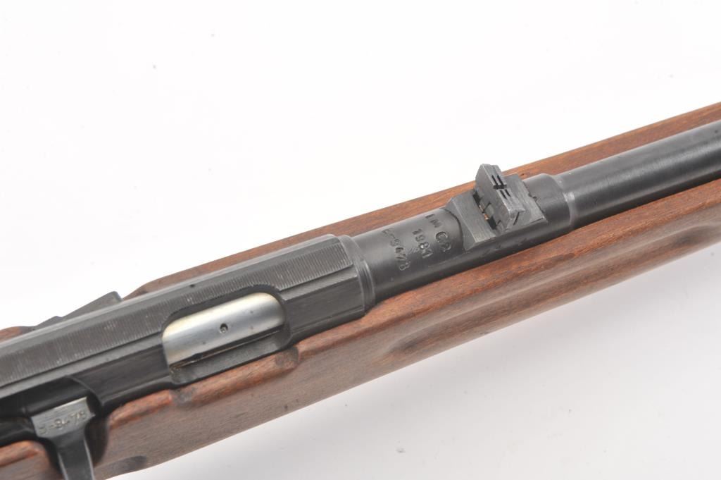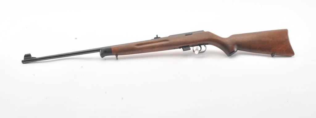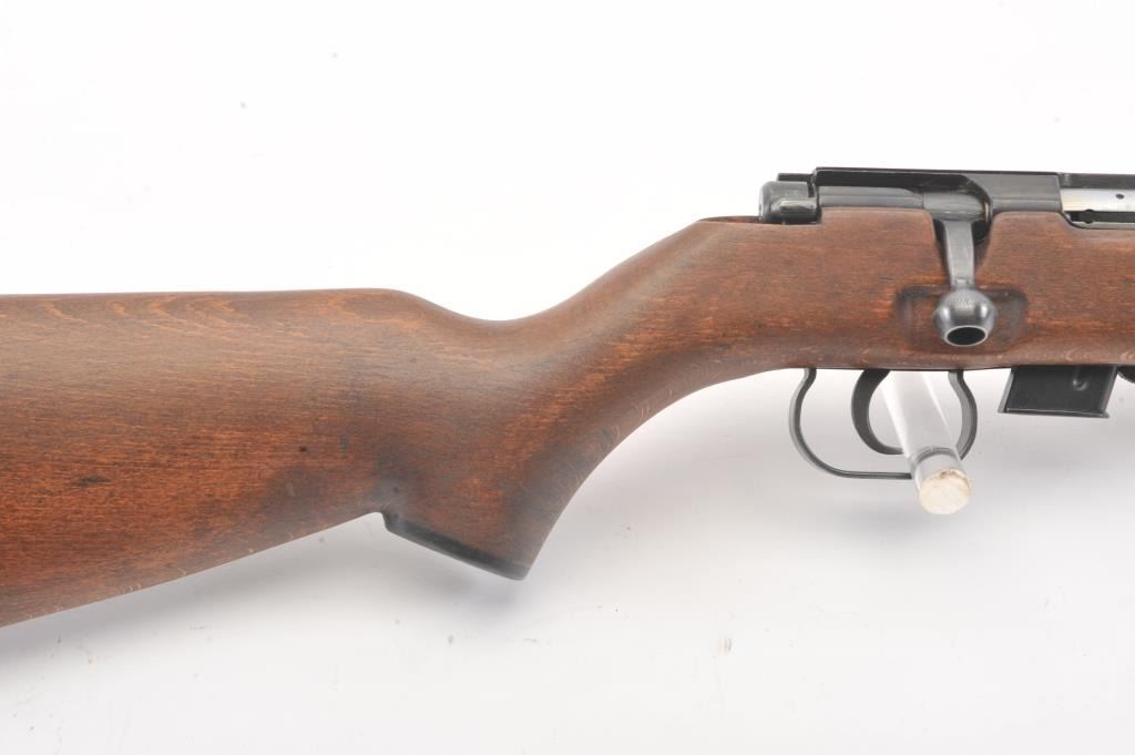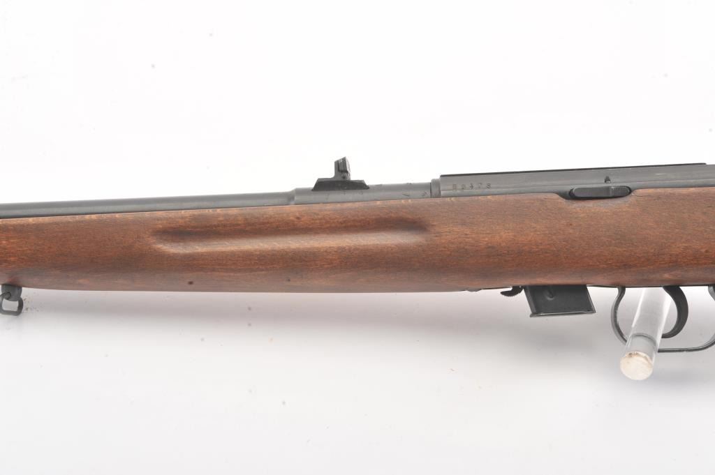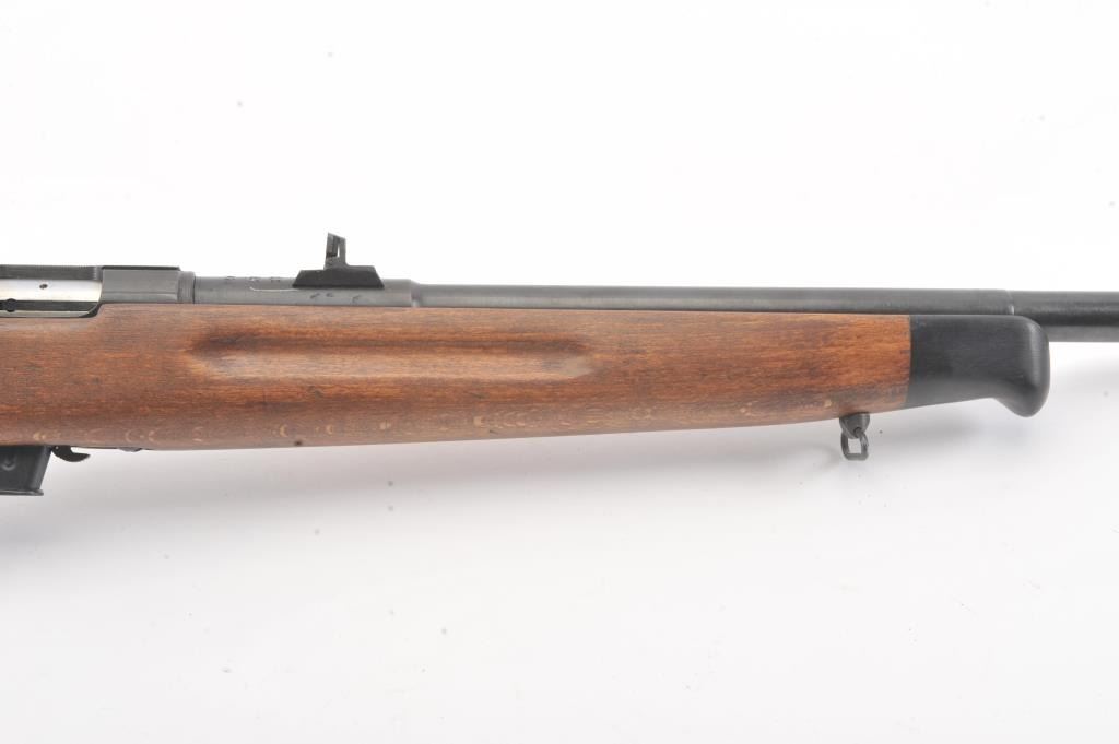 Romanian M-1969 training rifle, #B9478, .22 LR cal., 23 1/4" barrel, flip up rear sights, detachable magazine, plain wood stock with sling swivels. This rifle remains in excellent condition overall, over 98%original blue remains, stock is fine plus, mint bore, good action. Only minor storage and handling marks. One mag included. (Modern) Est. $150-300