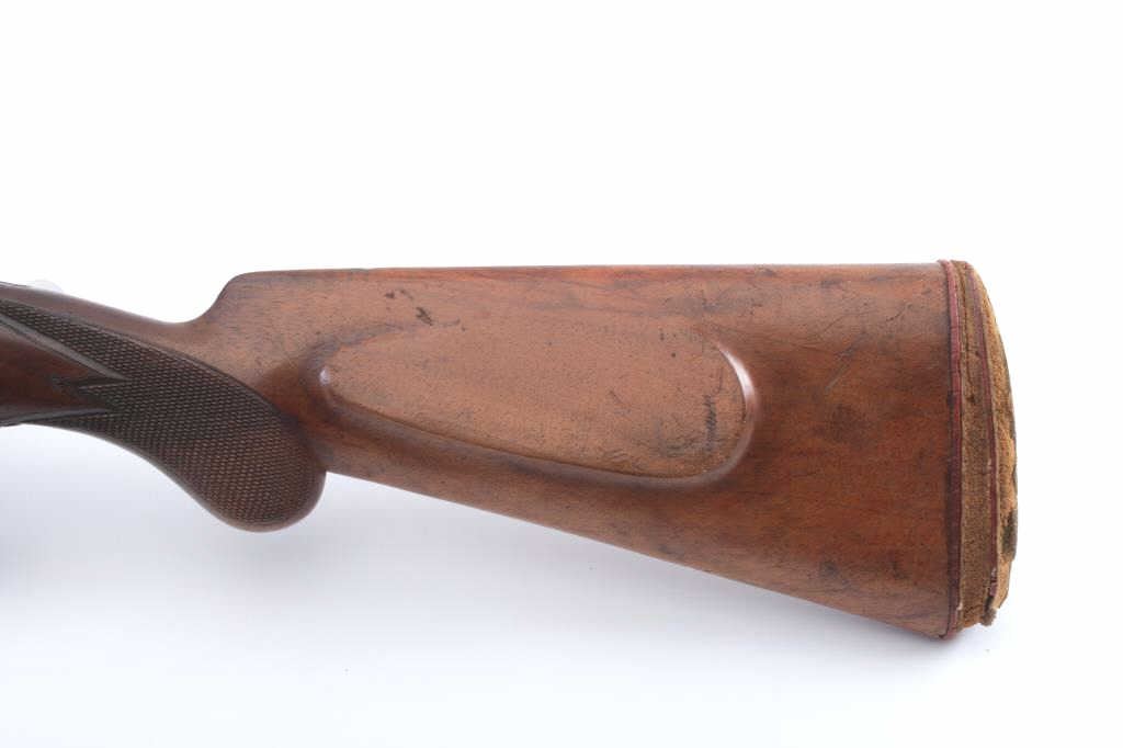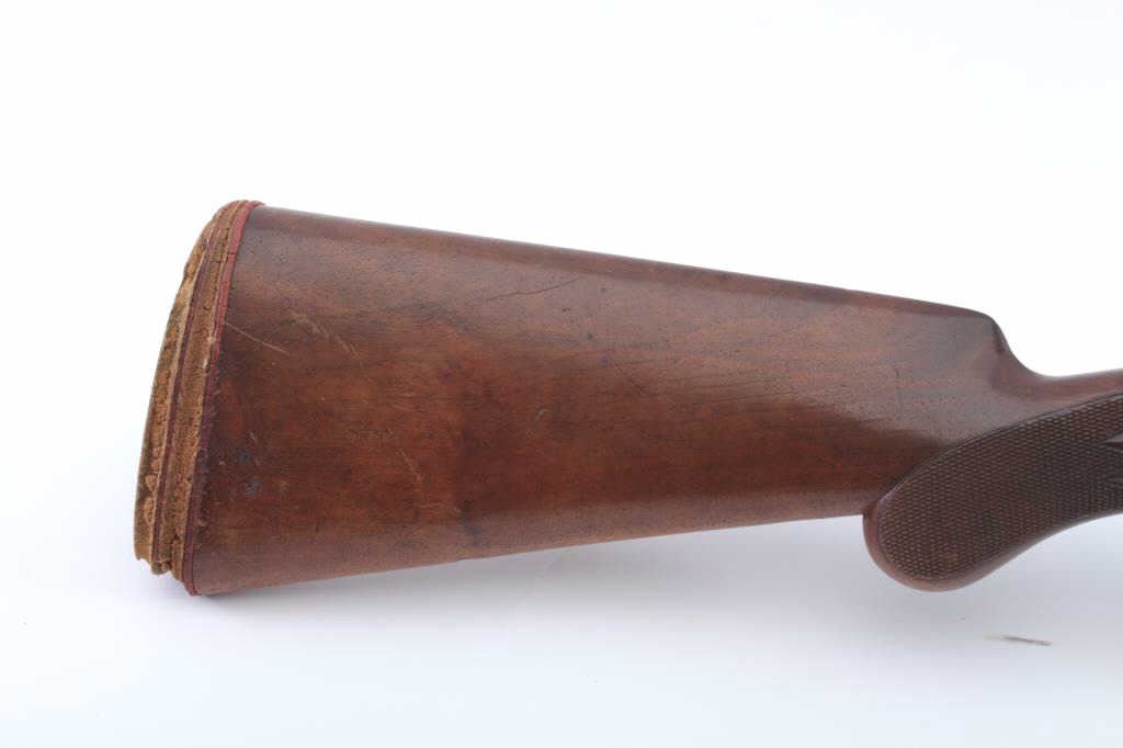 Post-War Custom German Mauser sporting rifle, 8mm-06 caliber, Serial #NSNV. The rifle is in very good overall condition with a 24” barrel with a ramped blade front and King rear sights. The barrel and receiver retainthe majority of the thinning blue finish with tasteful engraving and wear at the muzzle. The rifle has double set triggers and a butter knife bolt handle. The Mannlicher style full-length wood stock is in goodcondition with a horn fore end cap, beaded cheek piece and Prince of Wales pistol grip. The butt stock ends with a deteriorated butt pad providing a 14” LOP to the front trigger. The bore is good, the action iscrisp and the markings are sharp. Est.: $400-$800. (C+R)
