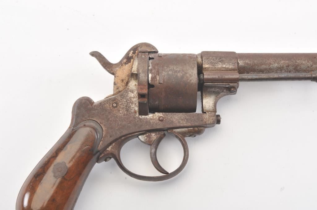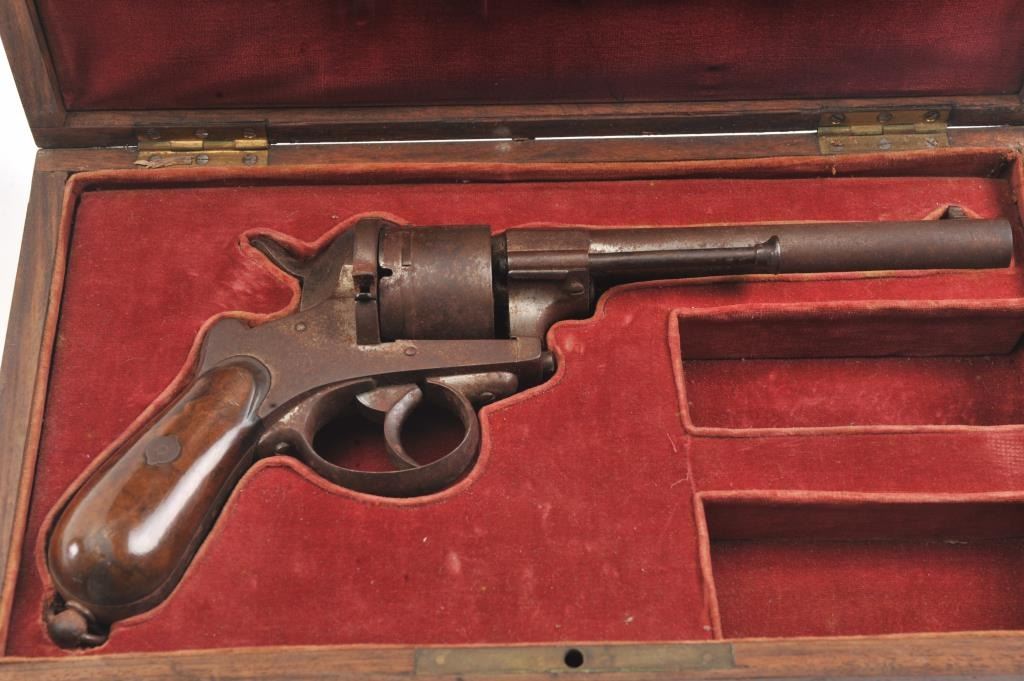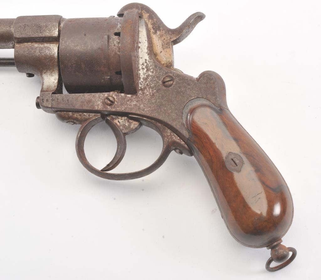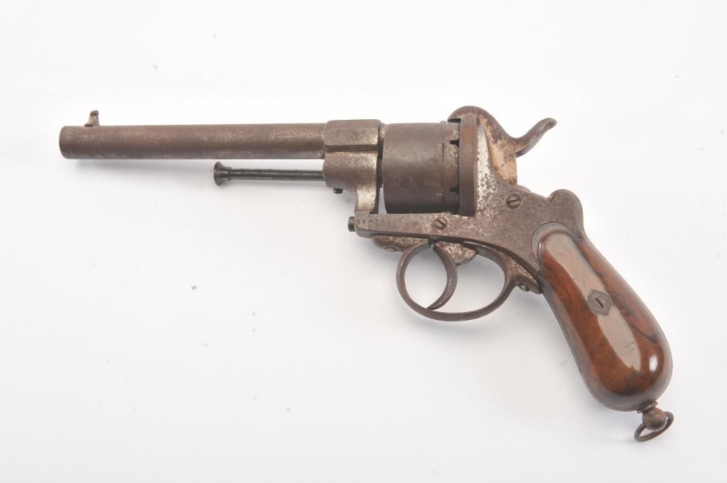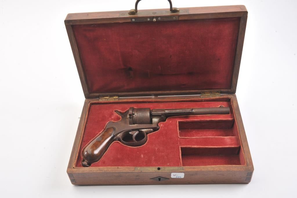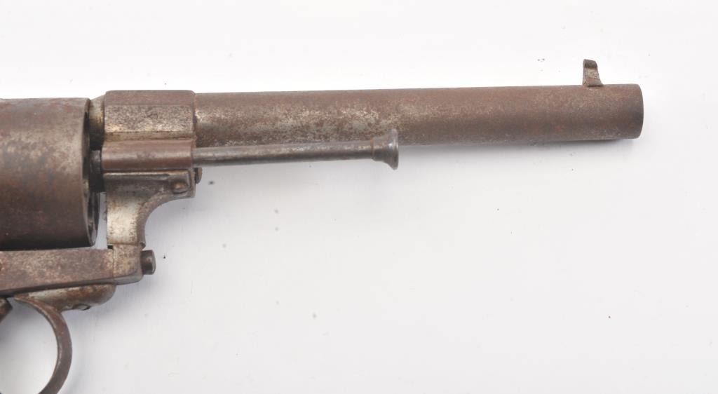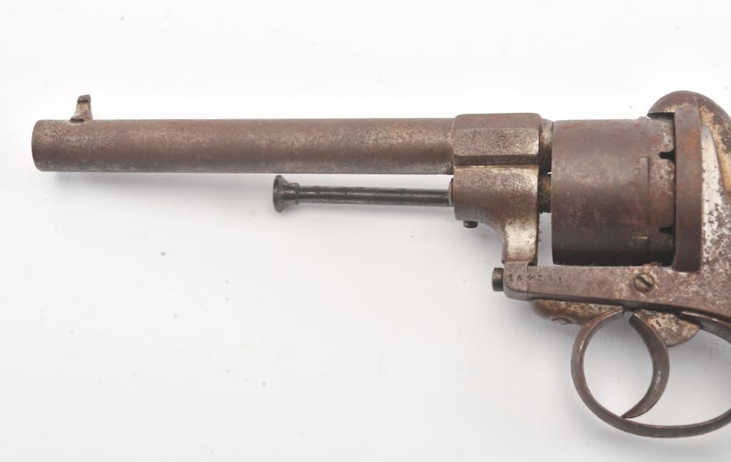 Double Action Pinfire Revolver in original case marked "E.L." with crown proof (Liege Belgium), S/N 184261. 6" barrel in 11mm with shot cylinder. The bright metal has a coating of surface rust and erosion that may cleanwell. The action is not working. Select burl grips retaining most of its original varnish. The case is in very good condition showing a rose colored velveteen. The exterior of the case is good with minor scratching, slightwarping, and normal age. Would improve with T.L.C. and small restorations and repairs. (Antique) Est.: $600-$1200