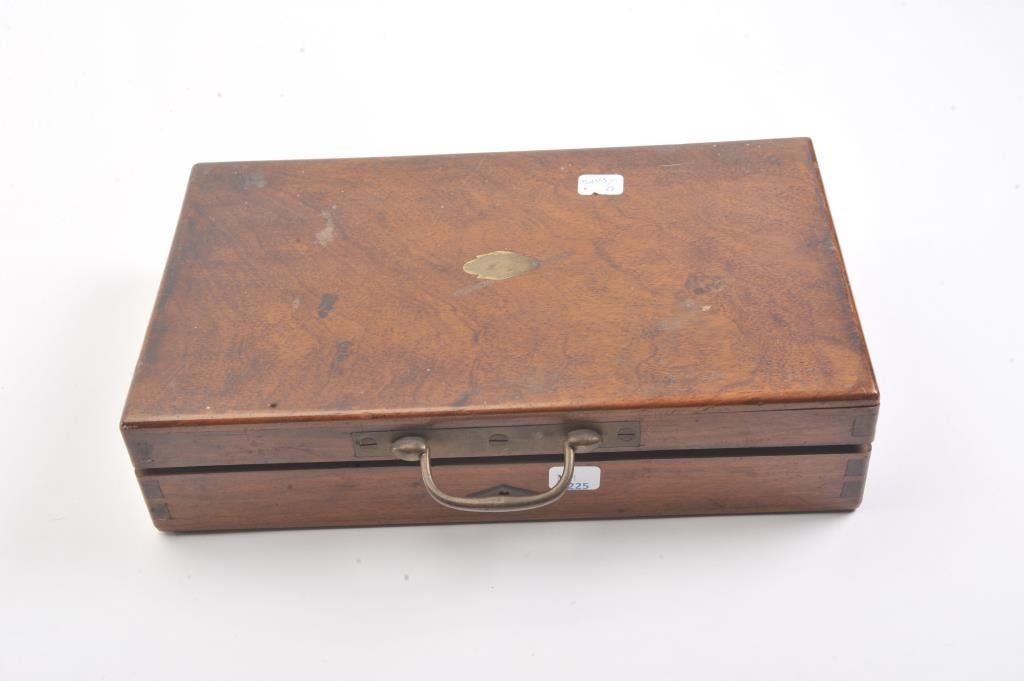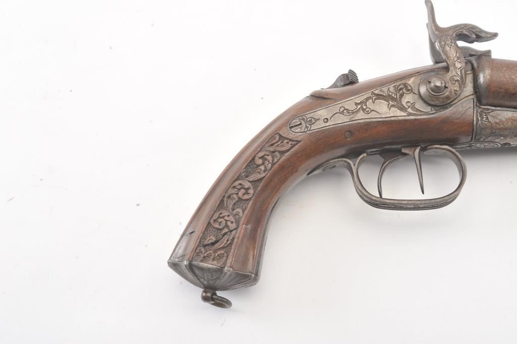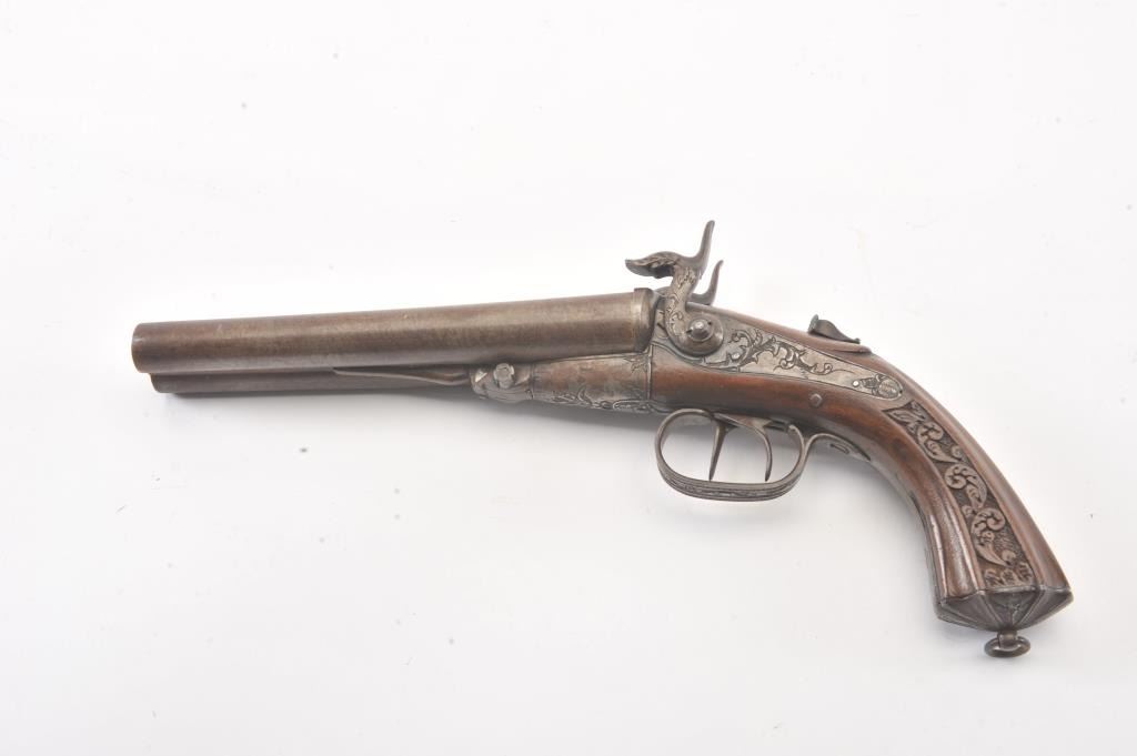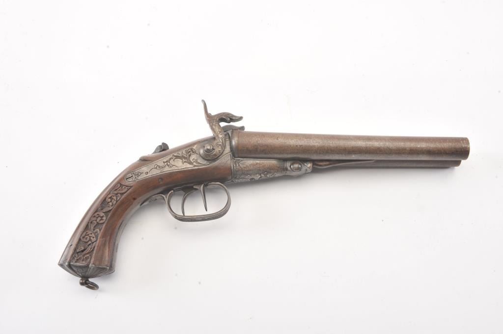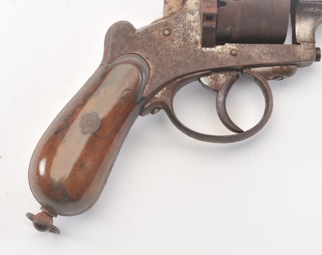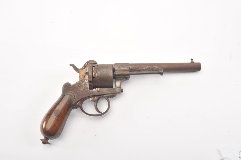 Double Action Pinfire Revolver in original case marked "E.L." with crown proof (Liege Belgium), S/N 184261. 6" barrel in 11mm with shot cylinder. The bright metal has a coating of surface rust and erosion that may cleanwell. The action is not working. Select burl grips retaining most of its original varnish. The case is in very good condition showing a rose colored velveteen. The exterior of the case is good with minor scratching, slightwarping, and normal age. Would improve with T.L.C. and small restorations and repairs. (Antique) Est.: $600-$1200