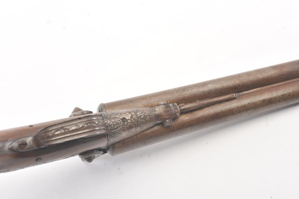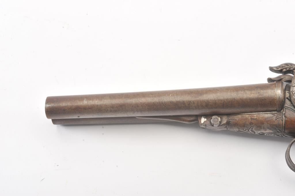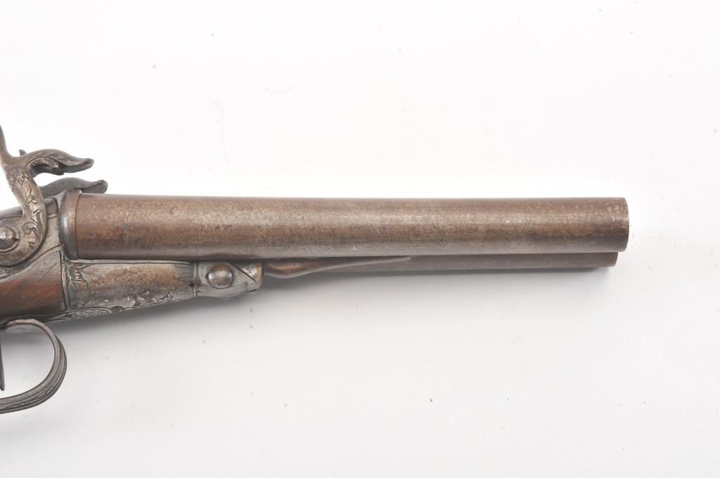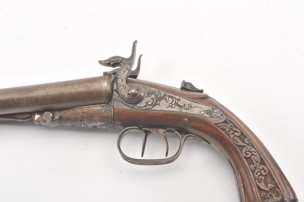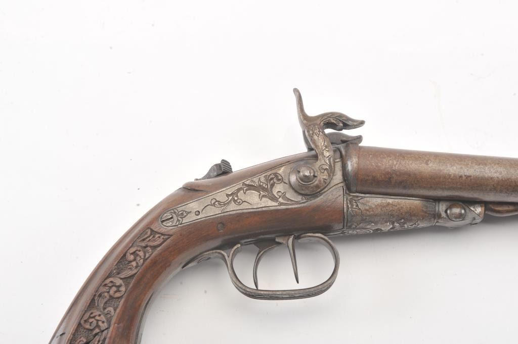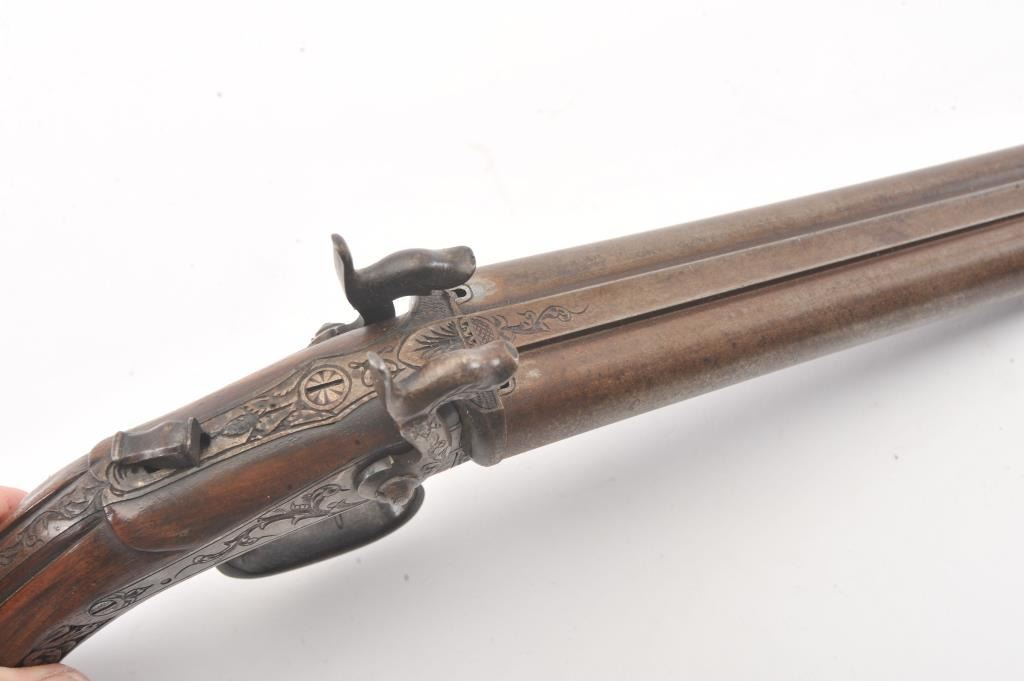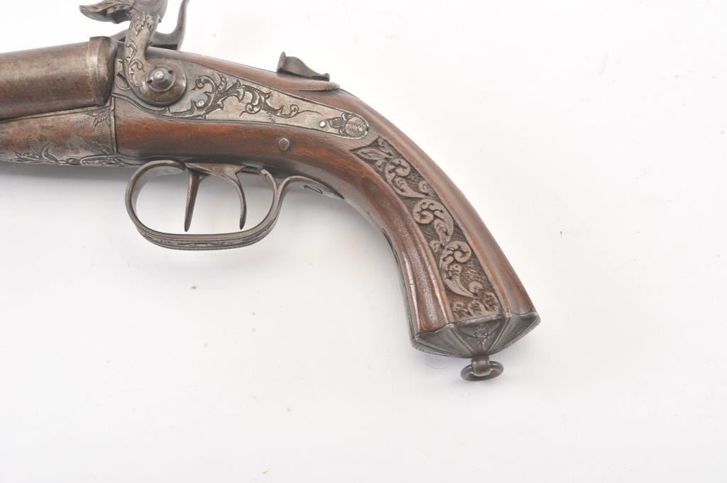 Double Action Pinfire Revolver in original case marked "E.L." with crown proof (Liege Belgium), S/N 184261. 6" barrel in 11mm with shot cylinder. The bright metal has a coating of surface rust and erosion that may cleanwell. The action is not working. Select burl grips retaining most of its original varnish. The case is in very good condition showing a rose colored velveteen. The exterior of the case is good with minor scratching, slightwarping, and normal age. Would improve with T.L.C. and small restorations and repairs. (Antique) Est.: $600-$1200