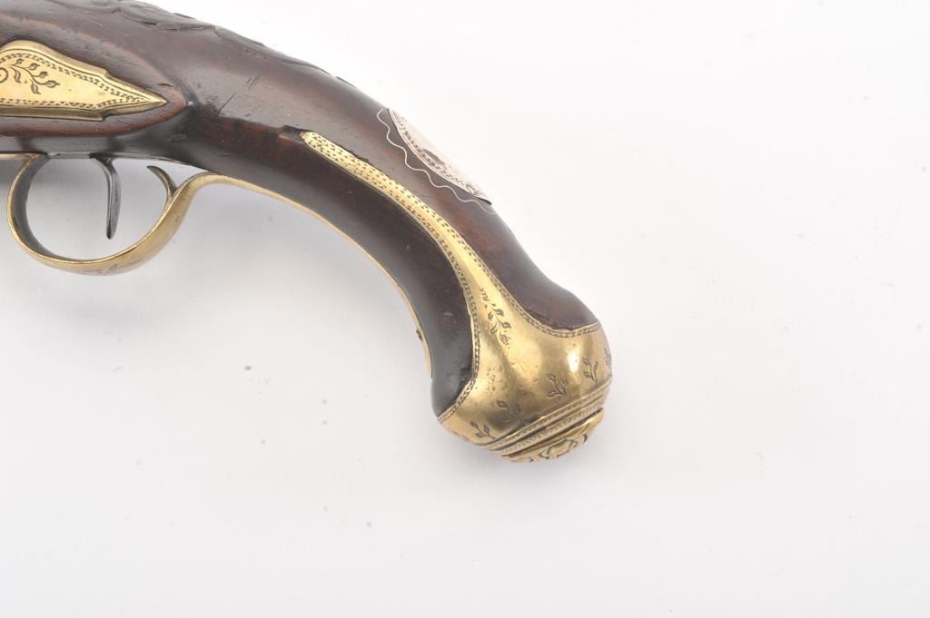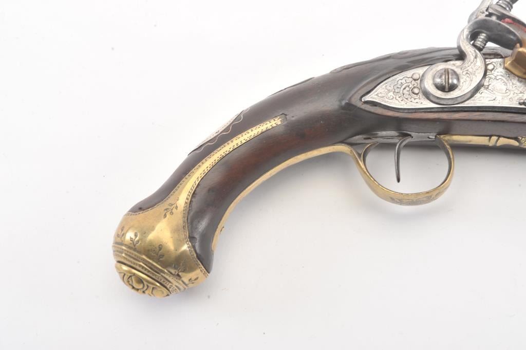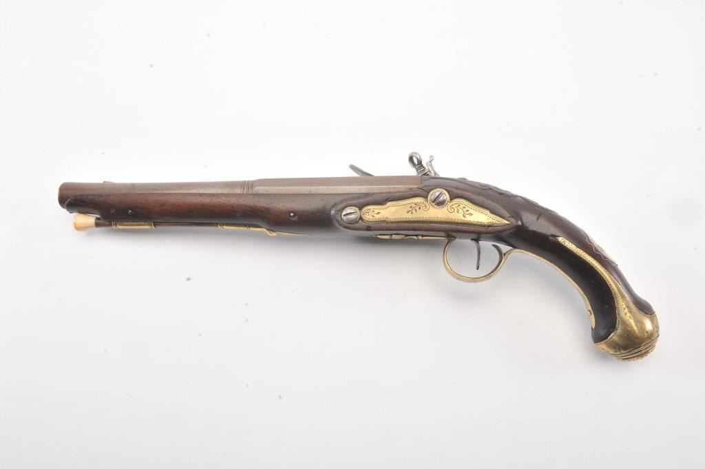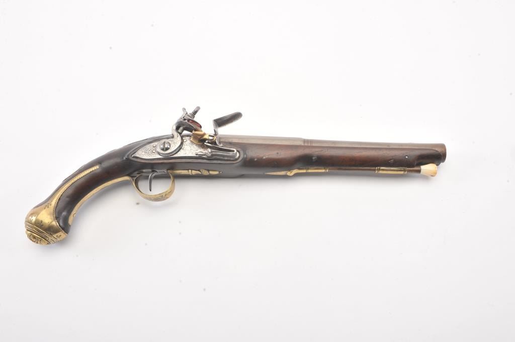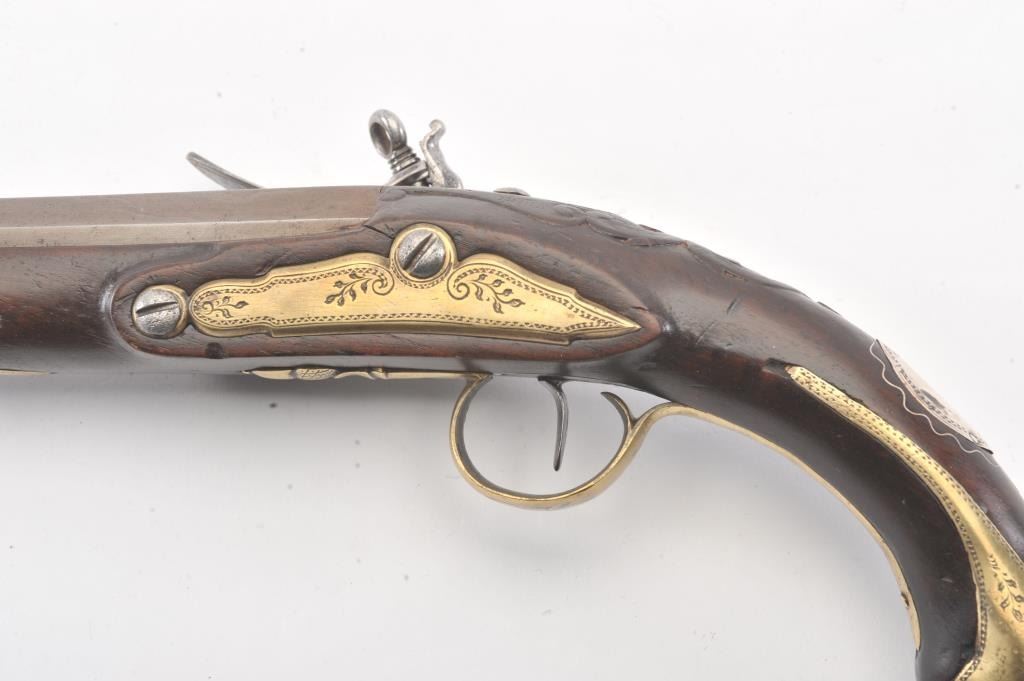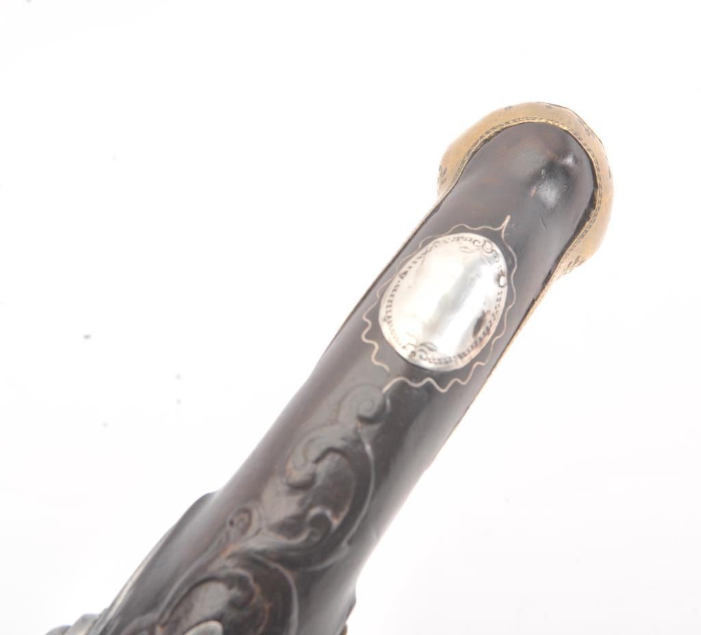 Interesting continental flintlock pistol marked "Levis EOP" on the lock with silver inlaid Arabic letters on the barrel, Spanish style "Ring' at the top of hammer, mask butt, and engraved florals on the trigger guardwith acorn finial. Measures 15 1/4" overall with a 9 1/2" barrel of .60 plus caliber smoothbore. Nicely European museum quality restored. (Antique) Est.: $750-$1500