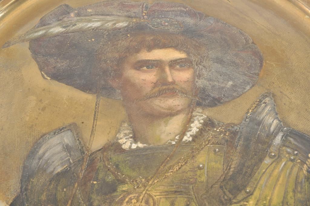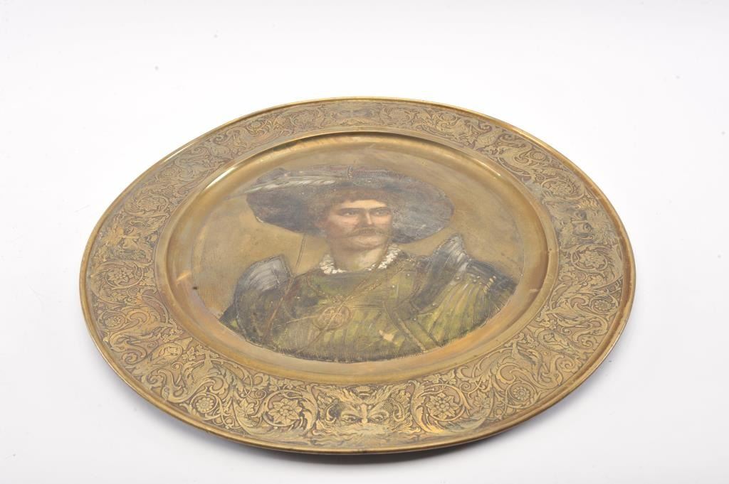 Antique European wall plaque constructed of brass backed in copper. Beautifully etched and painted with central figure of noble in armor. Measures 26" across the center. Minor damage to paint and cleaning. The etching and chase work is outstanding around the border. 100-300 years old and from an old collector. Est.: $500-$1000
