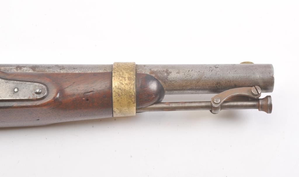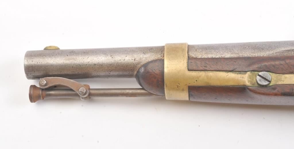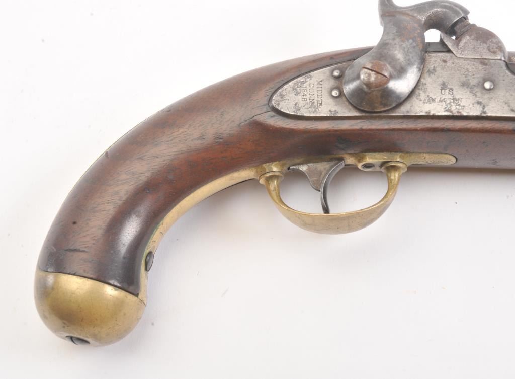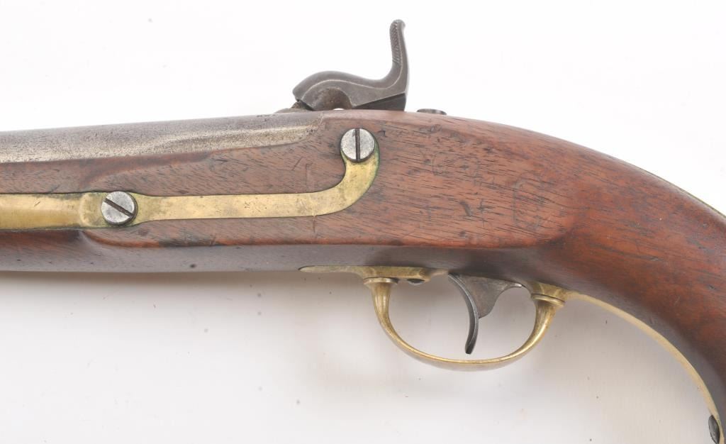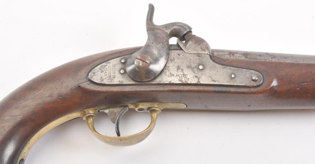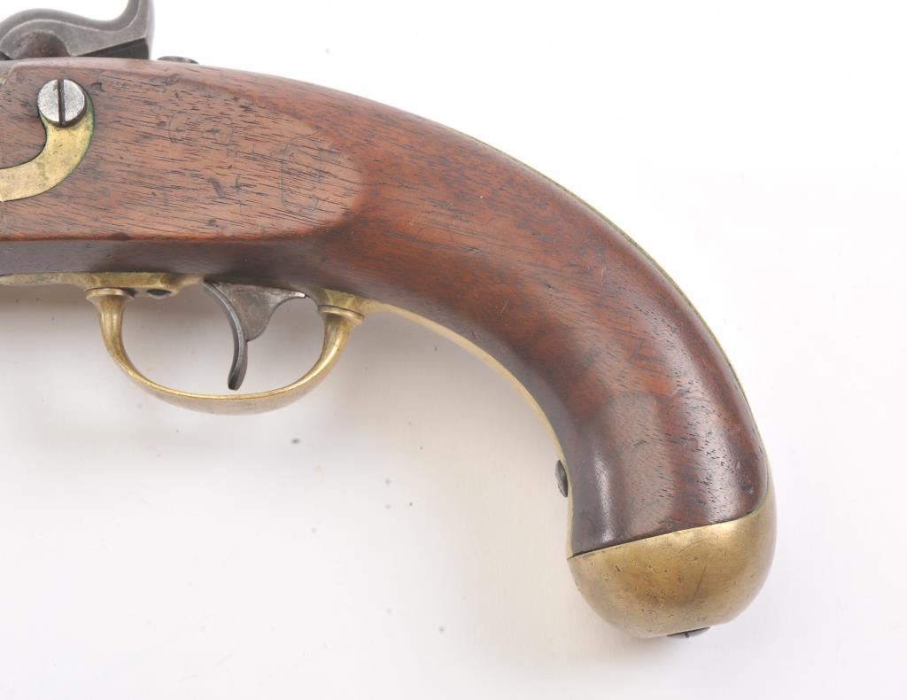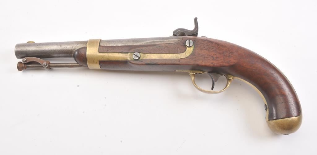 U.S. Model 1842 percussion martial issued pistol by Aston dated 1848 in .54 caliber smoothbore with brass mounts. The metal is good with light to moderate area of rust and minor pitting. Well marked. The stock is good to very good with partial outline of cartouche showing. The rammer and keeper are excellent restorations and the correct style. The action works well. Good Mexican-American War era pistol of the type that went west in gold rush. (Antique) Est.: $600-$1200