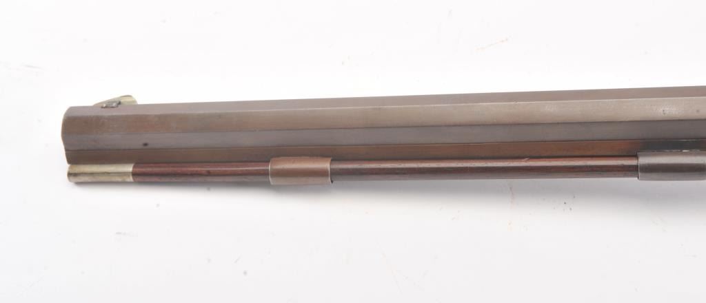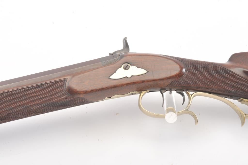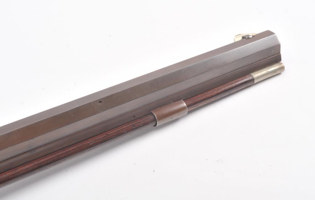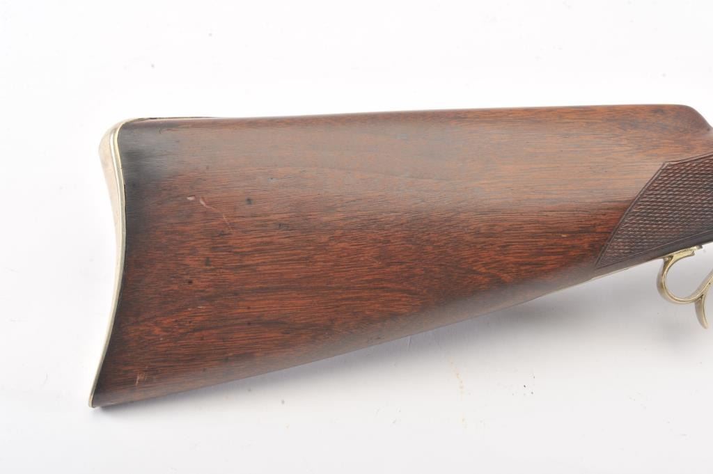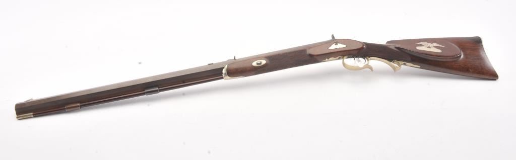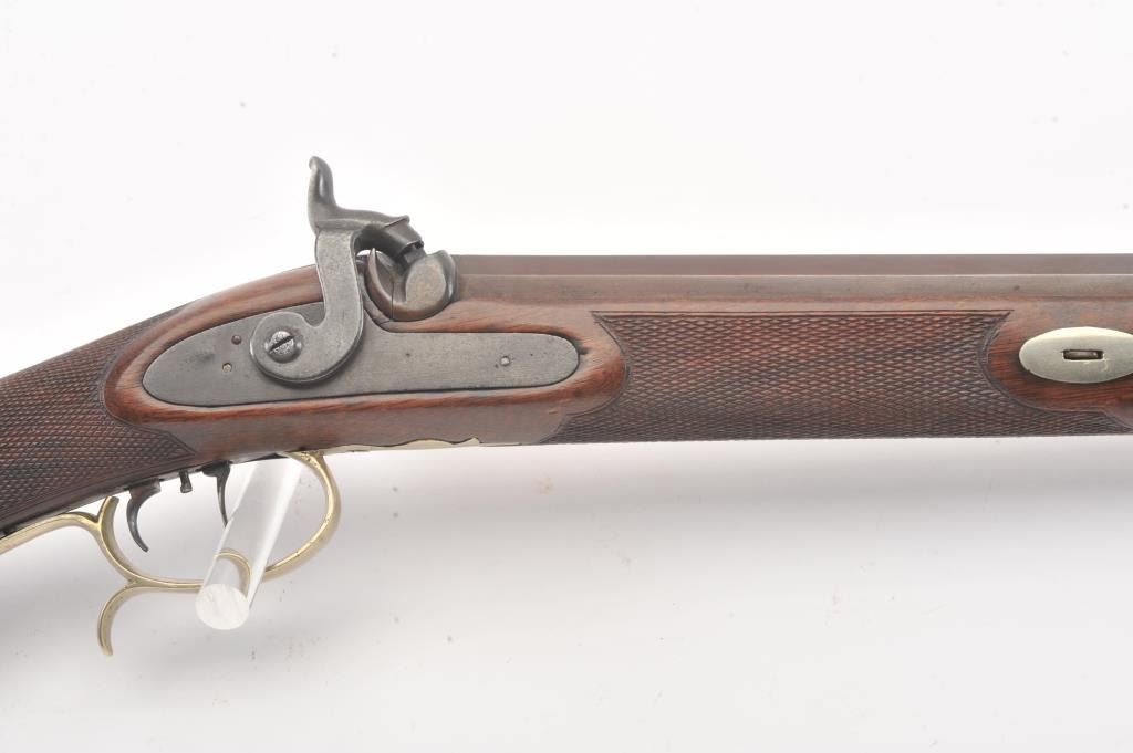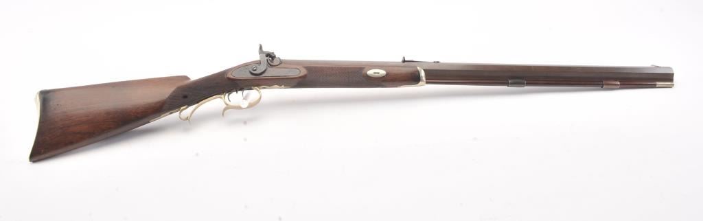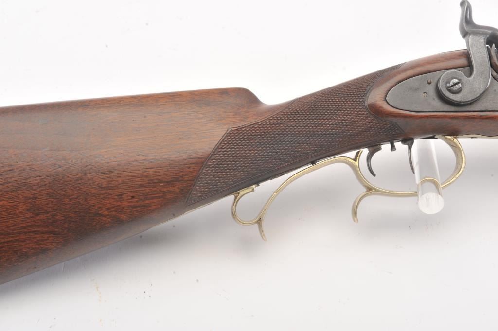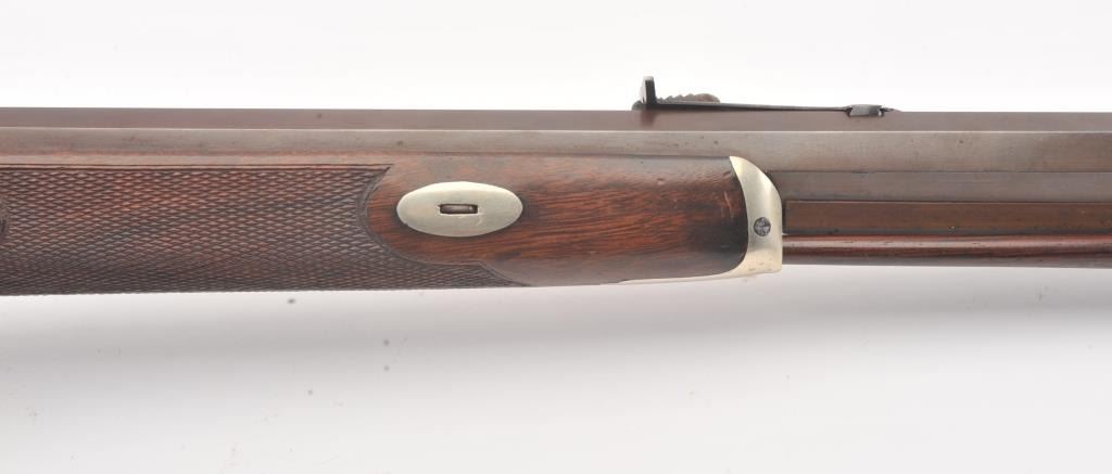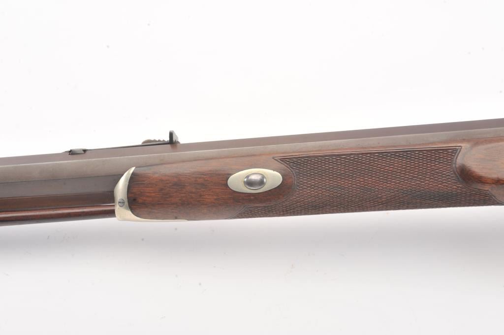 Heavy barrel percussion rifle marked "J. Zettler New York". Measures 46 1/2" overall with 30" barrel of approximately .54 caliber rifled. Double set triggers (Working) and German silver mounts with large eagle inlayinto the cheek piece. Shows a professional quality re-brown and re-freshining to stock. Muted case colors on the lock. Sights replaced. A nice looking and high quality rifle ready to shoot. Period ramrod.(Antique) Est.: $600-$1200