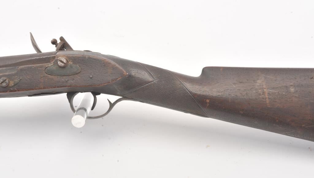 American 19th century New England militia style musket showing "V" and "P" and eagle proof at the left breech. Shows stud for bayonet at the muzzle. Approximately .69 caliber smoothbore. Measures 55 1/2" overallwith a 39 1/2" barrel. Simple brass mounts in typical New England style. Good quality reconversion to flintlock. Period ramrod. Scattered erosion and light to moderate pitting. The wood is good with many smallscratches and minor losses. Dark patina on the brass. Circa 1800-1820s. (Antique) Est.: $500-$1000