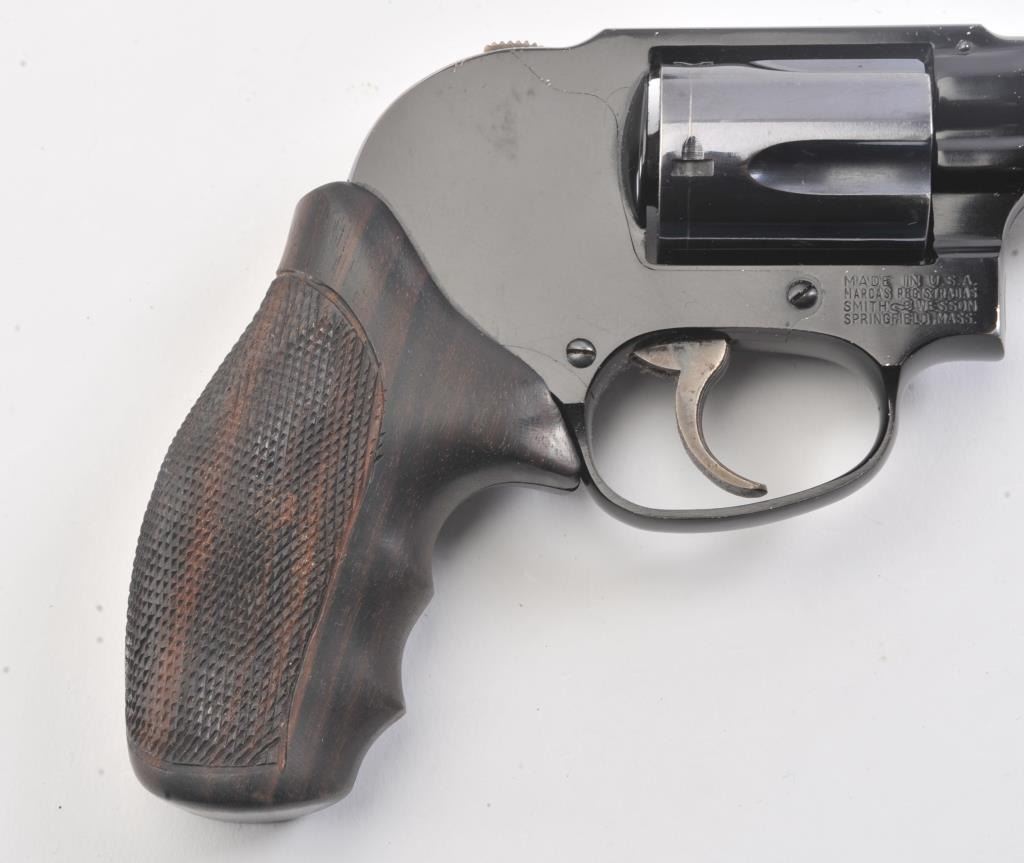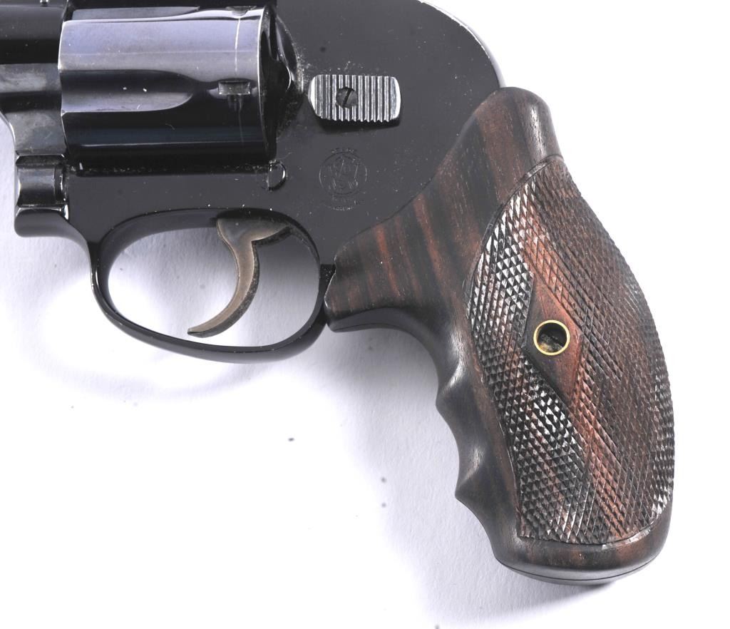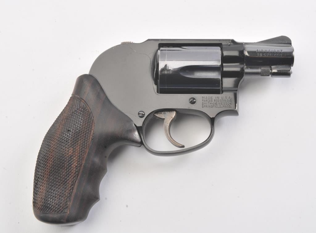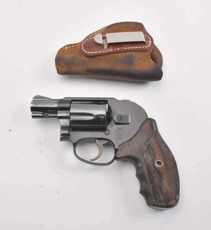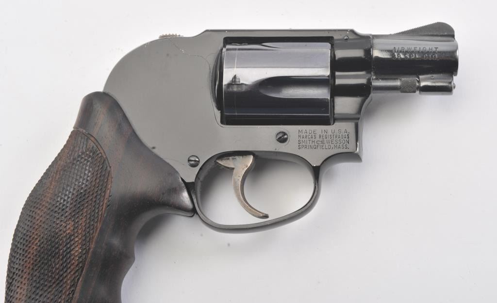 Smith & Wesson Model 38 No Dash Air Weight double action revolver, .38 Special caliber, Serial #43283. The pistol is in fine overall condition with a 2” pinned barrel and shrouded hammer. The pistol retainsapproximately 90% of the blue finish with a faint drag line on the cylinder and loss of finish at the muzzle. The hammer and trigger show muted case hardening. The checkered wood after-market combat grips are in verygood condition with sharp checkering, showing little use. The bore is good, the action is crisp and the markings are sharp. The lot includes a suede leather ITP holster with the consignor’s name and pistol serial number on the back. Est.: $350-$700. (PPT/Modern).