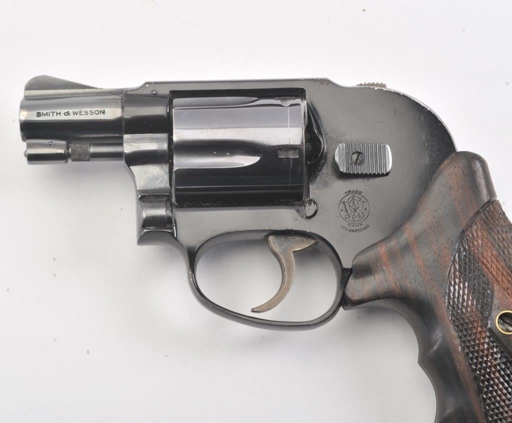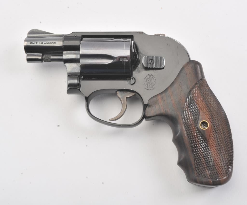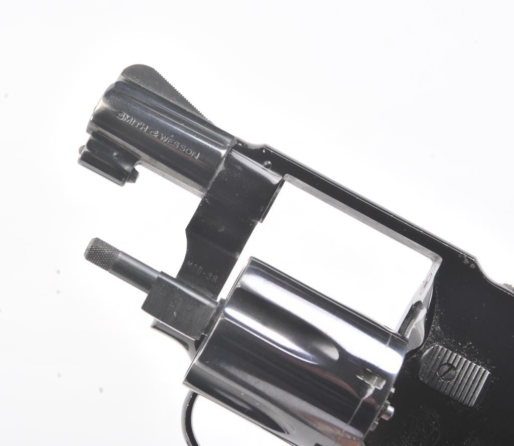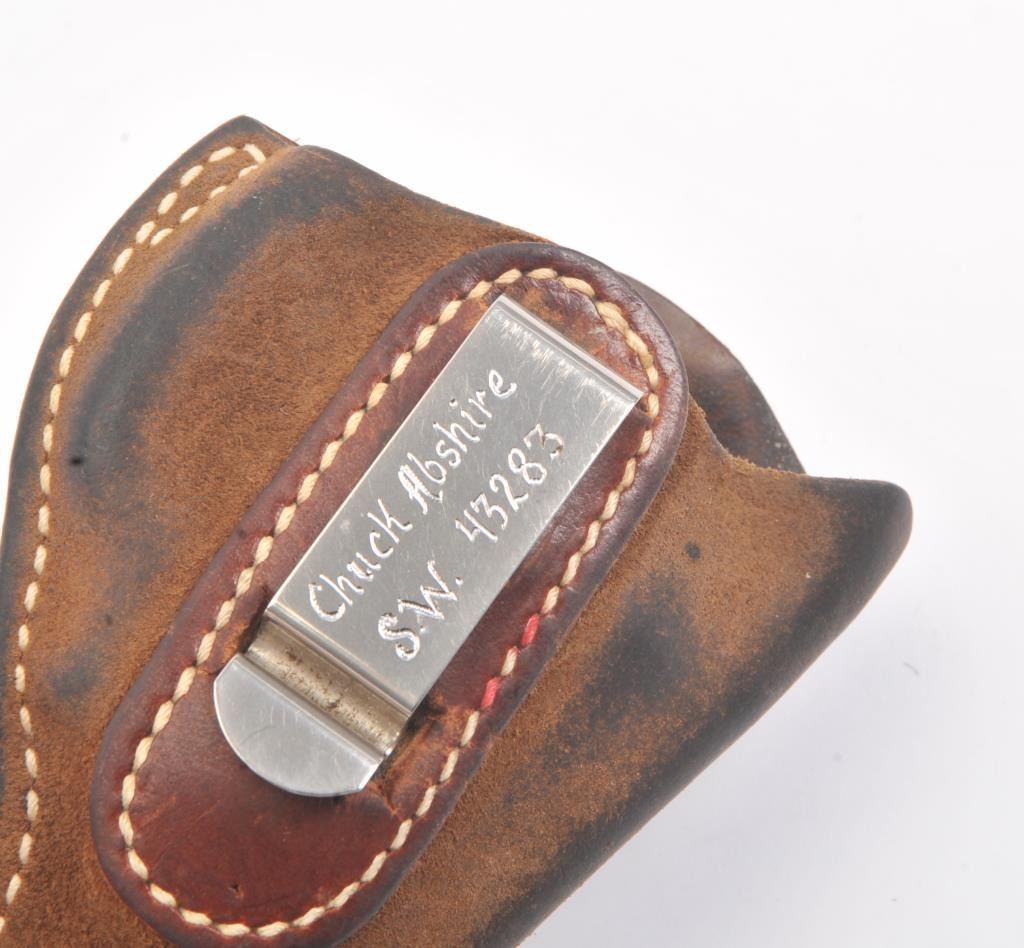 Smith & Wesson Model 38 No Dash Air Weight double action revolver, .38 Special caliber, Serial #43283. The pistol is in fine overall condition with a 2” pinned barrel and shrouded hammer. The pistol retainsapproximately 90% of the blue finish with a faint drag line on the cylinder and loss of finish at the muzzle. The hammer and trigger show muted case hardening. The checkered wood after-market combat grips are in verygood condition with sharp checkering, showing little use. The bore is good, the action is crisp and the markings are sharp. The lot includes a suede leather ITP holster with the consignor’s name and pistol serial number on the back. Est.: $350-$700. (PPT/Modern).
