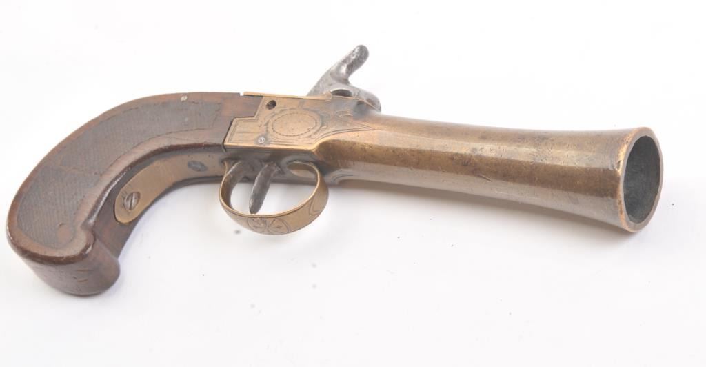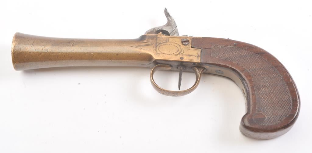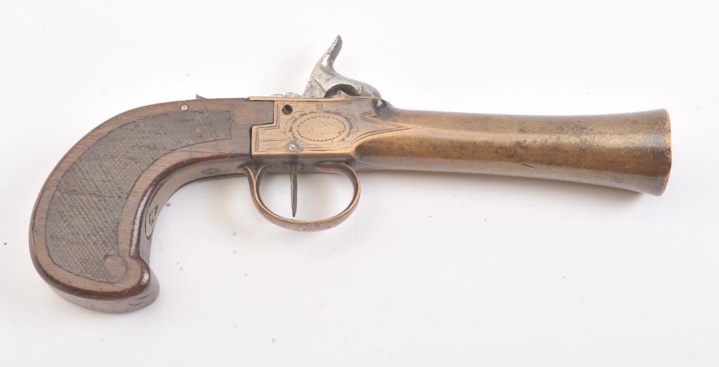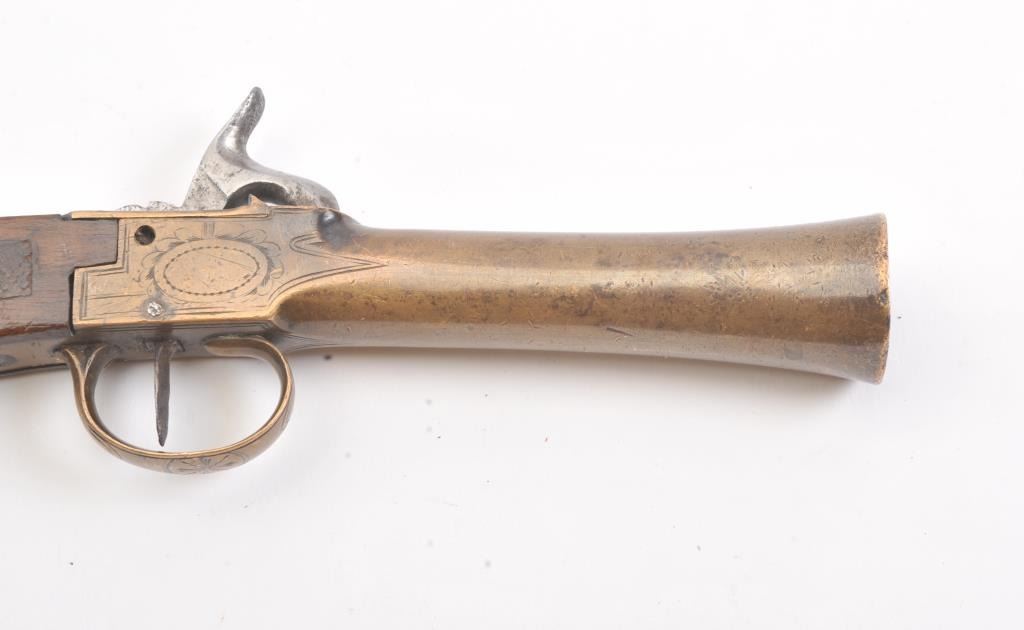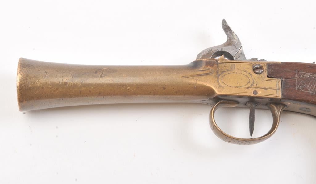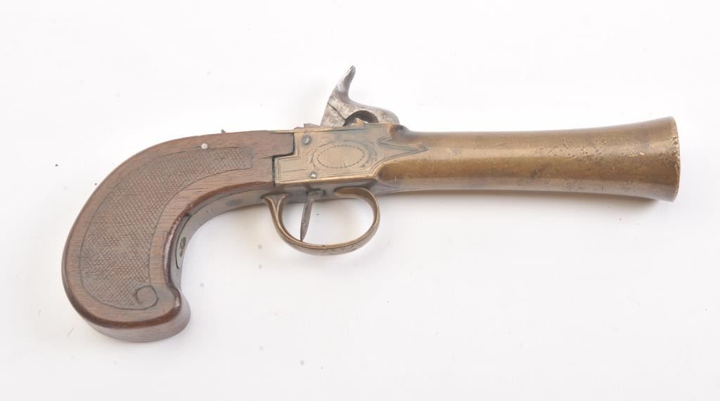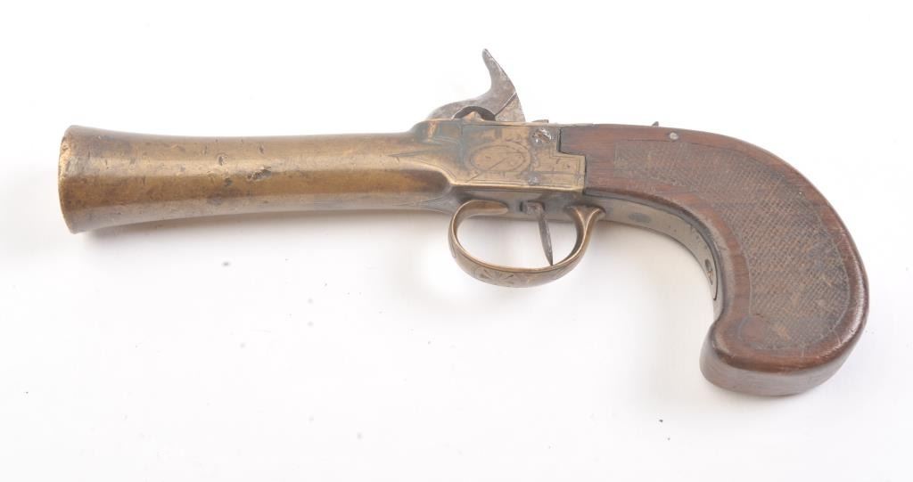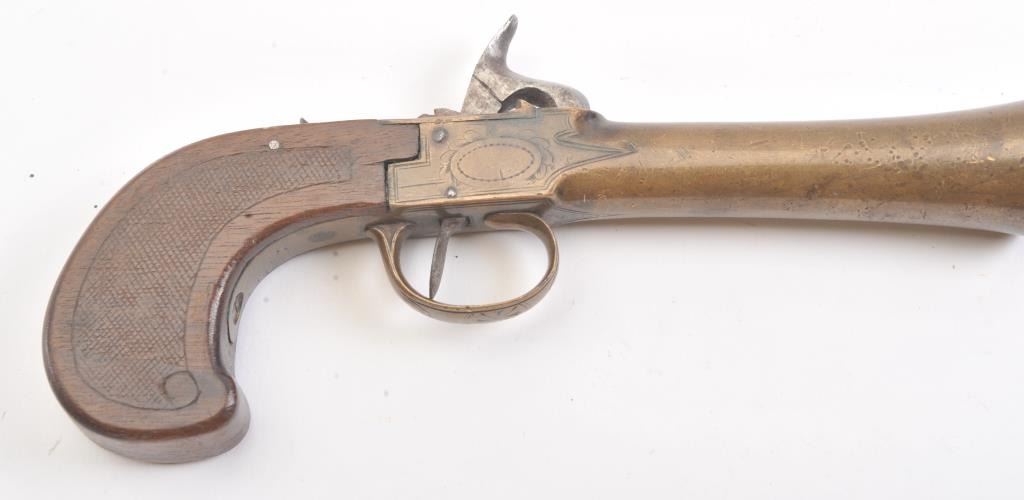 Pair of percussion blunderbuss pistols with brass barrels and frames circa Mid-19th century. Measures 8 1/2" overall with the barrels flared to 1" across inside dimensions of barrel. Nice styling and probably Frenchbut no maker's name or proofs. The condition is good and the brass is uncleaned with nice patina. The stocks are good with minor wear to the checkering. The nipples are "Battered" from firing and use. A nice pair ofblunderbuss. (Antique) Est.: $600-$1200