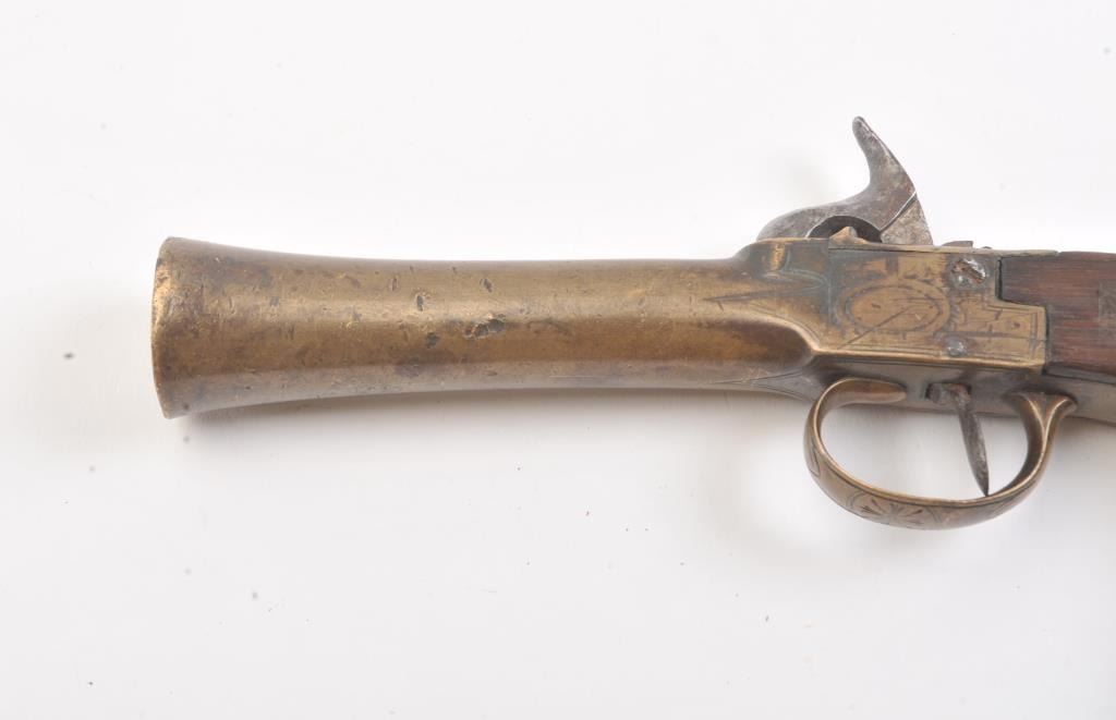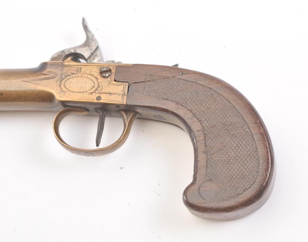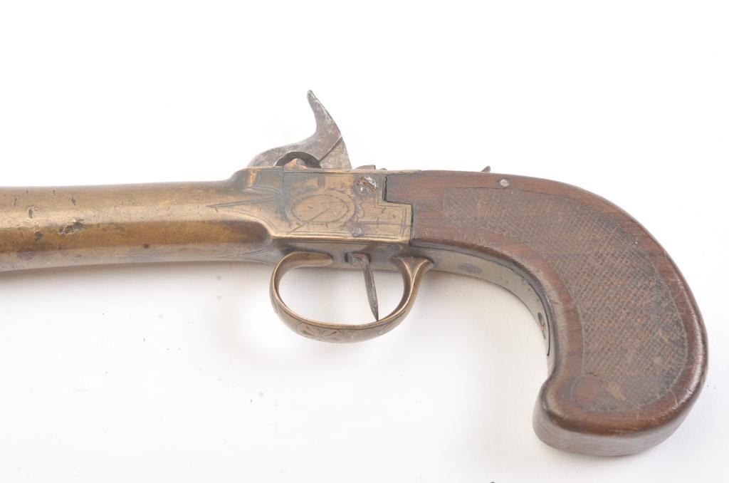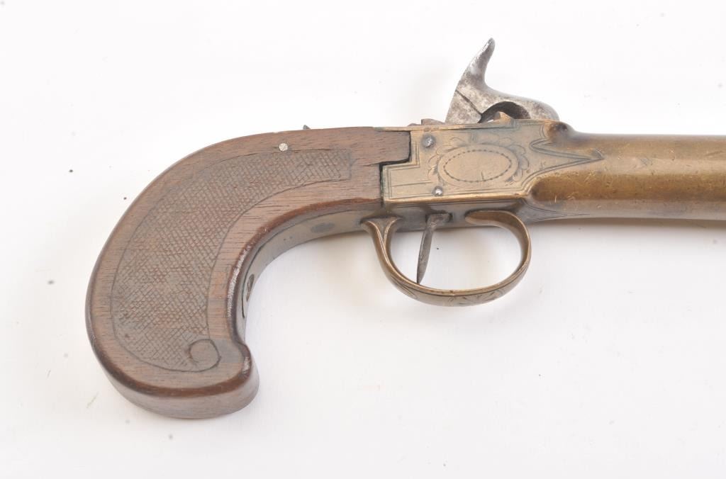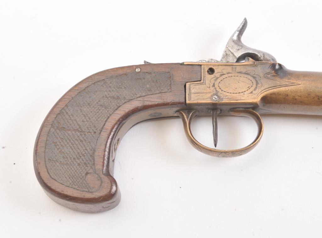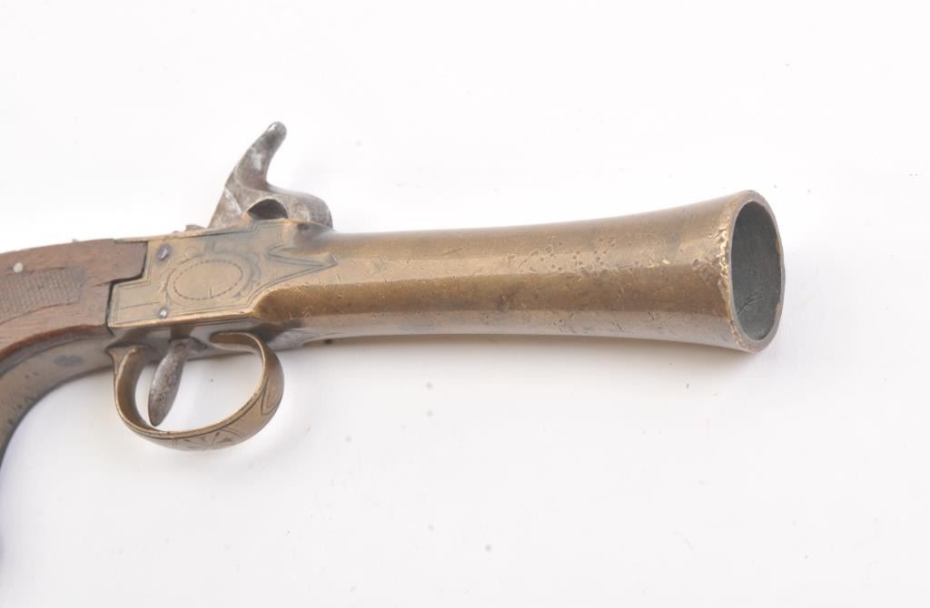 Pair of percussion blunderbuss pistols with brass barrels and frames circa Mid-19th century. Measures 8 1/2" overall with the barrels flared to 1" across inside dimensions of barrel. Nice styling and probably Frenchbut no maker's name or proofs. The condition is good and the brass is uncleaned with nice patina. The stocks are good with minor wear to the checkering. The nipples are "Battered" from firing and use. A nice pair ofblunderbuss. (Antique) Est.: $600-$1200