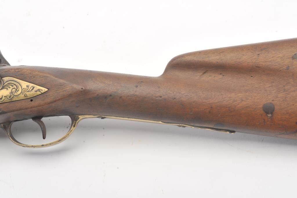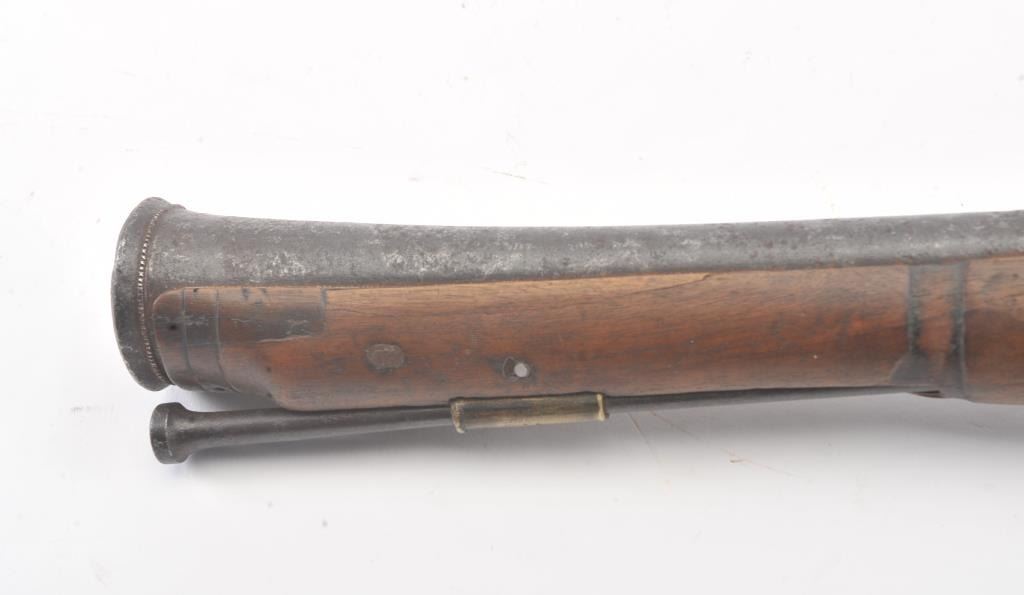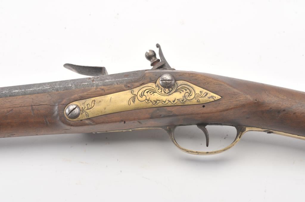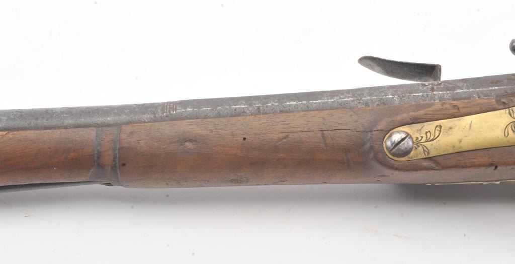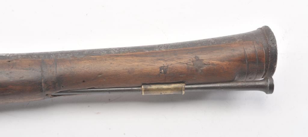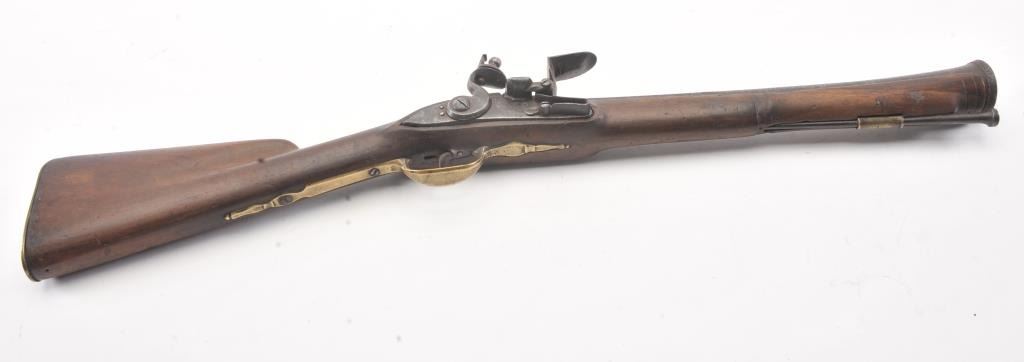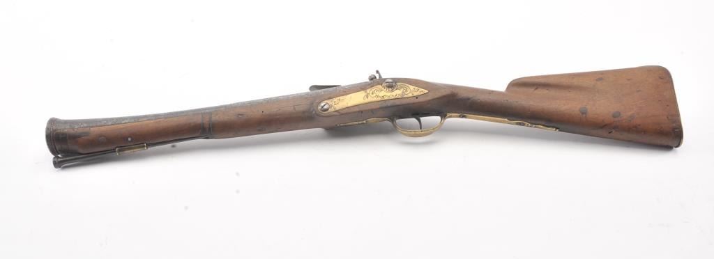 Southern European flintlock blunderbuss with hall marked iron barrel and early lock circa 1720-1760. Measures 31 1/2" overall with a 16 1/2" iron barrel flaring to 1 1/2" across the inside dimensions of muzzle with thickwalls and cannon ring at the mouth. Deep and well struck mark of angel or lady with bow and indecipherable maker's mark that shows crown and is likely Spanish or possibly Italian. Simple brass mounts with lightengraving on the side plate. Period ramrod. The action works well. The stocks are good with minor losses and imperfections. Light to heavy pitting on the barrel. A nice and early blunderbuss. (Antique) Est.:$1200-$1800